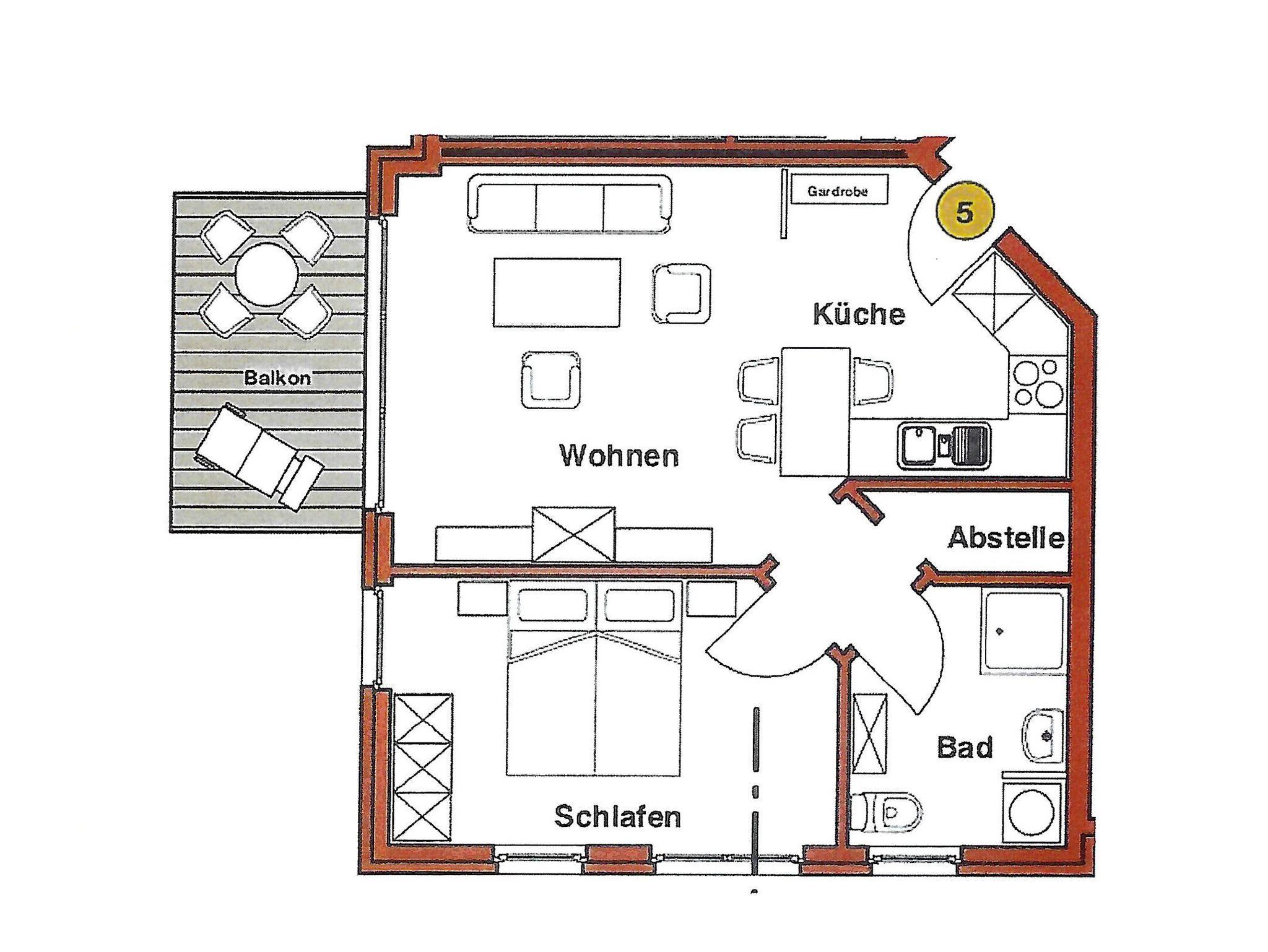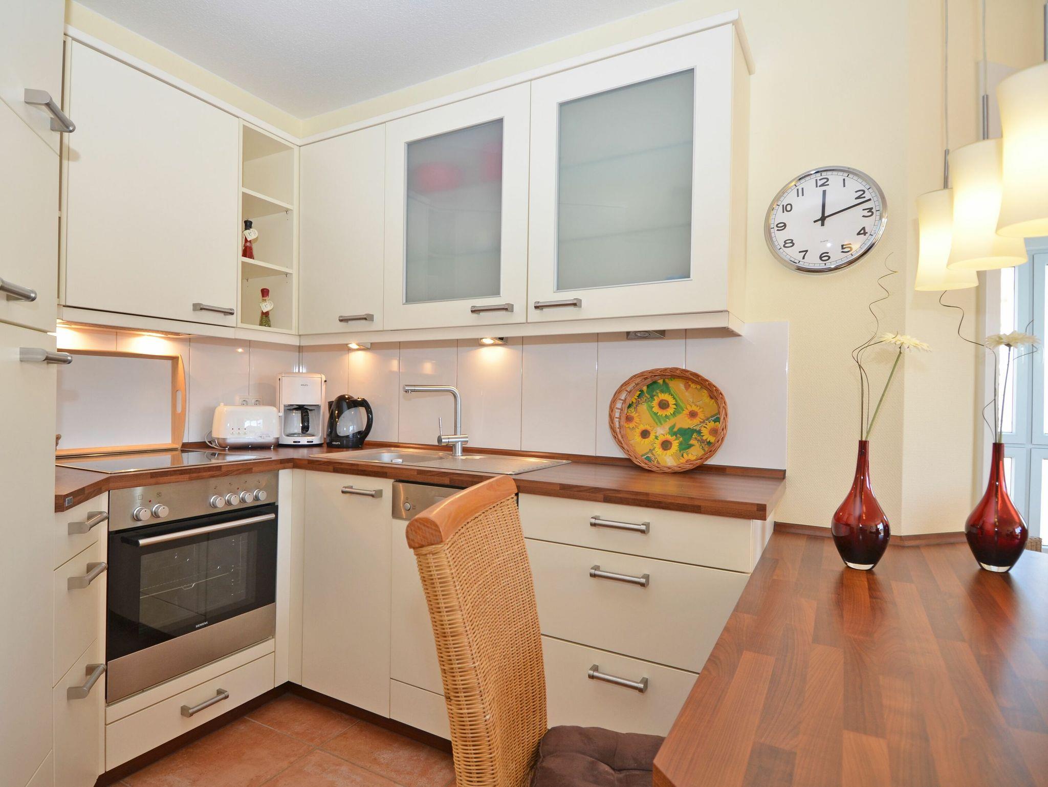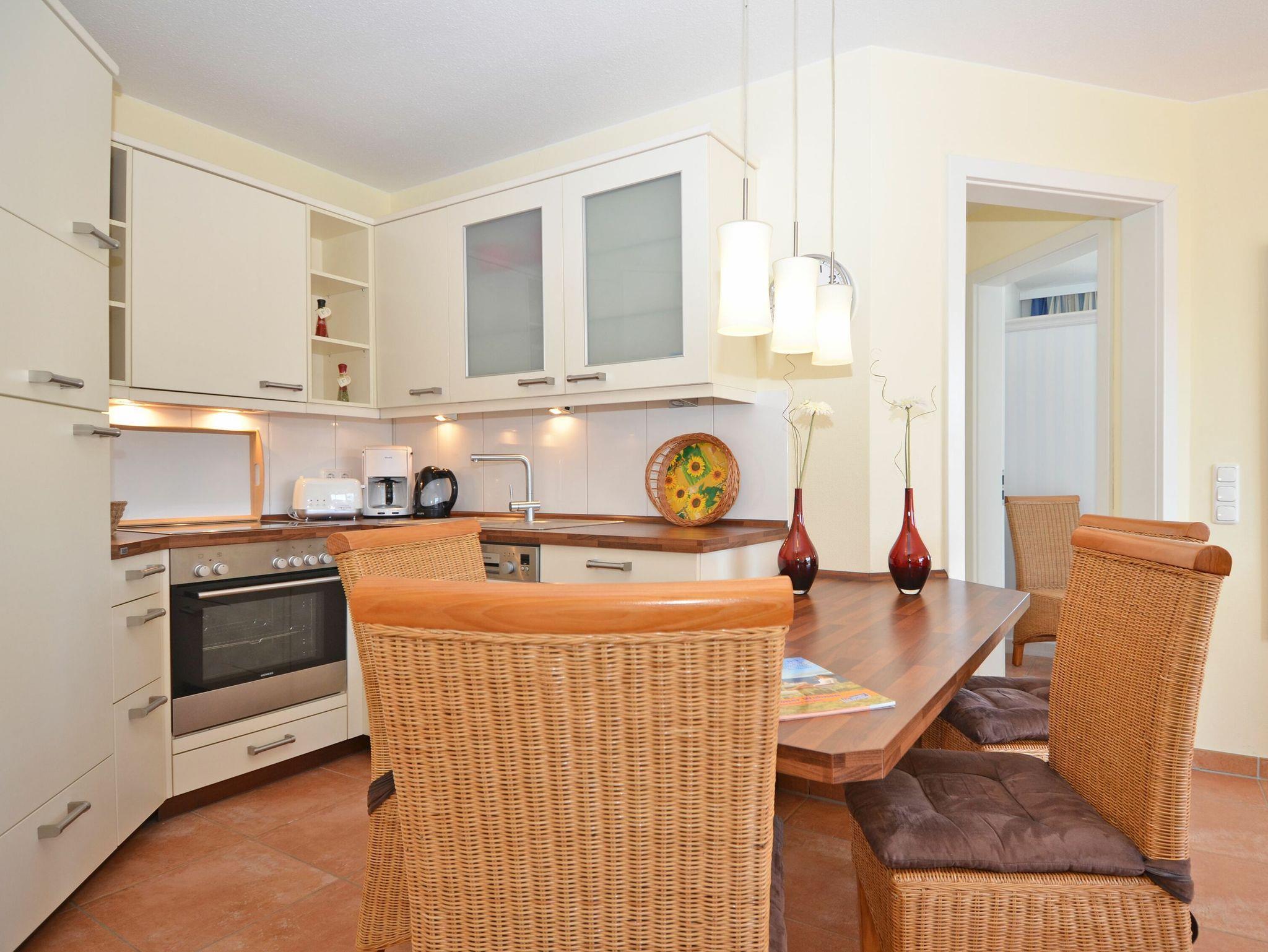Die schöne 2-Zimmer Ferienwohnung ?Rügenglück? im Haus Möwe verfügt über ca. 50 m² Wohnfläche und befindet sich in der 1. Etage, welche Sie bequem mit dem Fahrstuhl erreichen können. Sie besticht durch eine gut durchdachte Raumaufteilung und bietet Platz für max. 2 bis 3 Personen. Die Nichtraucherwohnung ist mit viel Liebe zum Detail eingerichtet. Sie verfügt über einen geräumigen Wohnraum mit einer bequemen Schlafcouch (Aufbettungsmöglichkeit für 3. Person, 1,60m x 2,00m), zwei Sesseln mit Couchtisch, einer Stehlampe, einem Highboard, einem Sideboard mit Smart-TV, einem DAB-Radio, einer Stereoanlage mit CD-Player, WLAN?Anschluss und einem DVD-Player. Eine Küchenzeile ist im Wohnbereich harmonisch integriert. Die Küchenzeile ist mit einer Spülmaschine, einer Mikrowelle, einem Kühlschrank, einem Gefrierfach, einem 4 Zonen-Cerankochfeld, einem Backofen, einem Mixer, einem Toaster, einem Wasserkocher, einer Kaffeemaschine und diversem Kleininventar ausgestattet. Ein angrenzender Esstisch komplettiert den Bereich. Auf dem bestuhlten Balkon, welchen Sie vom Wohnbereich erreichen, mit Sonnenschirm und Südost-Ausrichtung können Sie beim gemütlichen Frühstück die Morgensonne und einem kleinen Blick zum Selliner See genießen. Im Schlafzimmer garantiert ein großes Doppelbett in Komforthöhe (1,80 m x 2,00 m), verstellbaren Lattenrosten, Nachttischablagen mit Beleuchtung und einer Kleiderablage für guten Schlaf. In einem großen Kleiderschrank können Sie Ihre Garderobe problemlos verstauen. Koffer u.a. können in einem Abstellraum neben dem geräumigen Duschbad abgestellt werden. Hier finden Sie unteranderem auch ein Bügelbrett, ein Bügeleisen, einen Wäscheständer mit Klammern sowie Reinigungsutensilien. Das Tageslicht-Bad verfügt über eine Fußboden- und Handtuchheizung, einem WC, einem Waschplatz, einer Dusche mit flachem Einstieg, einem Fön sowie einem Kosmetikspiegel. Alle Fenster sind bodentief und mit Isolierverglasung versehen. Mit den Vorhängen können Sie die Räume verdunkeln. Im Gemeinschafskeller können Sie gegen einen Aufpreis die gemeinschaftliche Waschmaschine und den Trockner nutzen. Die Wertmarken können Sie auf Nachfrage während Ihres Urlaubes erwerben. Ein eigener PKW-Stellplatz Nr. 05 und ein Fahrradraum gehören zur Wohnung und befinden sich in der hauseigenen Tiefgarage (Einfahrtshöhe 2,10 m). Ein Haustier ist gegen einen Aufpreis ein gern gesehener Gast. Die Erstausstattung eines Wäschepaketes (komplette Bettwäsche, 1 Duschhandtuch, 1 kleines Handtuch) können Sie bis 14 Tage vor Anreise gegen einen Aufpreis dazu buchen oder durch eigene ergänzen. Ab 2 gebuchten Paketen erhalten Sie einmalig 1 Geschirrhandtuch und 1 Duschvorleger hinzu.