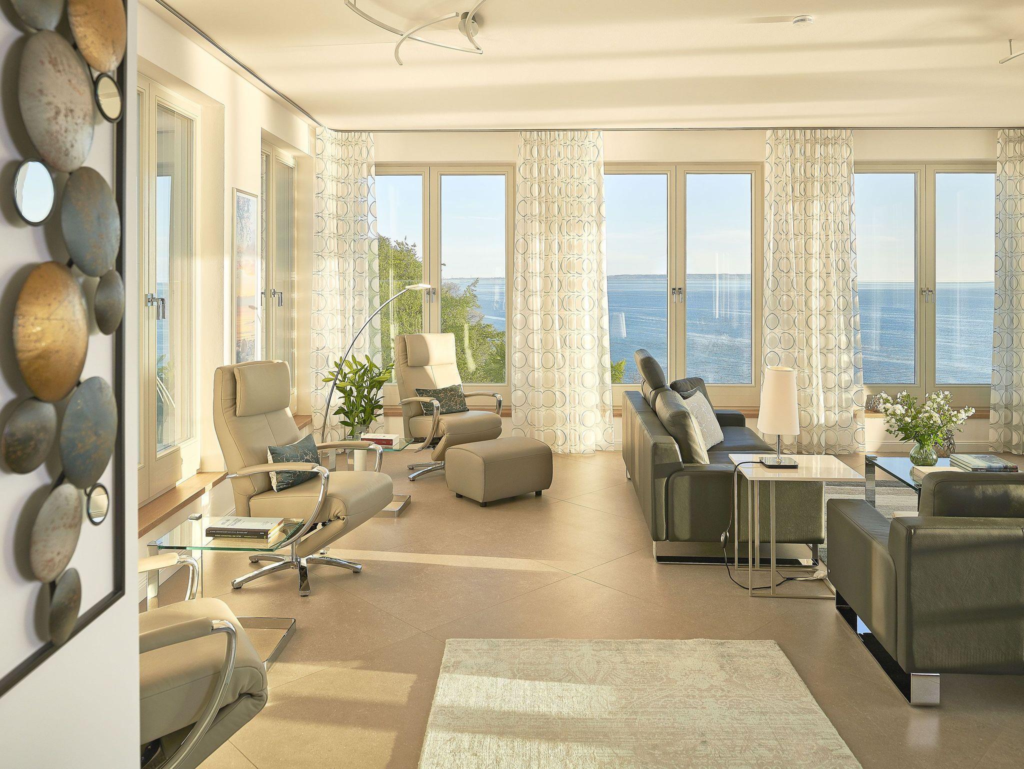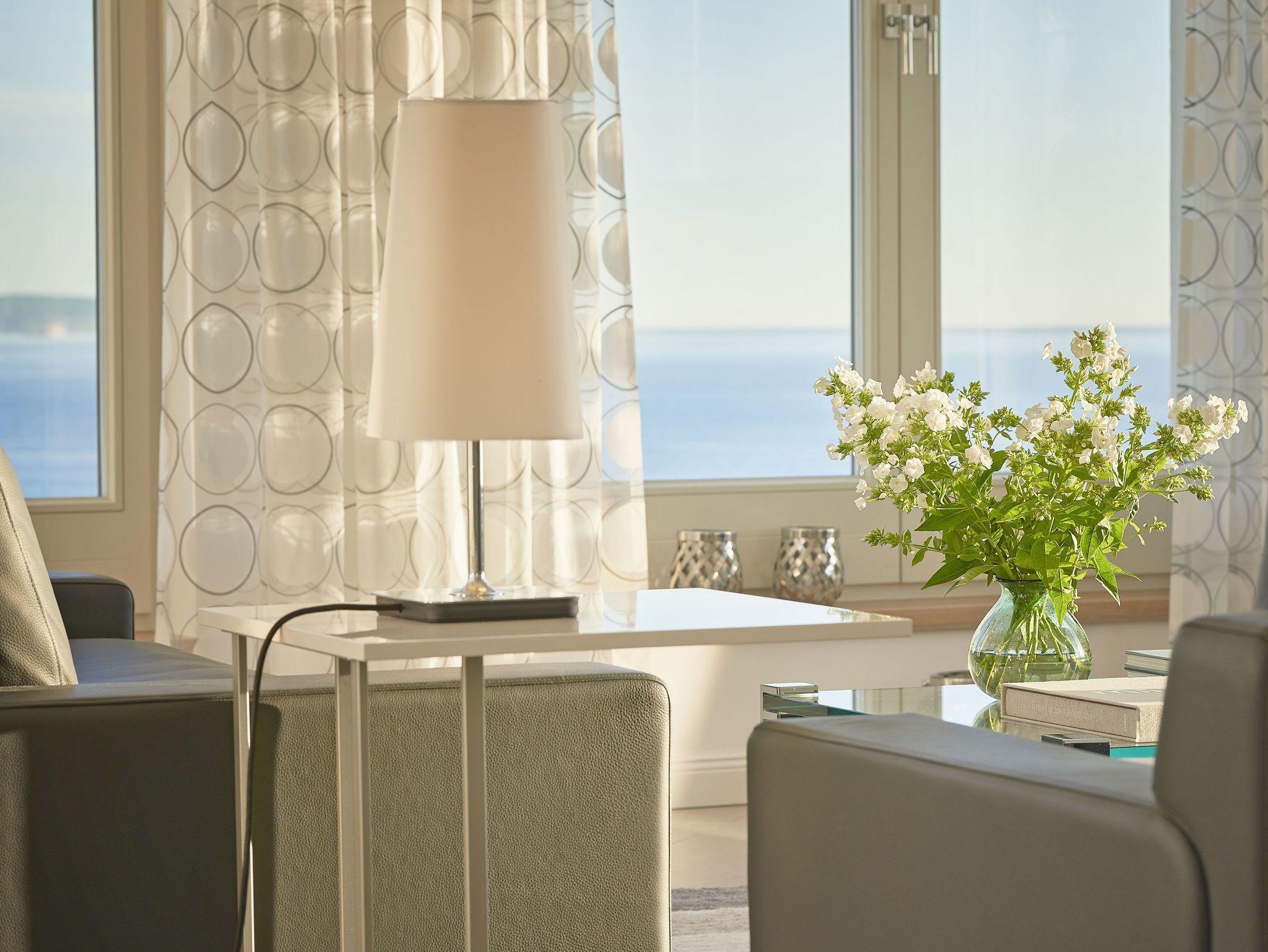 Das Turmzimmer der Meerblick [&] SPA bietet auf 44 m² rundum perfekten Meerblick. In hochwertigen bequemen Polstermöbel genießen Sie den Panoramablick aus dem 5. Stock bis zu den Kreidefelsen und dem Selliner See, weit über die ganze Insel.