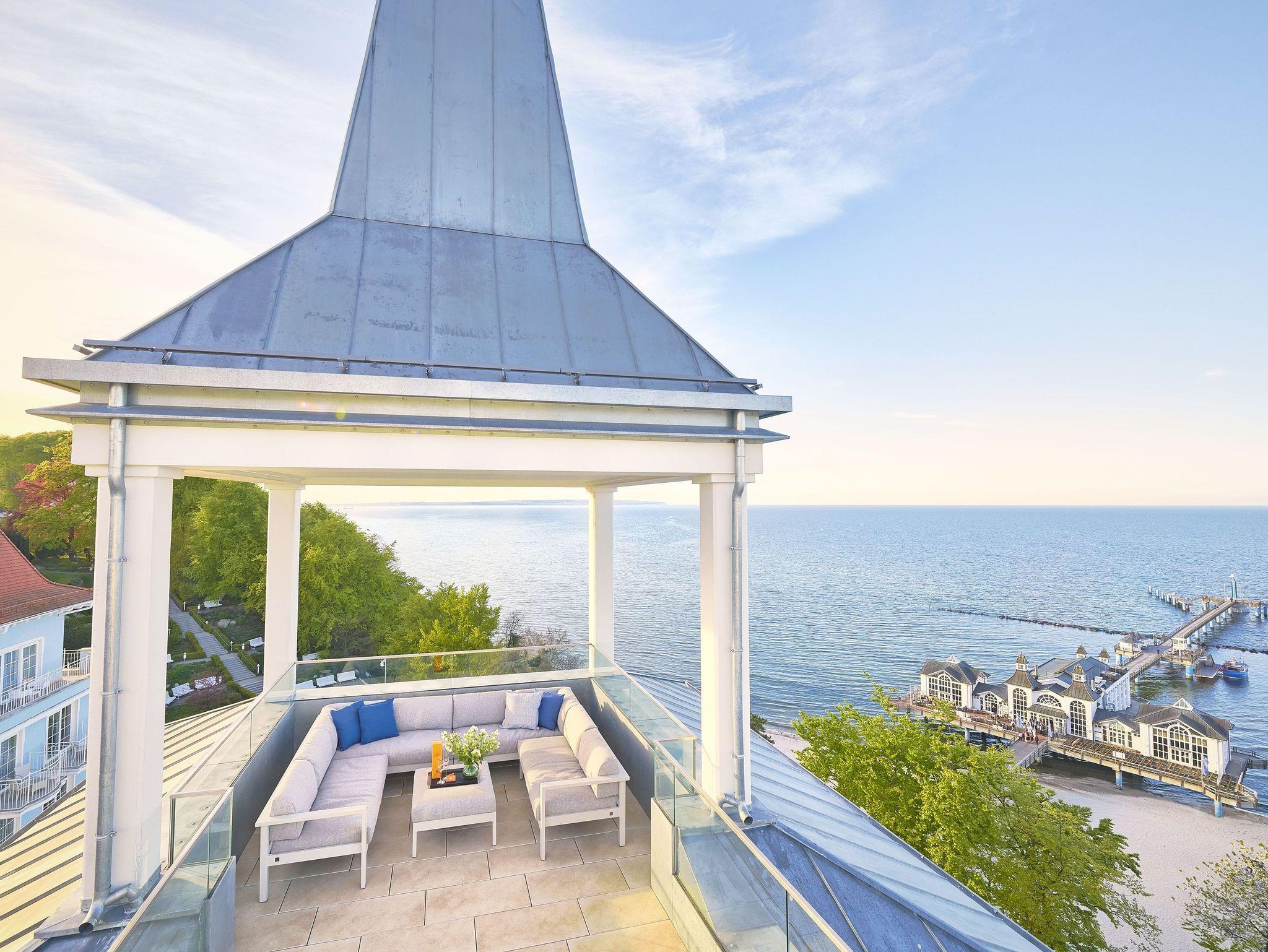 Die Dachterrasse der „Meerblick [&] SPA“ ist ein besonderes Highlight auf ca. 45 m² haben Sie Ihr eigenes Meerblick Refugium. Unter der Turmspitze stehen für Sie bequeme Loungemöbel bereit, Sonnenliegen laden zum Sonnenbaden ein.