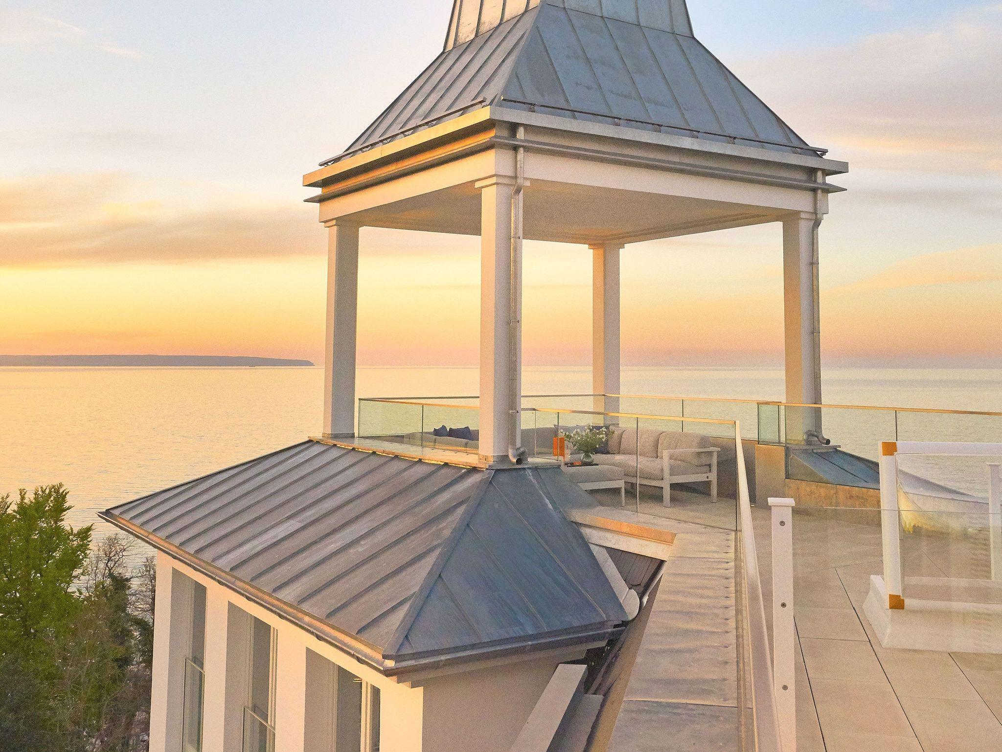 Von Esszimmer gelangen Sie mit einer Treppe auf die eigene Dachterrasse. Diese Dachterrasse ist einmalig, auf 47 m² genießen Sie den perfekten Meerblick weit über die Ostsee und die Insel Rügen. Auf dem überdachten Turmplatz finden Sie bequeme Loungemöbel auf denen Sie den Sonnenauf- und Sonnenuntergang genießen können.