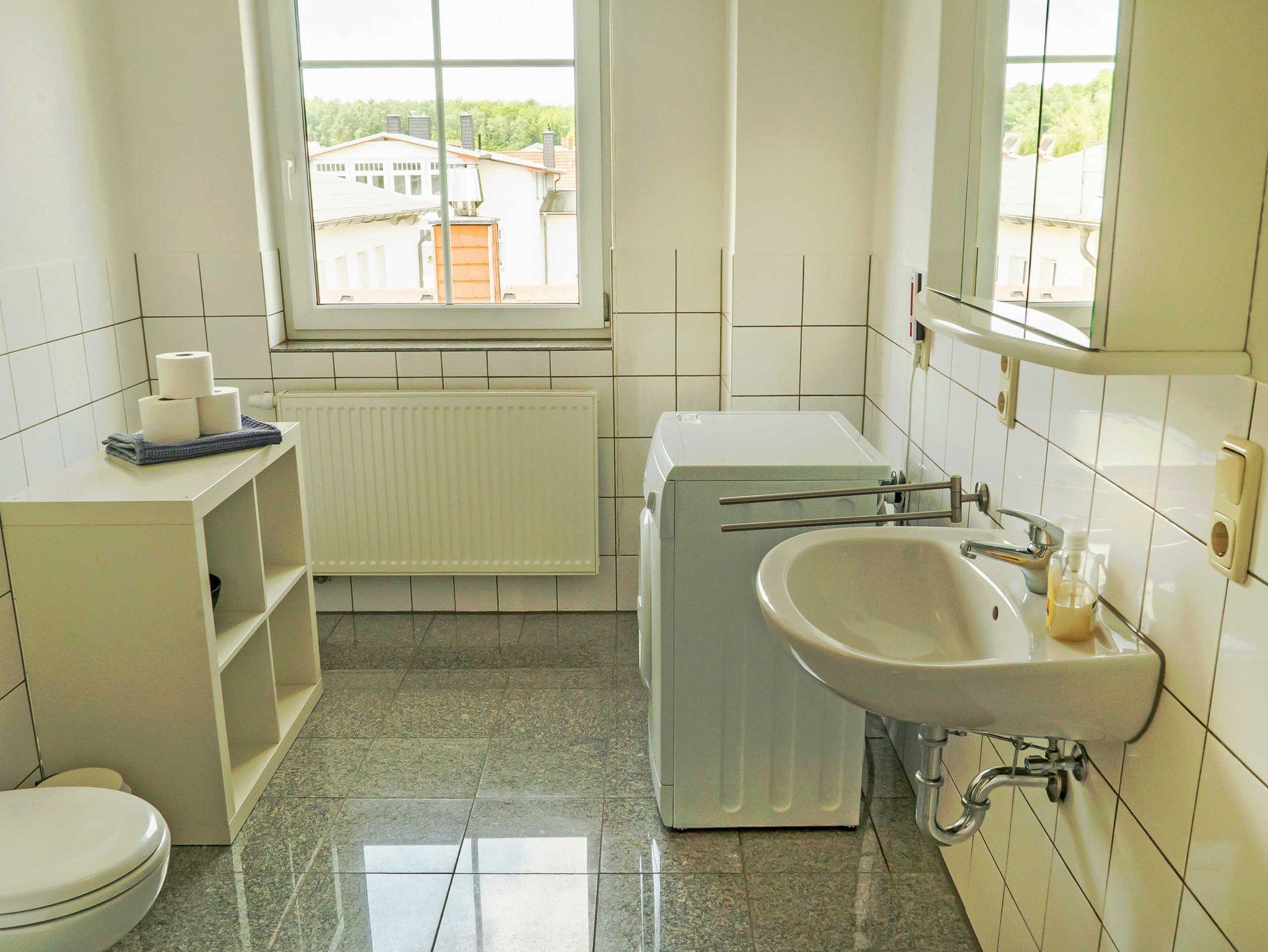 Das moderne Bad ist mit Waschbecken, Spiegel, Föhn, Dusche, WC und Waschmaschine ausgestattet.