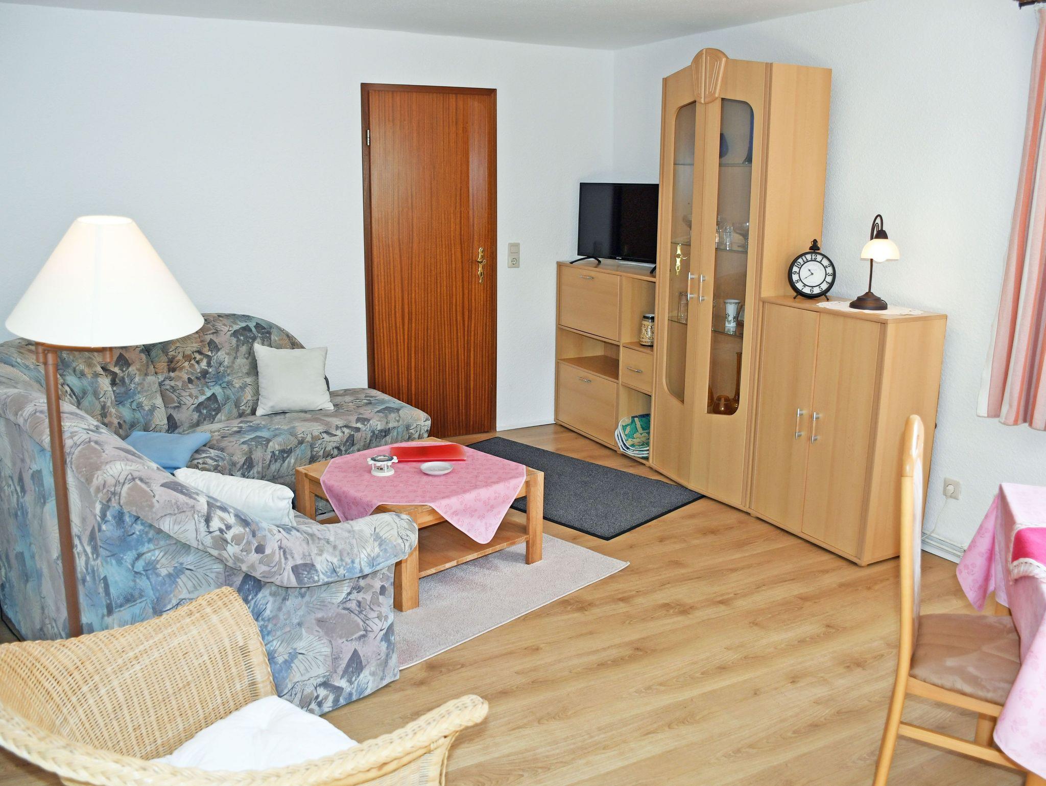 Im Wohnraum befinden sich eine Sitzcouch mit Tisch und Sessel, ein modernes Flachbild-TV-Gerät und eine Schrankwand. Durch das große Türfenster zur Terrasse haben Sie einen sehr schönen Ausblick in den Garten und die umliegende Natur.