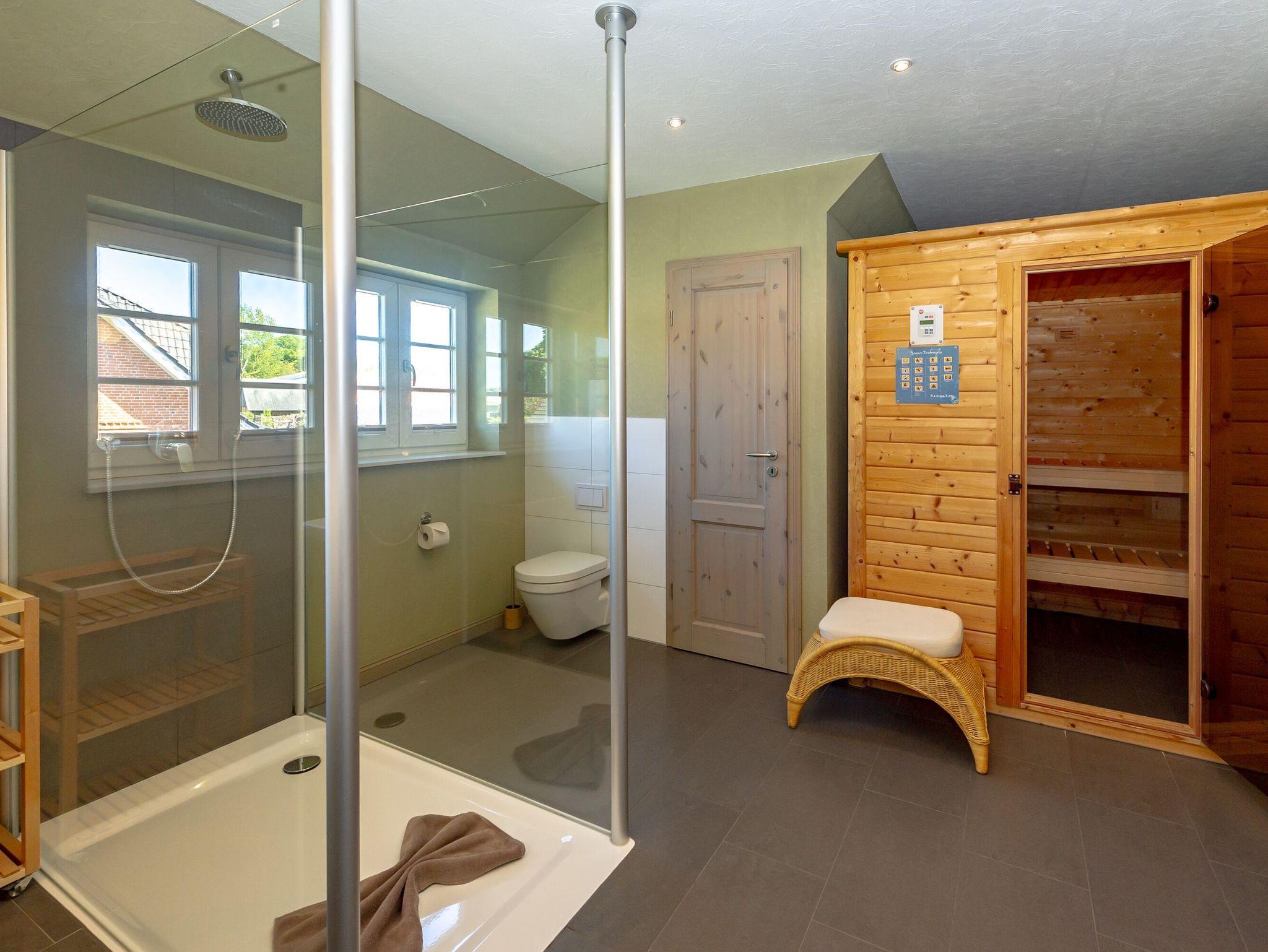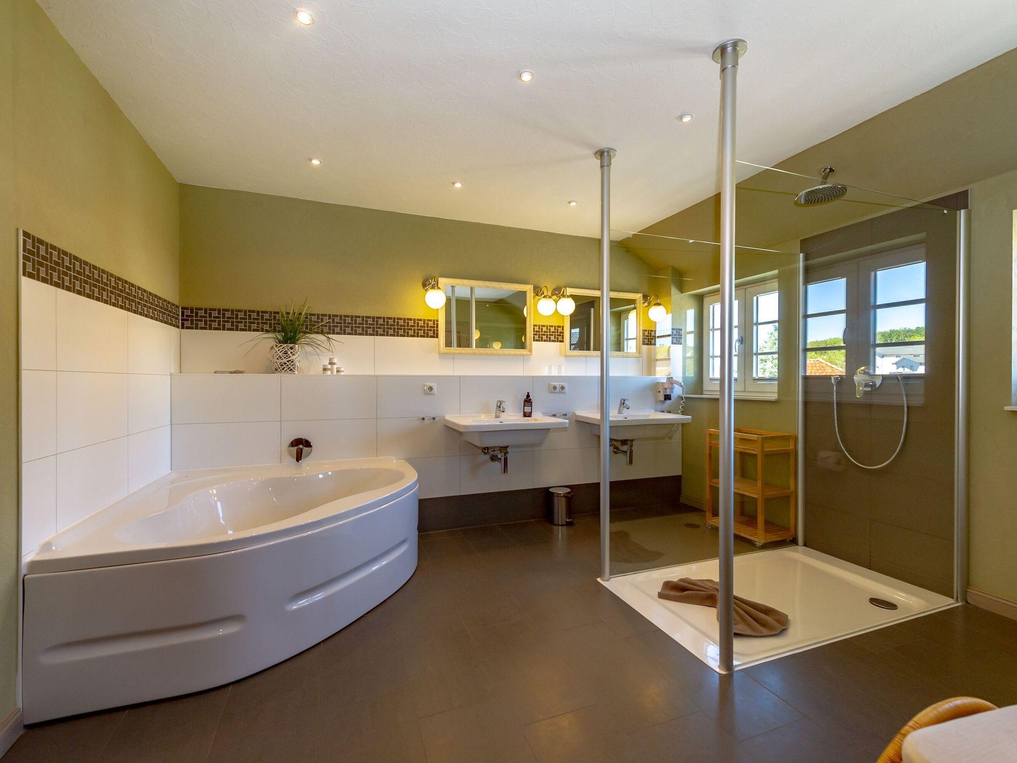 Bad mit ebenerdiger XXL-Dusche, Eckbadewanne, Sauna, Doppelwaschtisch, WC, Handtuchtrockner und Fußbodenheizung