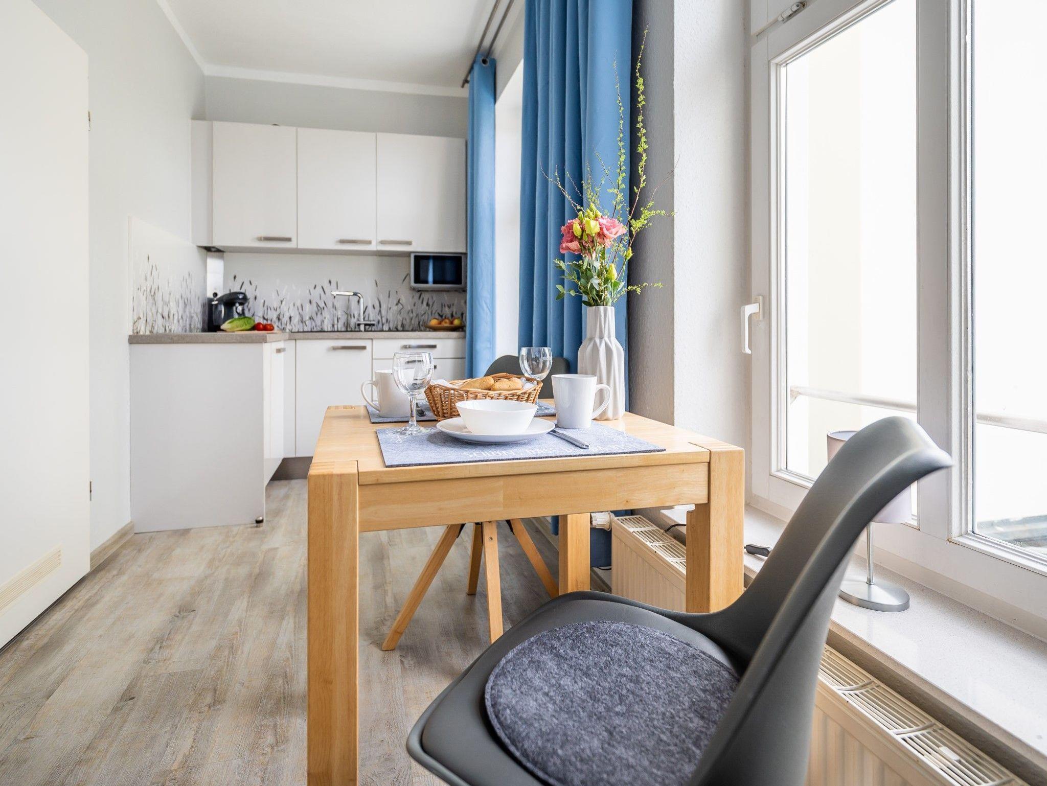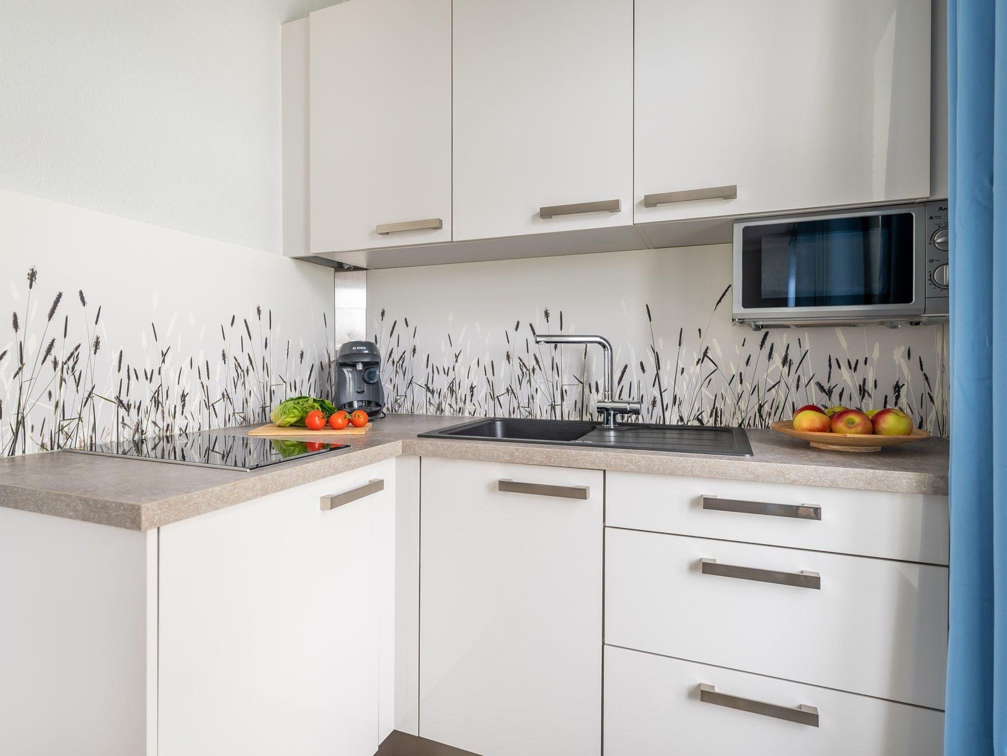 • komplett eingerichtete Miniküche mit Mikrowelle und Essplatz
