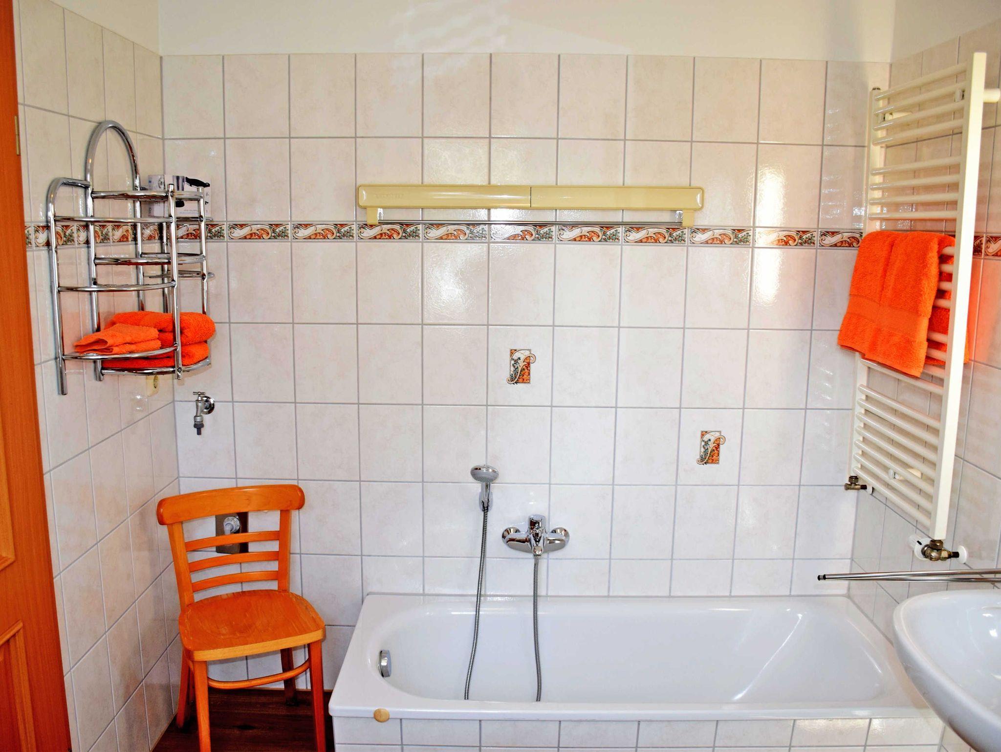 Das große Bad mit Tageslicht verfügt über Dusche und Badewanne. Handtuchwärmer, Fön sowie Waschbecken und WC.