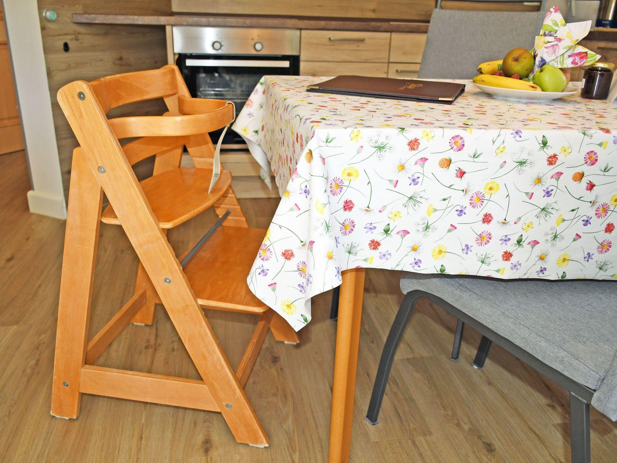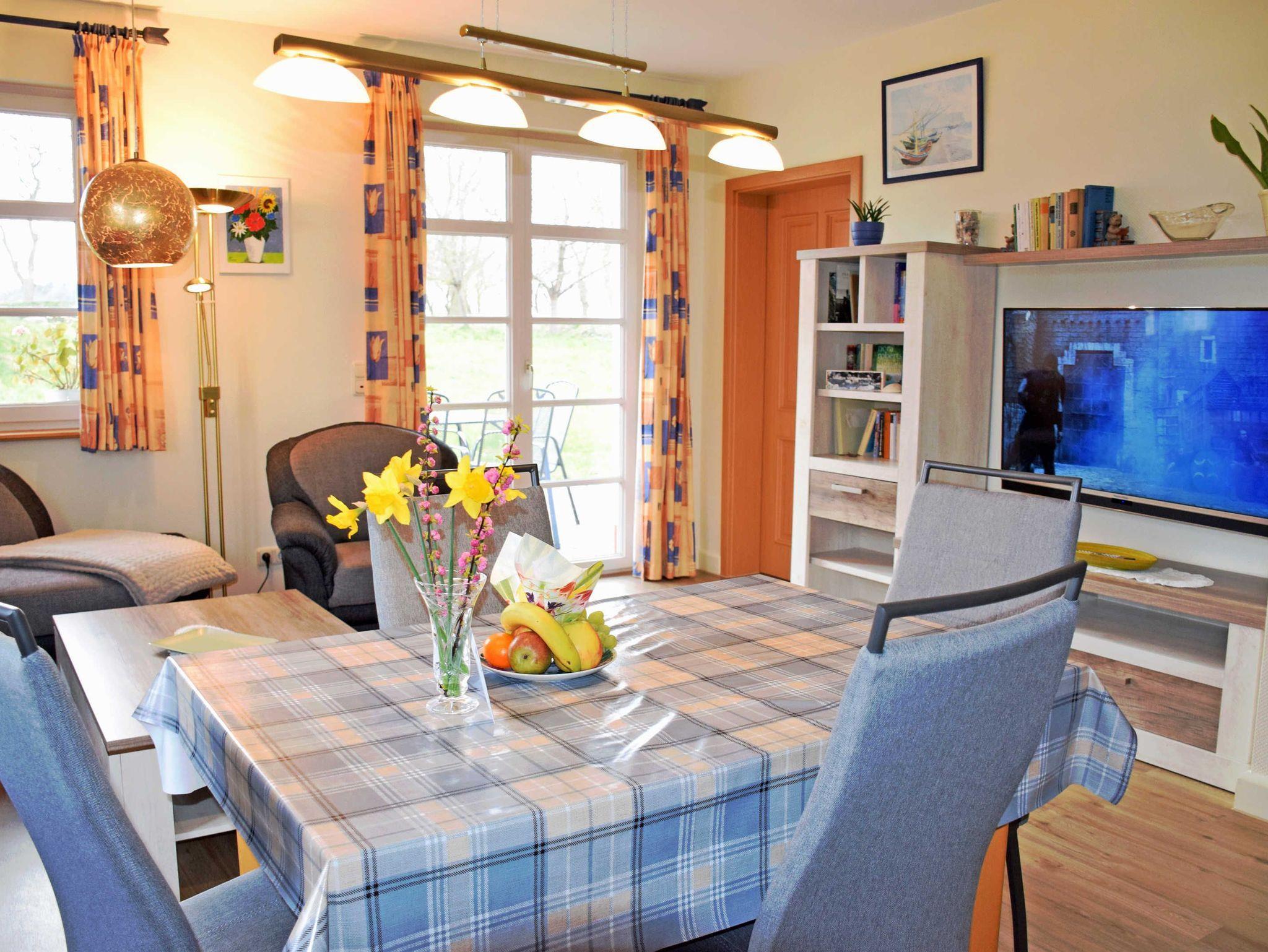 Es verfügt über ein Wohnzimmer mit Flachbild-TV, Sitzcouch mit Sessel und Tisch, Esstisch mit Stühlen und eine Küchenzeile mit Cerankochfeld (4 Felder), Backofen, Geschirrspüler, Kühlschrank, Gefrierschrank und Mikrowelle.