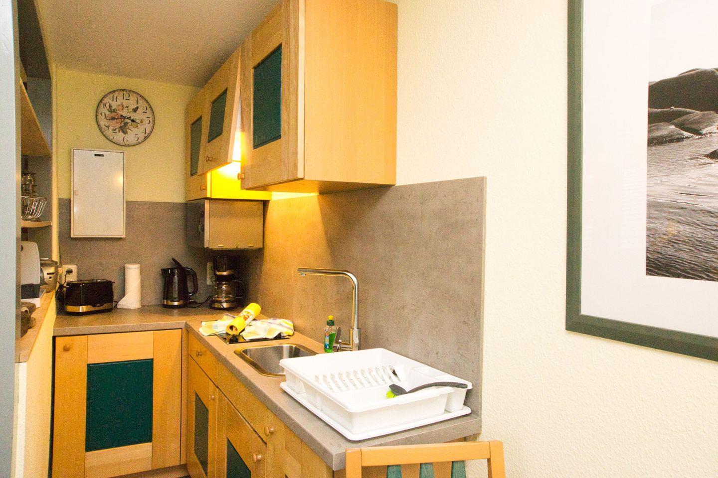 KÜCHE // offene Küchenzeile, 2-Platten Herd, Kühlschrank mit Gefrierfach, Minibackofen, Mikrowelle, Toaster, Wasserkocher, Kaffeemaschine, reichlich Besteck, Geschirr und Küchenutensilien ++