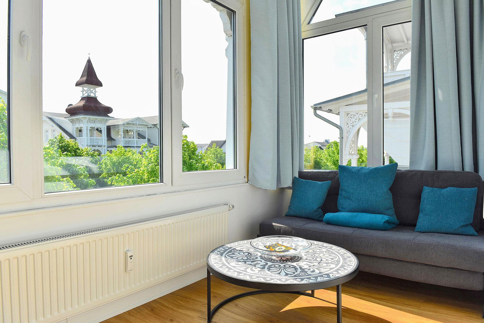 Die 50 qm große Ferienwohnung liegt im ersten Obergeschoss der Villa Meeresgruss und ist für bis zu 4 Personen geeignet. Sie hat einen traumhaft schönen Wintergarten zur Promenade mit Tagessonne. Ausgestattet mit Einbauküche (inkl. Geschirrspüler), kostenlosem WLAN und SAT-TV, bietet sie ein geräumiges Duschbad sowie ein separates WC mit Handwaschbecken.