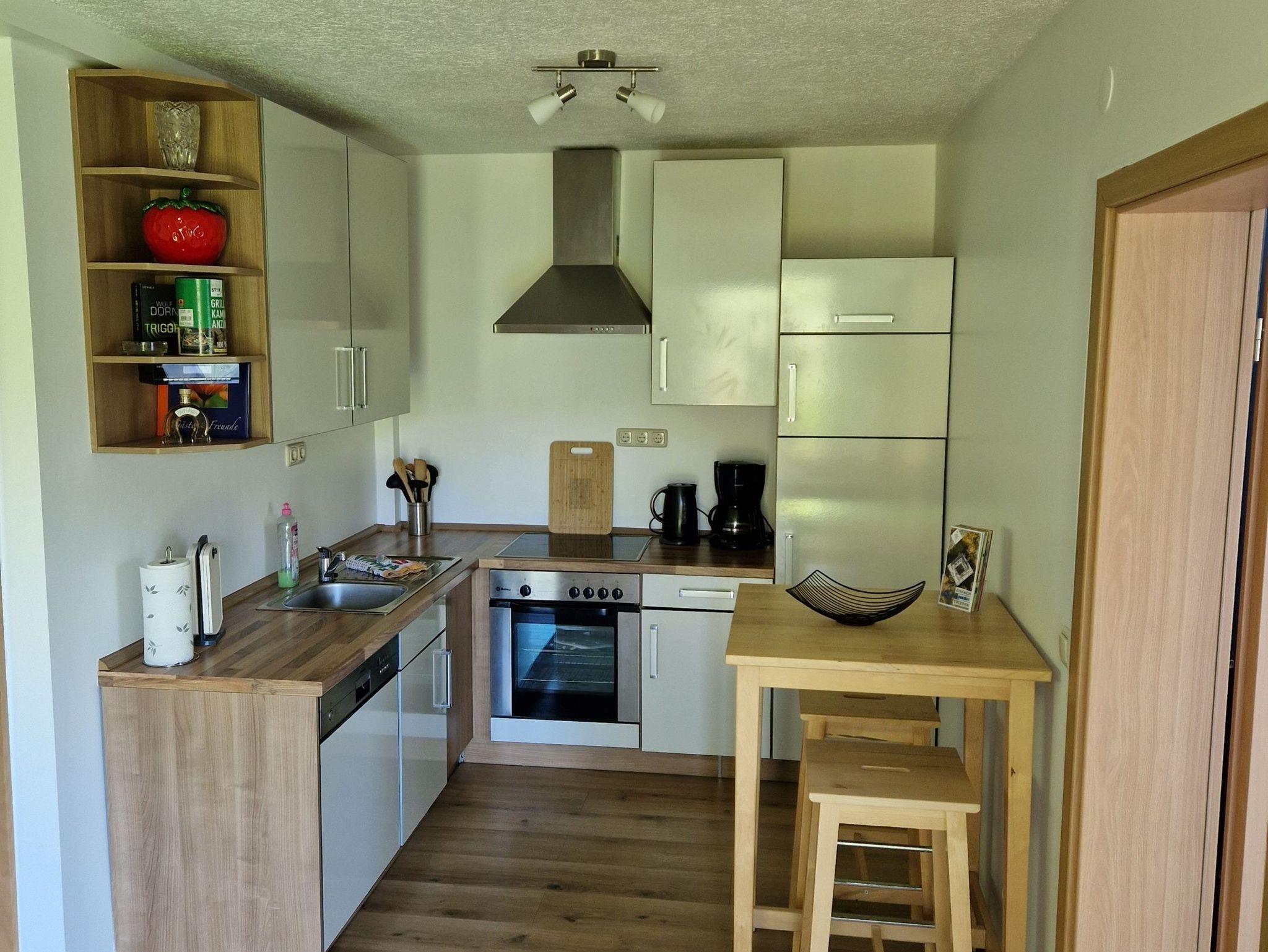Das Wohnzimmer ist mit einer Sitzecke, Fernseher und Kamin (statt Heizung) ausgestattet. Die moderne Küchenzeile verfügt über einen 4-Platten-Ceranherd mit Backofen, Kühlschrank mit Gefriermöglichkeit und Spülmaschine, Kaffeemaschine, Toaster etc. und ist im Wohnzimmer integriert. Das Bad mit Dusche/WC ist vollständig gefliest und mit einer Fußbodenheizung ausgestattet. Im Schlafzimmer befindet sich ein Doppelbett (1,40 m x 2,00 m) und eine Kleiderkommode. Das vorhandene Kinderreisebett oder die Aufbettung kann problemlos im Schlafzimmer aufgestellt werden (maximale Belegung 3 Personen). Die Terrasse und der gesamte Garten kann mitbenutzt werden. Bettwäsche und Handtücher sind bitte vom Gast mitzubringen. Der Parkplatz befindet sich auf dem Grundstück.