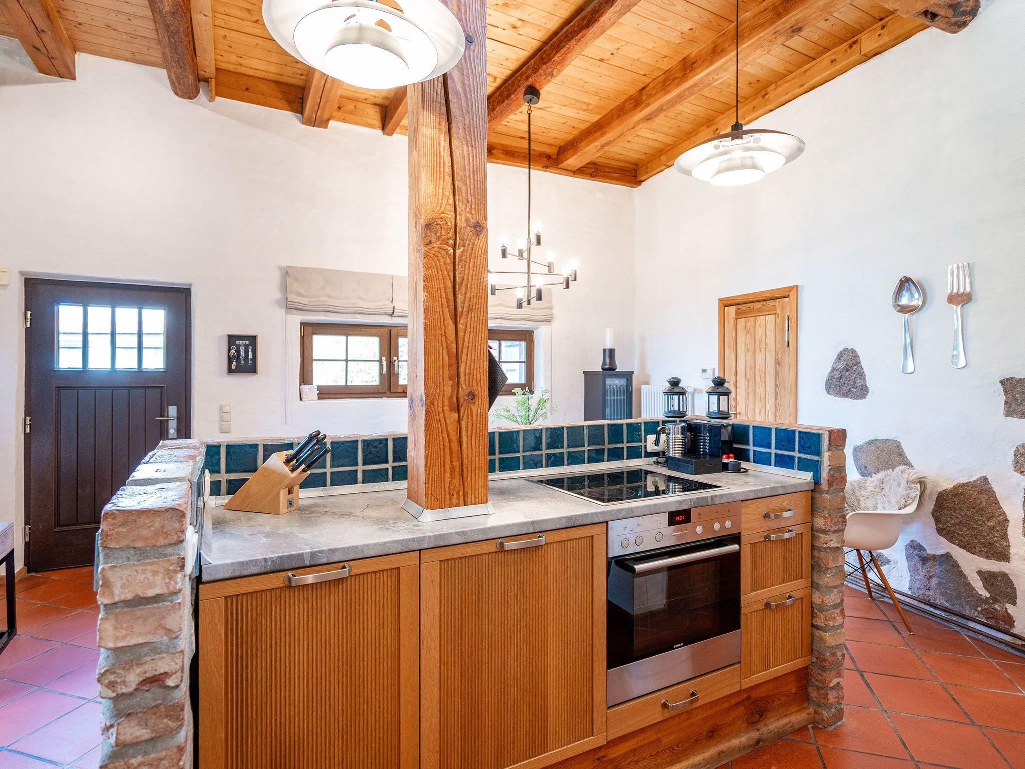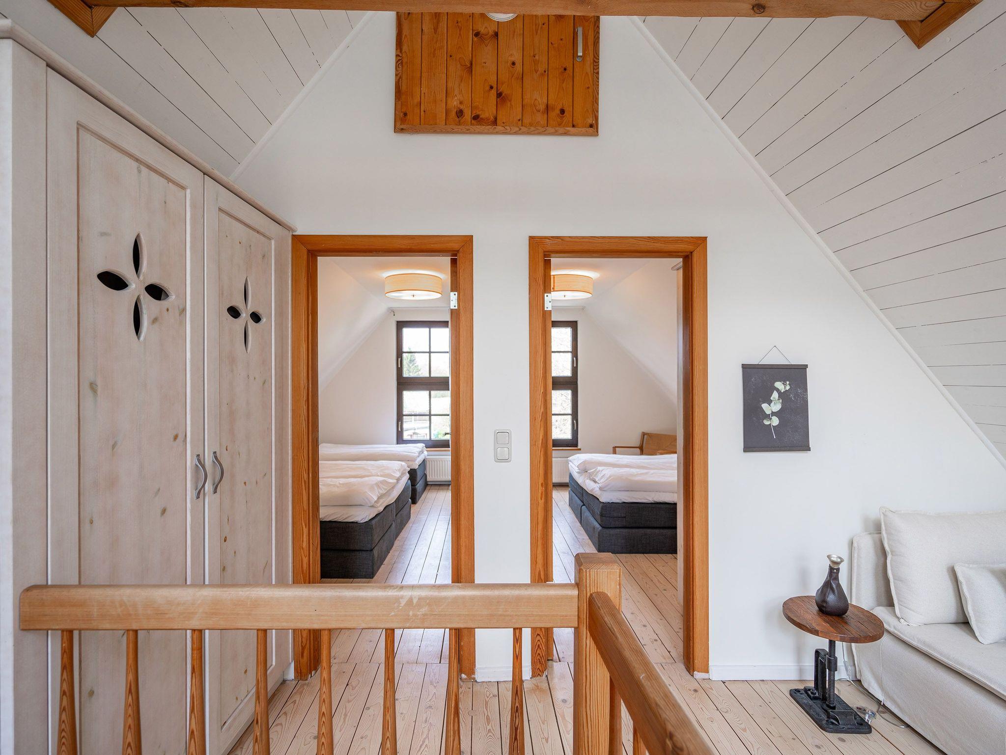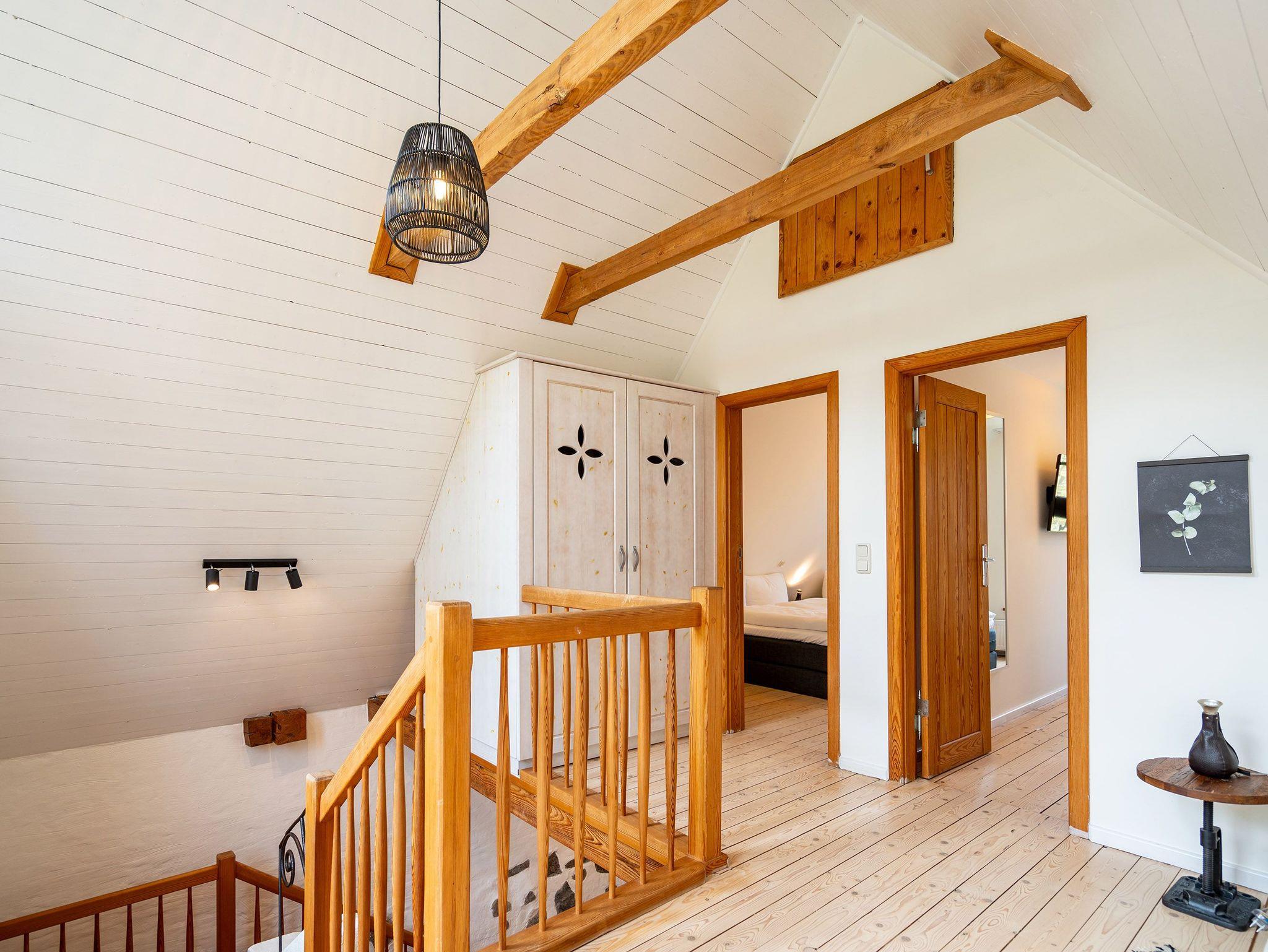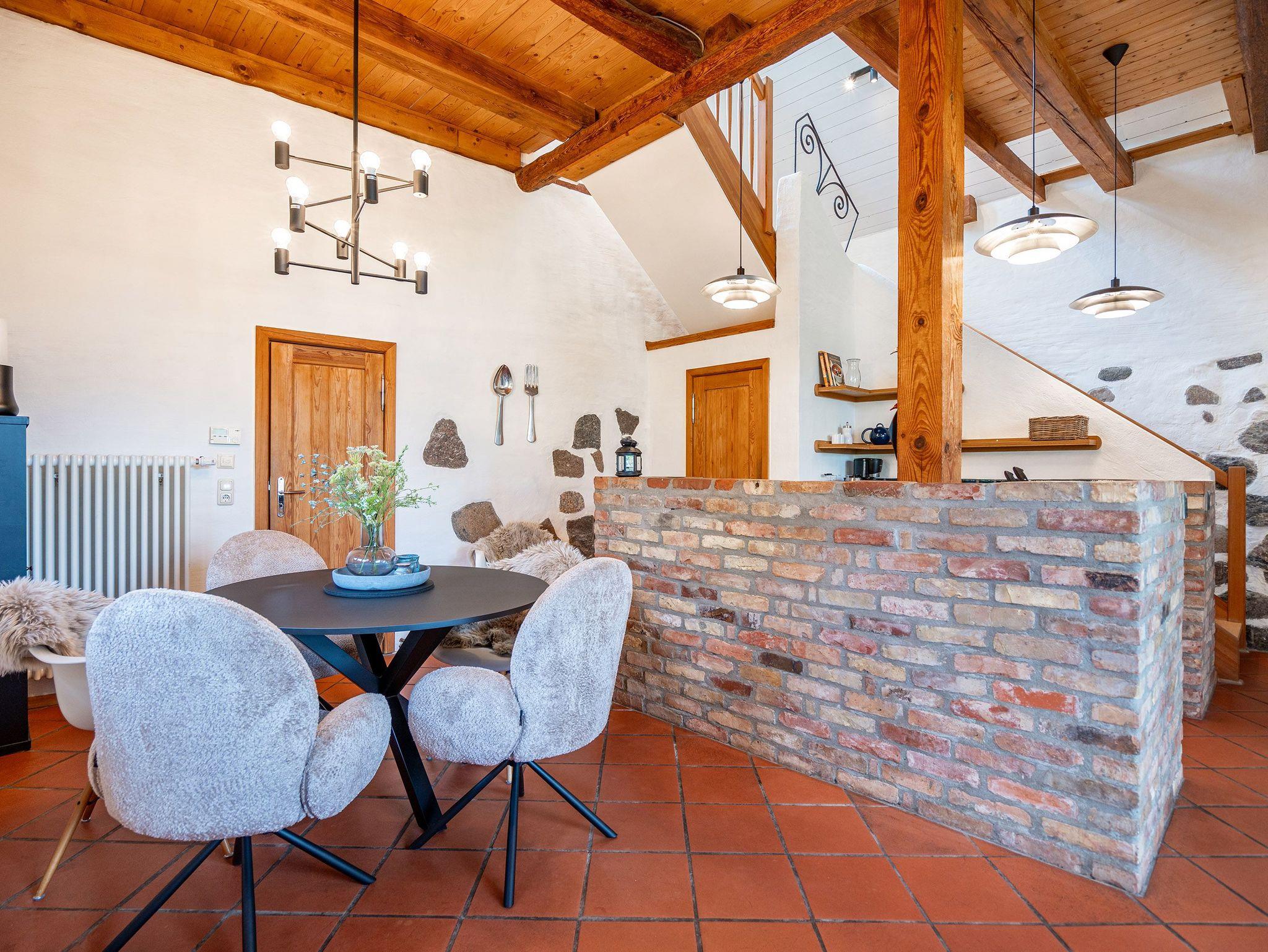Das großzügige, helle Erdgeschoss ist in Wohnbereich, offene Küche, Bad und Sauna unterteilt. Überall lassen sich hier die alten Feldsteine der ehemaligen Scheune entdecken. Vor dem kuschligen Kamin macht man es sich auf dem Sofa gemütlich. Die offene Küche ist mit allem Komfort ausgestattet, der angrenzende Essplatz sorgt sicher für gesellige Runden, nicht nur beim Essen. Durch einen schwenkbaren Smart-TV müssen Sie auch von hier nicht auf Ihr Lieblingsprogram verzichten. Nach dem Saunagang erfrischt man sich im Bad mit Badewanne. Im Obergeschoss erwarten Sie zwei gemütliche Schlafzimmer mit Boxspringbetten (1x 1,60m und 1x 1,60m + Einzelbett / zusätzlich Flat-TV) die einen erholsamen Schlaf garantieren. Auf der Galerie davor lädt ein gemütlicher Lese- und Spielbereich ein. Und Außen? Ein kleiner Garten, eine Terrasse und eine schöne Holzveranda bieten für jeden Gast einen Rückzugsort zum Erholen im Freien. Auf Wunsch stellen wir für unsere kleinen Gäste ein Kinderreisebett (ohne zusätzliche Matratze [&] Bettzeug) und einen Kinderhochstuhl (gegen einen Aufpreis) zur Verfügung.