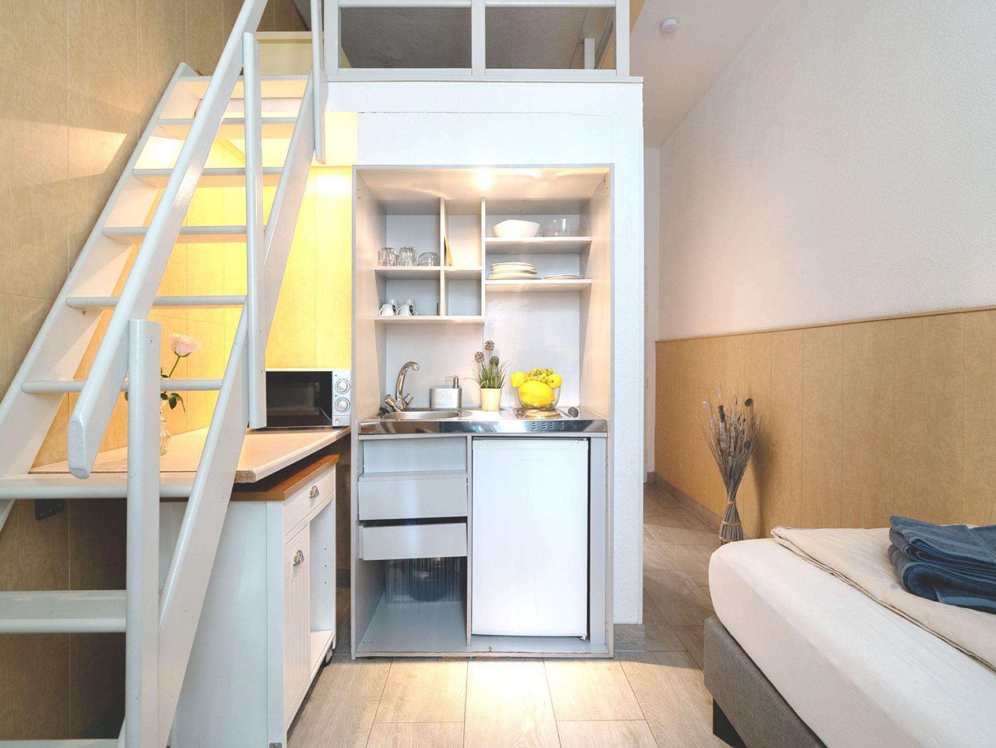 • Kühlschrank mit Gefrierfach, Mikrowelle, zwei Kochplatten Wasserkocher