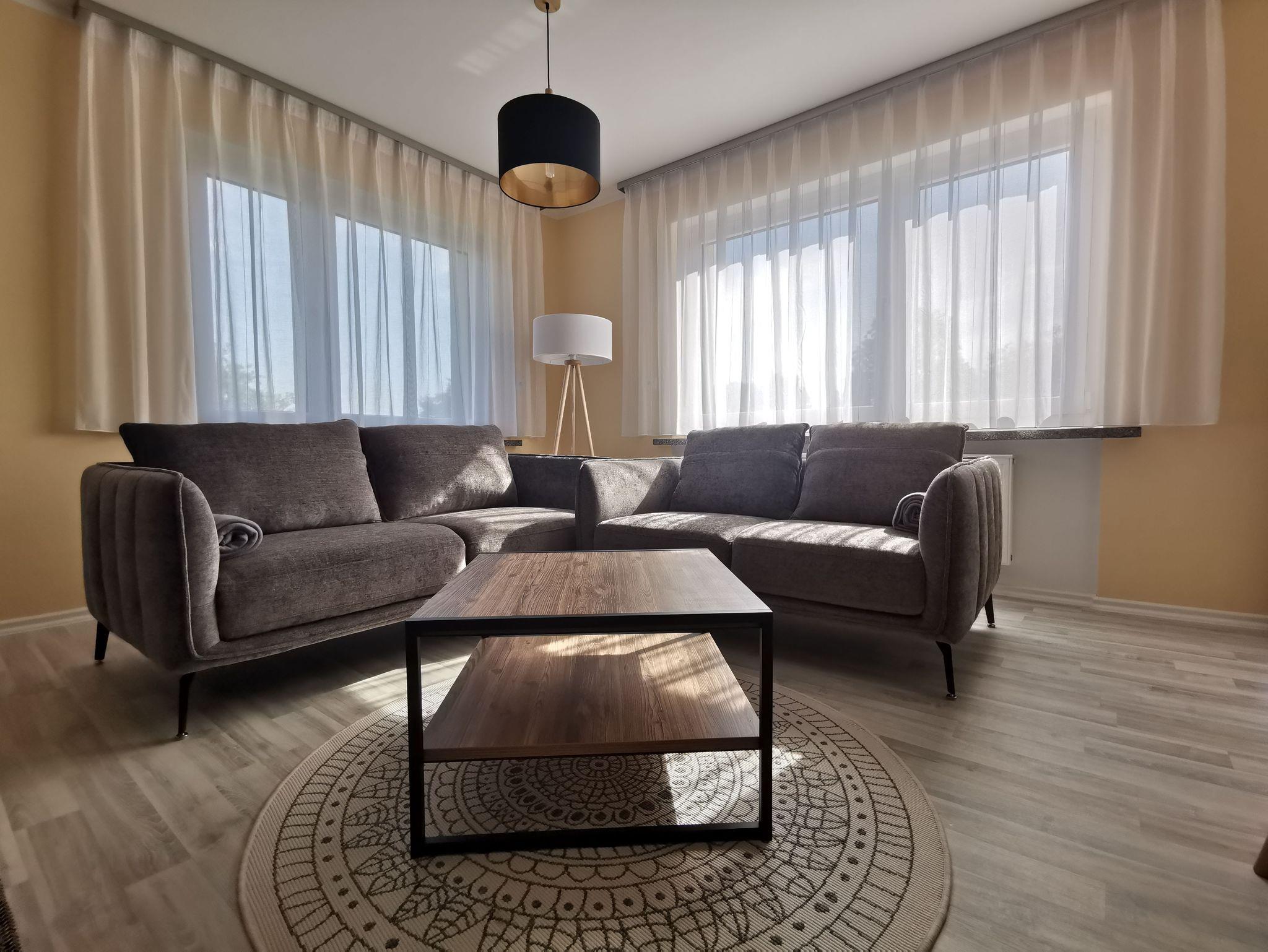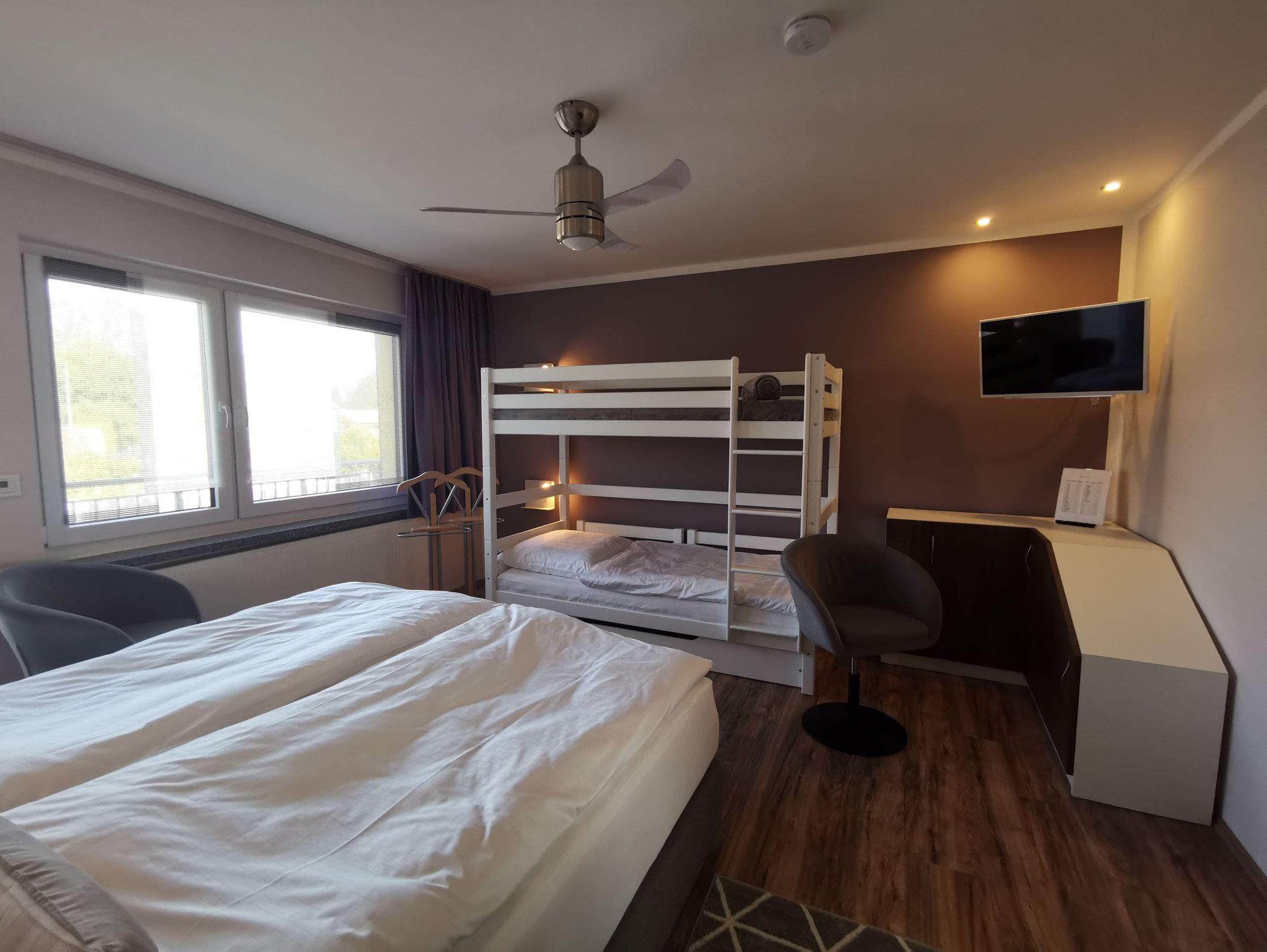 In der Ferienwohung ist ein Wohnraum mit TV, Esstisch und gemütlichen Sitzmöglichkeiten, ein separater Schlafraum mit TV und einem Doppelbett (1,80 x2,00) und einem Etagenbett. Die Einbauküche ist separat und komplett ausgestattet mit Mikrowelle, Geschirrspüler und Backofen, der Esstisch befindet sich im Wohnzimmer. Das Bad ist ausgesttattet mit ebenerdiger großer Dusche, WC und Waschbecken. Im Wohnraum ist eine Musikanlage vorhanden. WLAN ist für die Gäste verfügbar.
