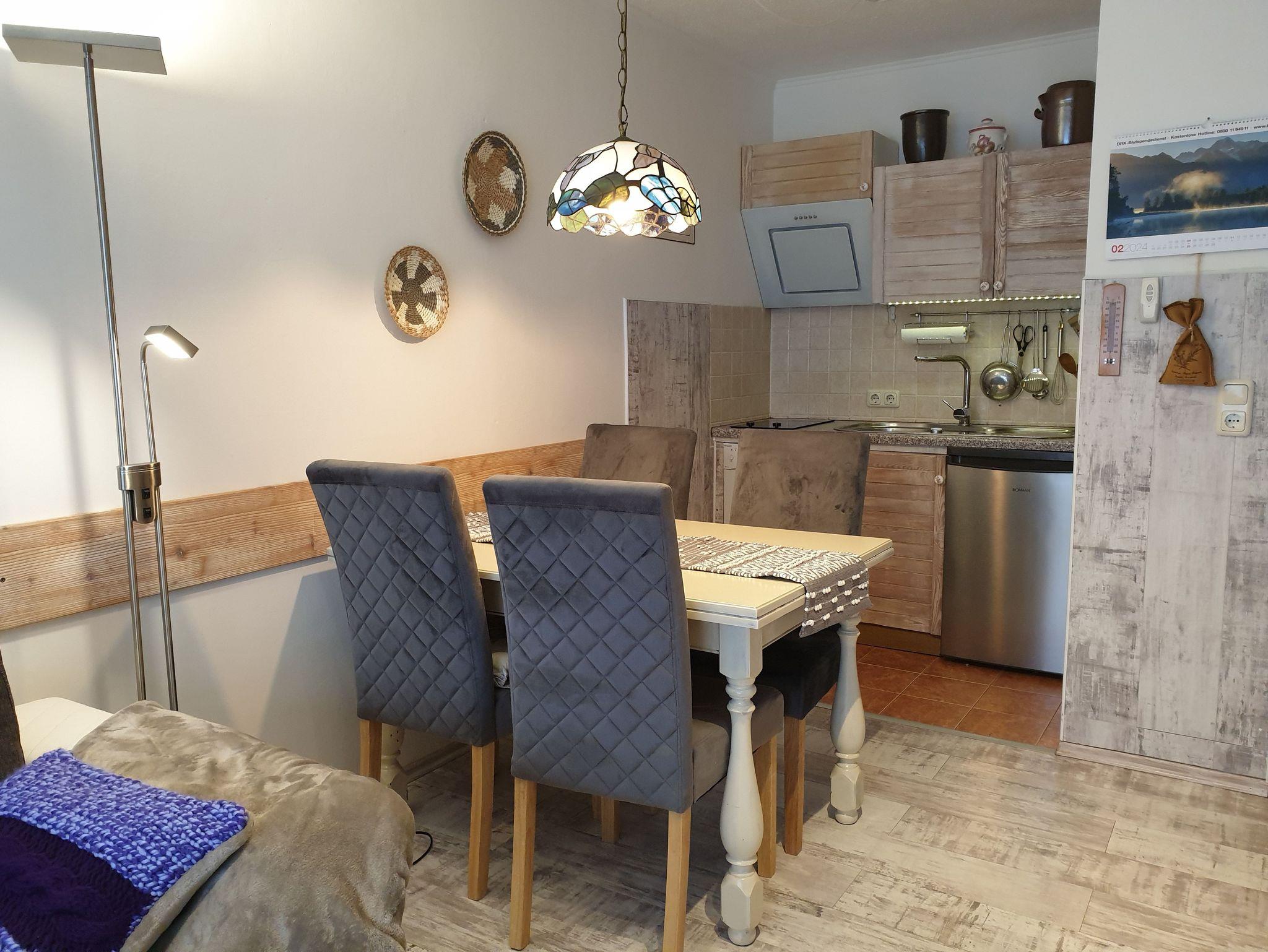 Die Ferienwohnung bietet Platz für 2 Personen. Neben einer Küchennische, großem Esstisch und Fernseher im Wohnbereich finden Sie ein komfortables Doppelbett im seperaten Schlafzimmer vor, in welchem sich auch ein Schreibtisch befindet. Des Weiteren steht Ihnen eine eigene Terrasse zur Verfügung. Eine Aufbettung bis zu 5 Betten ist auf Anfrage möglich.