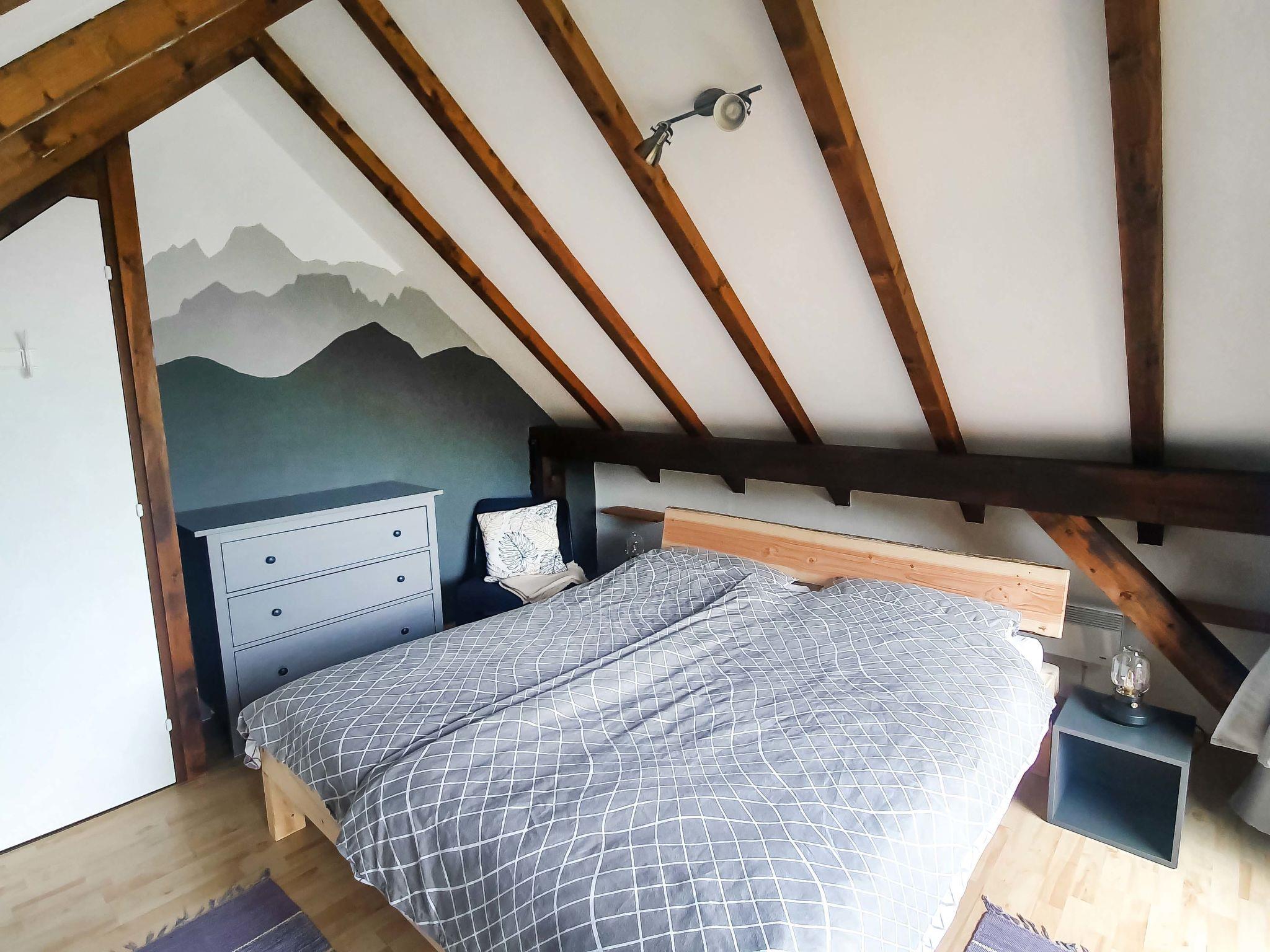 4-room house 105 m2 on 2 levels, on the ground floor. Large living/dining room 50 m2 with satellite TV and radio. Exit to the balcony. 1 double bedroom. Kitchenette (oven, dishwasher, microwave, electric coffee machine). Bath/shower/WC. Upper floor: 1 room with sloping ceilings with 1 bed and 1 double bed. 1 double bedroom with sloping ceilings. 2 balconies, lawn. Balcony furniture, barbecue (portable). Facilities: children's high chair. Internet (WiFi, free). Detached house. Access to upstairs is via a narrow staircase. Entrance with locker for skis and other equipment.