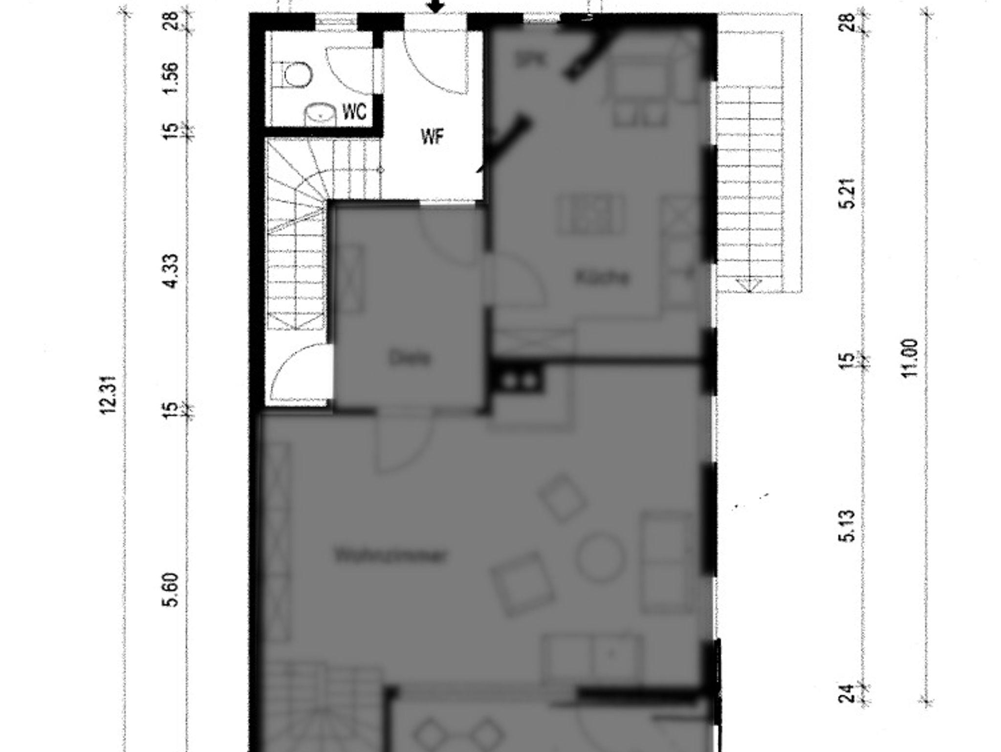 Im ersten Stock befinden sich eine voll ausgestattete Küche, ein gemütliches Wohnzimmer und ein Esszimmer.