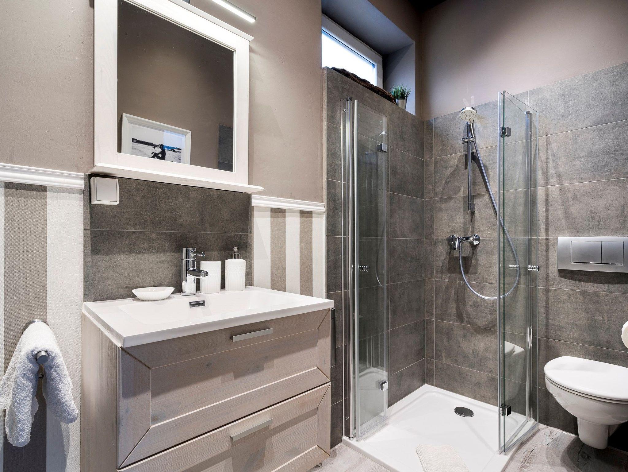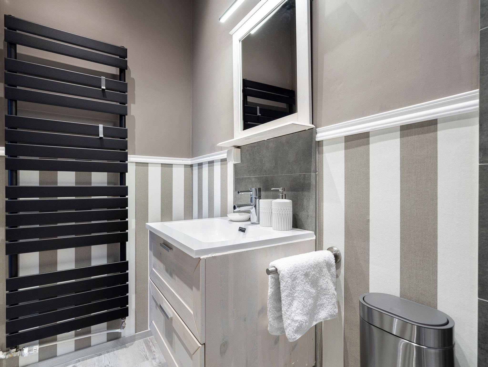Das Bad hat eine Badewanne mit Spritzschutz zum Duschen und einen großen Handtuch-Heizkörper. Mit hochwertigem Hänge-WC. Der Waschtisch ist aus Porzellan und Echtholz-Schrank mit einer Schublade mit Steckdose und einem Föhn.