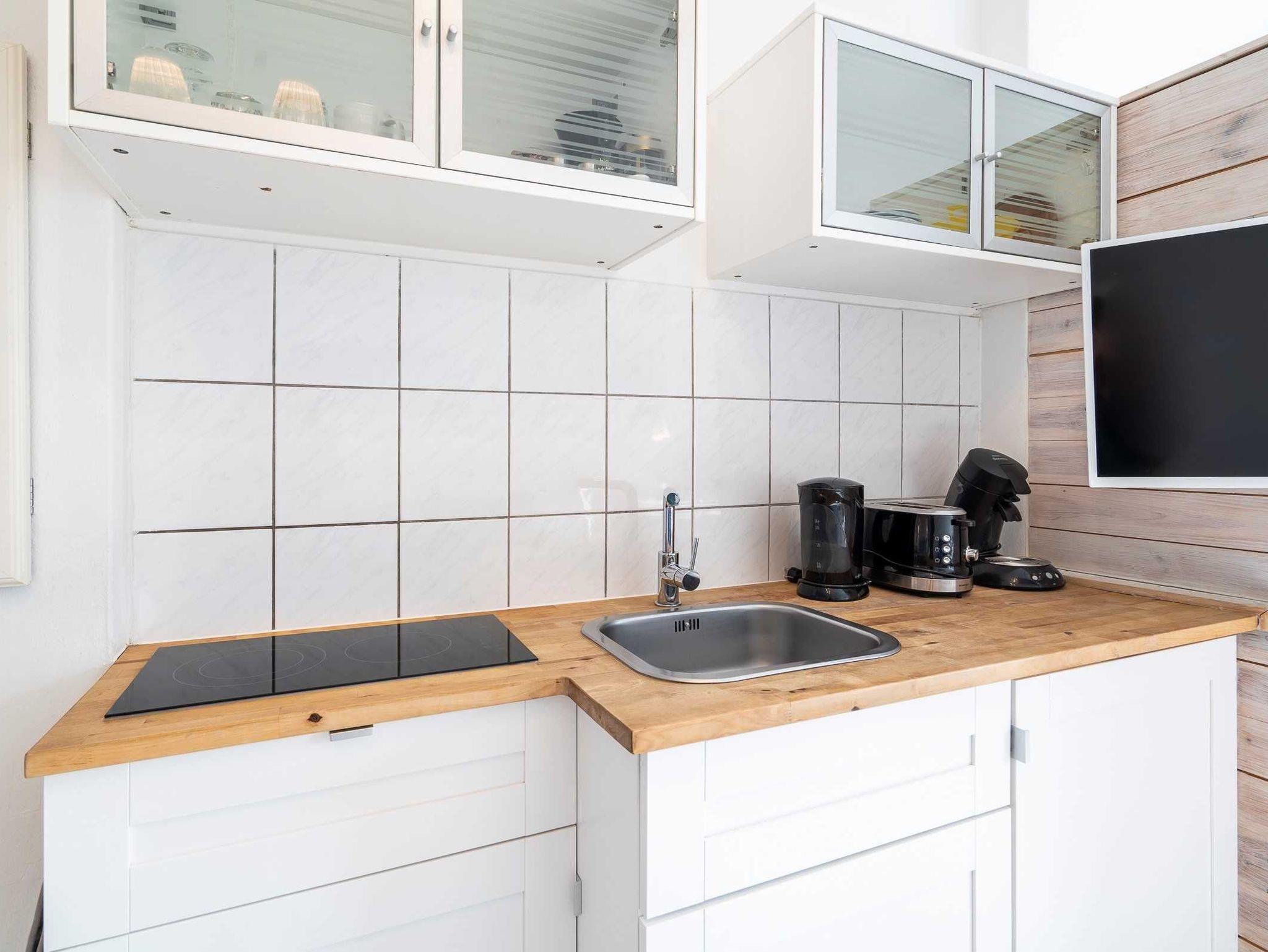 Die 1-Zimmer-Studio-Ferienwohnung ist im Winter 2023/24 neu renoviert und eingerichtet. Ob allein oder zu Zweit: hier finden unsere Gäste alles, was man braucht. Die Wohnung besteht aus einem Zimmer mit Küche, einem Vollbad und einer Terrasse mit Tisch und Stühlen. Es gibt ein 160 cm Doppelbett mit Strandpanorama, ein Sofa und einen Fernseher. In der Küchenecke finden sich neben einem 2-Platten-CeranKochfeld mit Mikrowelle und einem Kühlschrank mit Gefrierfach auch ein Wasserkocher und eine Kaffeemaschine. Es sind ausreichend Geschirr, Töpfe und Pfannen für 2 Personen vorhanden. Eine eigene Terrasse mit Tisch und Stühlen gehört auch zu der Wohnung.