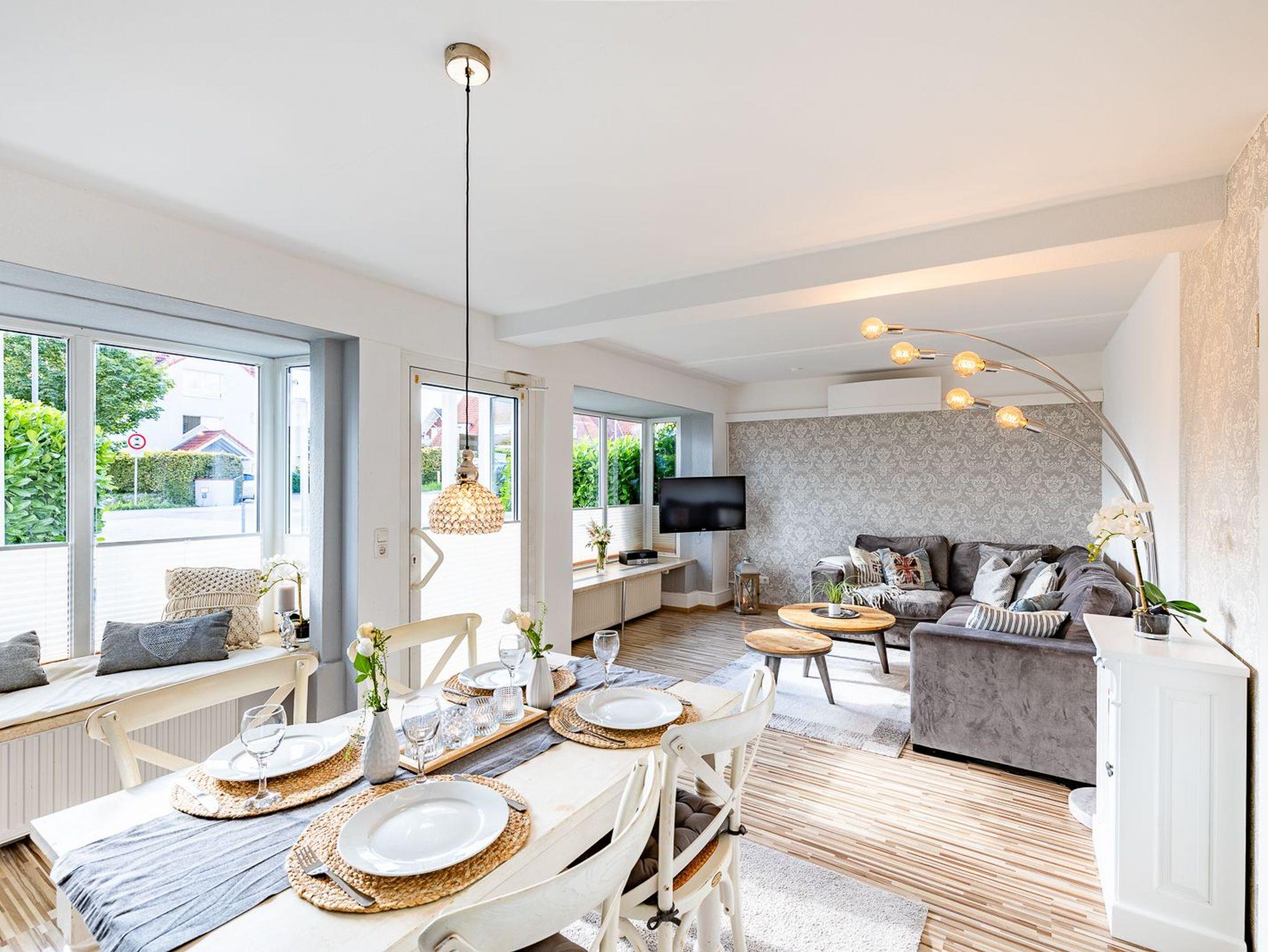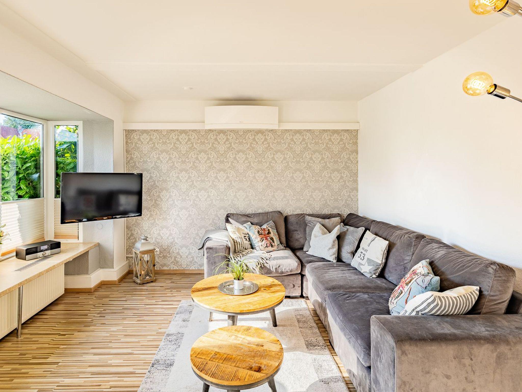 Gäste nutzen den modernen und zugleich gemütlichen Wohn-Essbereich für amüsante Spielabende in geselliger Runde oder erleben vor einem unserer neuen Flatscreen-Fernseher (104cm Diagonale) spannende Filmabende.