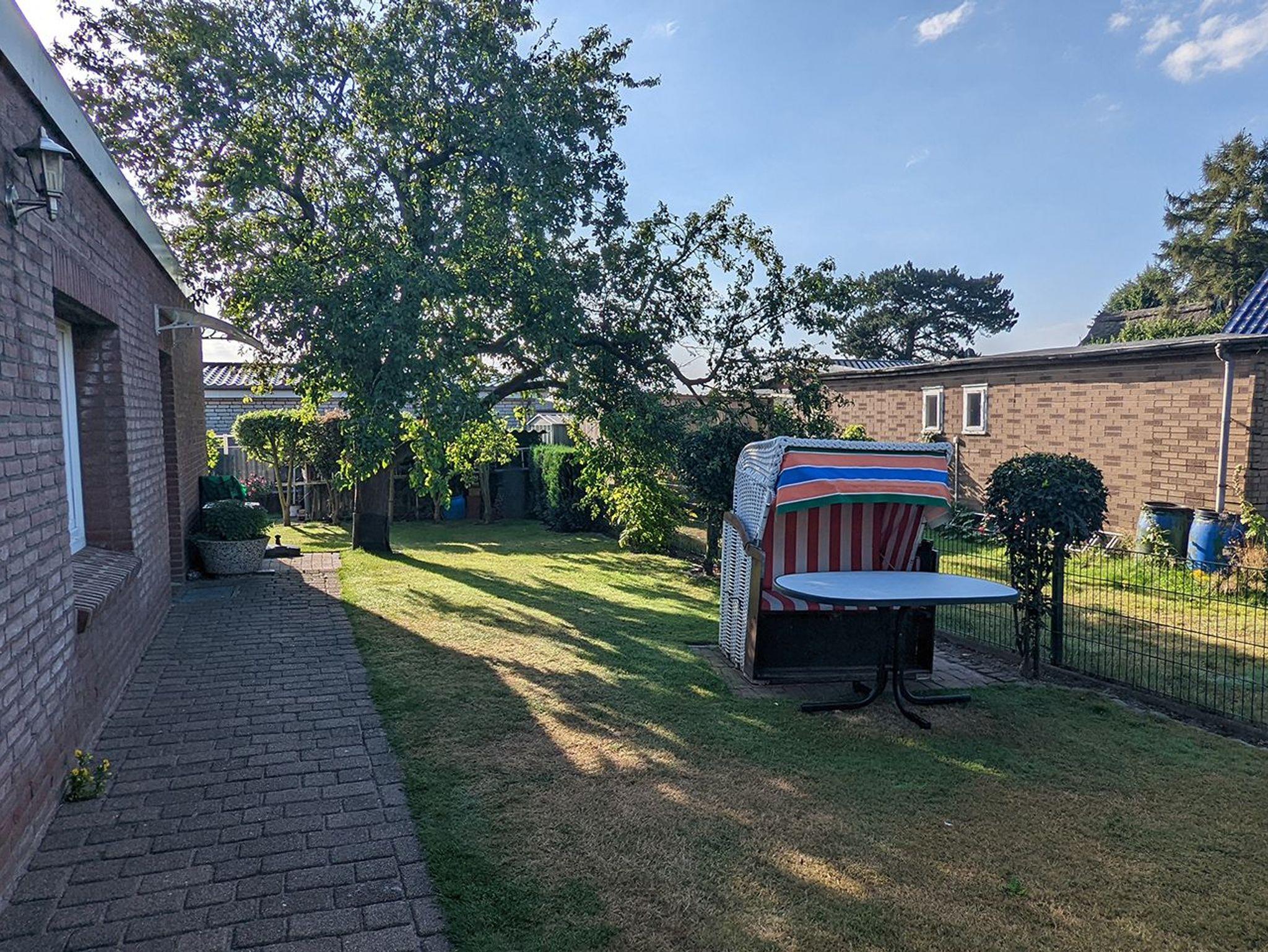Der große Garten mit Gartenmöbeln und Strandkorb lädt zum Verweilen ein.