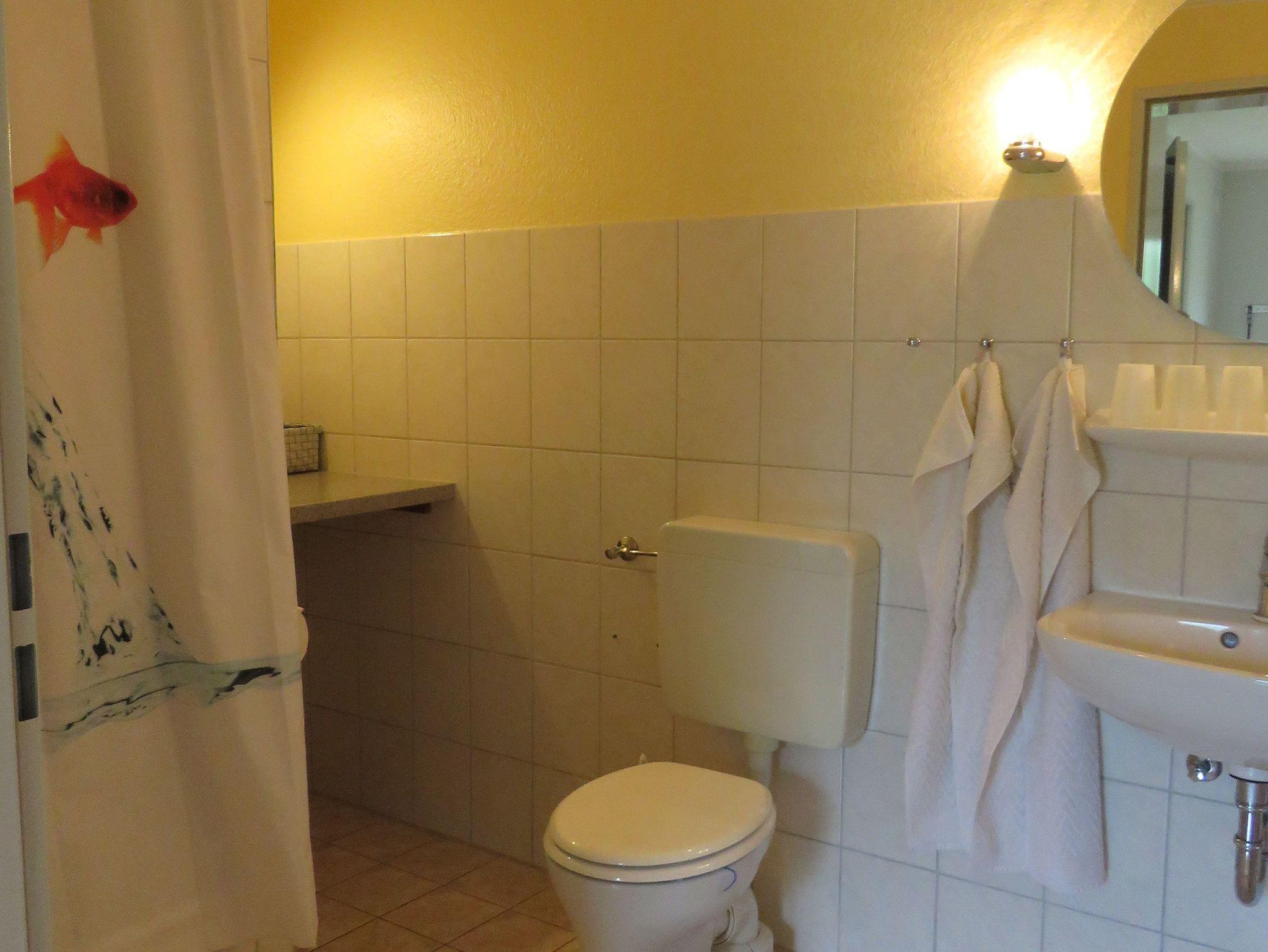 Ein geräumiges, hell gefliestes Duschbad für die wohltuende täglichen Pflege und Hygiene rundet das Gesamtbild der Ferienwohnung Garten ab. Im Bad befindet sich eine große Ablagegelegenheit, die Sie auch sehr gut als Wickelfläche für ein Baby nutzen können. Weiterhin finden Sie hier auch die Waschmaschine.