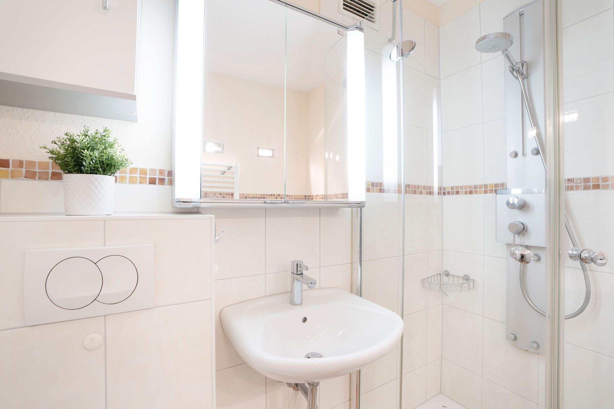Ein kleiner Flur heißt Sie willkommen und führt direkt in den gemütlichen Wohnbereich. Hier laden ein großes Ecksofa und die harmonisch integrierte Essecke mit großem Esstisch zu entspannten Stunden ein – sei es bei einem Filmabend oder einer geselligen Spielrunde. Von hier aus gelangen Sie auf den überdachten Balkon, der mit einem traumhaften seitlichen Blick auf die Ostsee bis hin zur Lübecker Bucht sowie über die Felder der Holsteinischen Schweiz begeistert. In der separaten, voll ausgestatteten Küche können Sie kochen wie zu Hause. Das Hauptschlafzimmer verfügt über ein komfortables Doppelbett (2x 80x200 cm) und eine Kommode, das zweite Schlafzimmer ist mit einem Etagenbett (je 80x200 cm) und einem Kleiderschrank eingerichtet. Das helle Duschbad ergänzt die Wohnung perfekt.