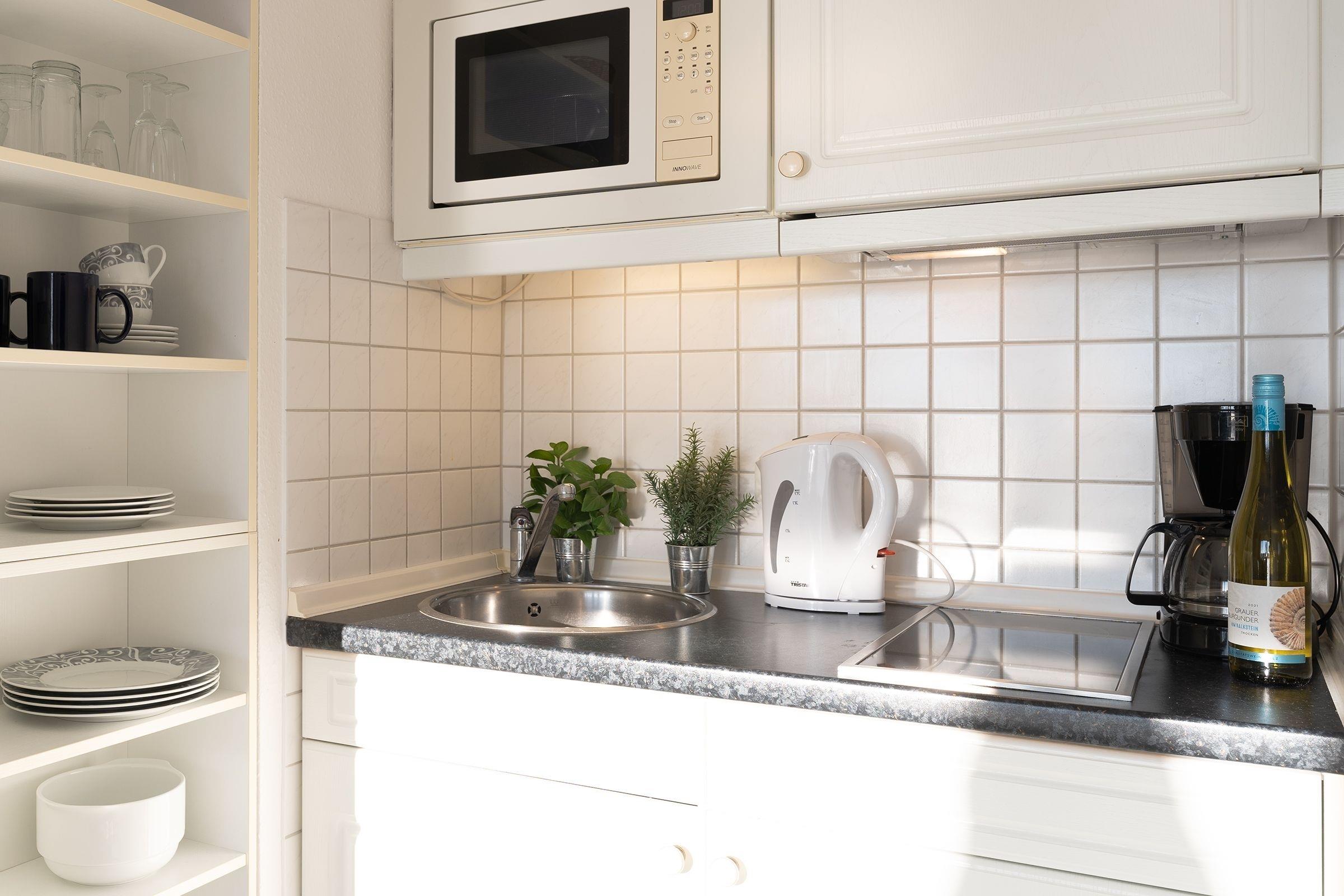 Das 1-Zimmer-Appartement hat ca. 28 m² und bietet Platz für bis zu 2 Personen. Es ist komplett gefliest und verfügt über einen Wohn-/Schlafraum mit einem Doppelbett (2x 90x200 cm), TV-Gerät, Radio/CD-Player, Essplatz, integrierter Küchenzeile sowie einem Zugang zum Balkon mit Gartenmöbeln und etwas Meerblick. Die moderne Küchenzeile ist ausgestattet mit: Induktionsherd (4 Kochplatten), Kühlschrank mit Gefrierfach, Mikrowelle, Wasserkocher, Kaffeemaschine und Toaster. Duschbad mit Fön.