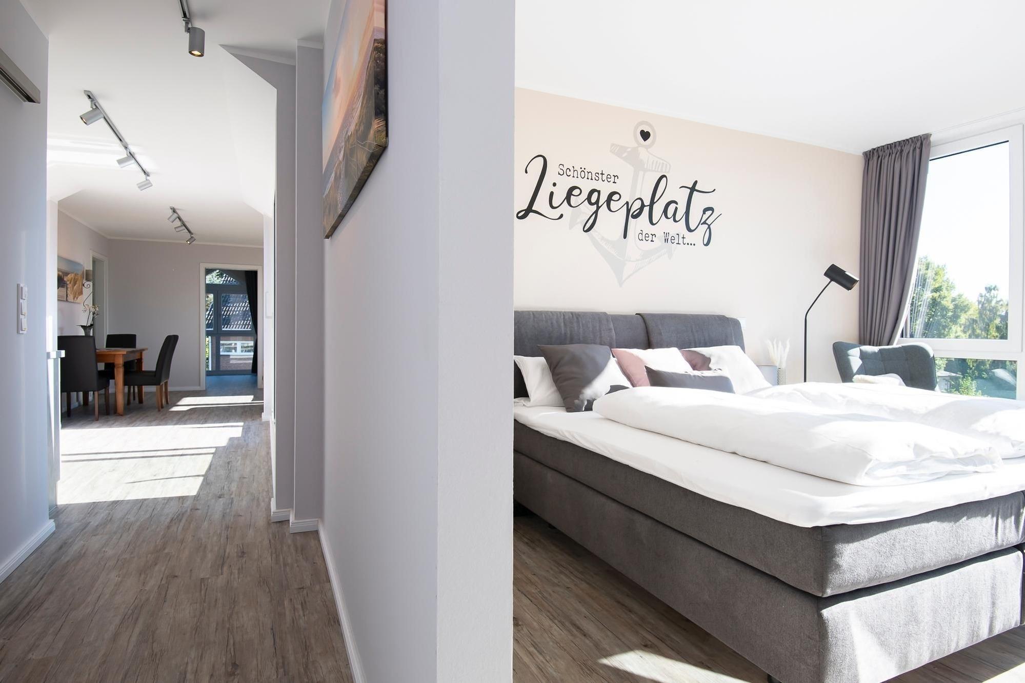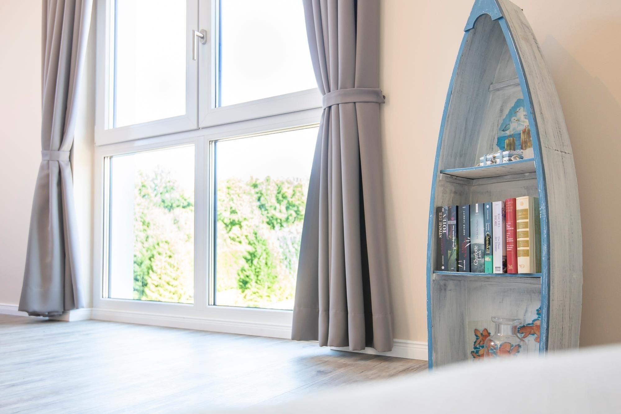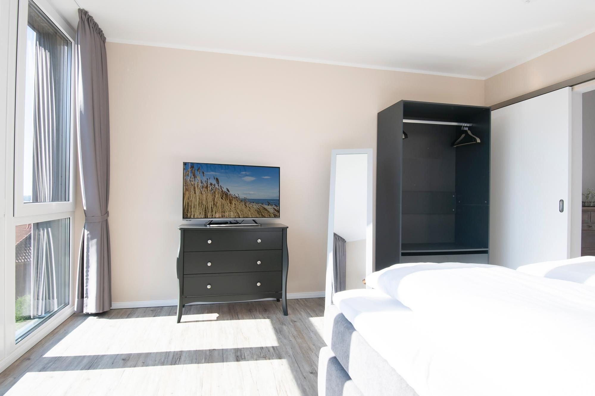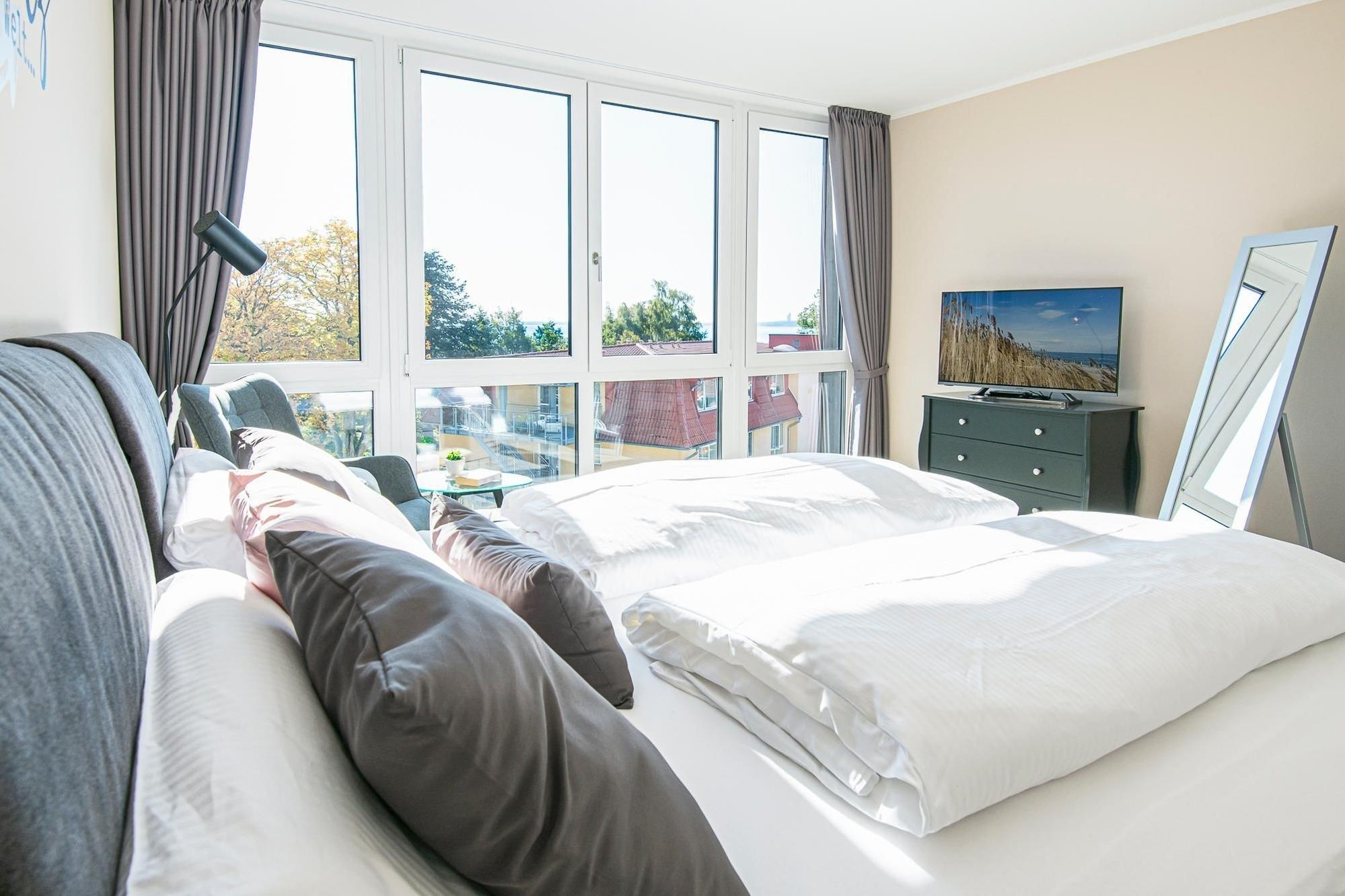 Durch einen ausgefeilten Grundriss ist die Wohnung lichtdurchflutet und überzeugt mit einem Blick auf die Ostsee. Der Eingangsbereich führt direkt in die offene, moderne, voll ausgestattete Küche über, die vis à vis zur Loggia mit Meerblick liegt. Bereiten Sie sich schmackhafte Köstlichkeiten zu und genießen Sie diese direkt auf Ihrem möblierten Balkon, begleitet vom Rauschen des Meeres und Rufen der Möwen. Sollte das Wetter es einmal nicht zulassen, unter freiem Himmel zu essen, steht im Wohnbereich ein Esstisch mit Platz für Vier bereit. Zu spannenden Kinoabenden vor dem Flachbild-TV oder geselligen Spieleabenden lädt Sie im Wohnbereich ein gemütliches Ecksofa zum Kuscheln ein. Loggen Sie sich im kostenlosen WLAN-Netzwerk ein und bleiben Sie auch im Urlaub erreichbar. Im Hauptschlafzimmer mit Flat-TV wartet ein komfortables Boxspringbett (2x 90x200 cm, durchgehender Topper) für erholsame Nächte auf Sie. Dank Verdunkelungsgardinen mit Wärmeschutz kann man hier auch im Sommer angenehm schlafen. Im zweiten separaten Schlafzimmer können sich 2 weitere Urlaubsgäste ebenfalls in die Kissen eines Boxspringbettes (2x 90x200 cm, durchgehender Topper) fallen lassen. Dieser Raum lässt sich durch elektrische Außenrollläden verdunkeln. Neue Energie tanken Sie nach einer erfrischenden Dusche im hochwertigen Badezimmer mit Handtuchheizung, Waschmaschine und Föhn. Für angenehme Wärme sorgt eine Fußbodenheizung in der ganzen Wohnung.