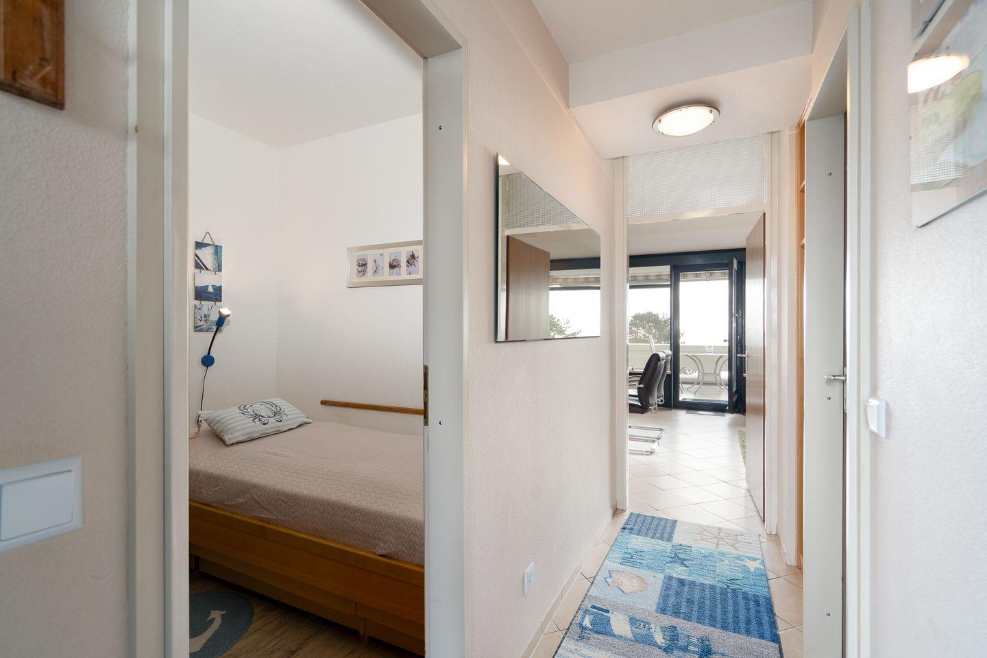 diese gepflegte Wohnung befindet sich in der 2. Etage mit geräumigen Balkon in herrlicher Süd-Ost-Lage und Blick auf die Ostsee über die 1. Reihe hinweg. Vom kombinierten Wohn-Essbereich mit Küchenzeile haben Sie Zugang zum Balkon. Im Elternschlafraum befinden sich 2 Einzelbetten (90 x 190 cm), die man nicht zusammenstellen kann. Im Kinderschlafraum steht ein Etagenbett (oben 80 cm x 190 cm, unten 135 cm x 190 cm). Platz für ein Kinderreisebettchen steht in den Schlafräumen nicht zur Verfügung. Es gibt ein innenliegendes Duschbad.
