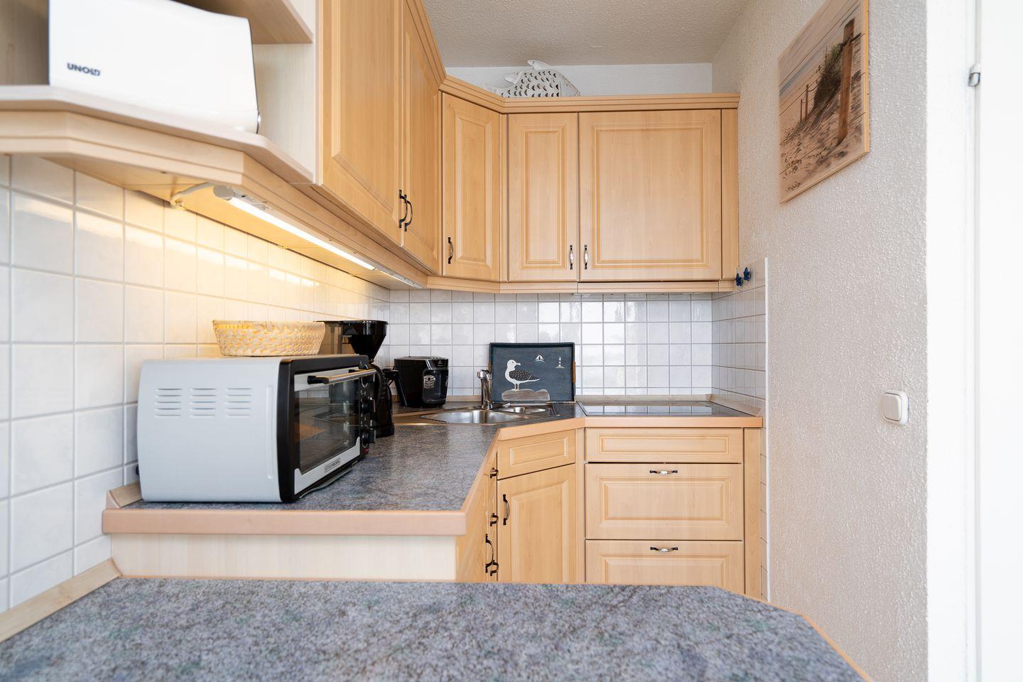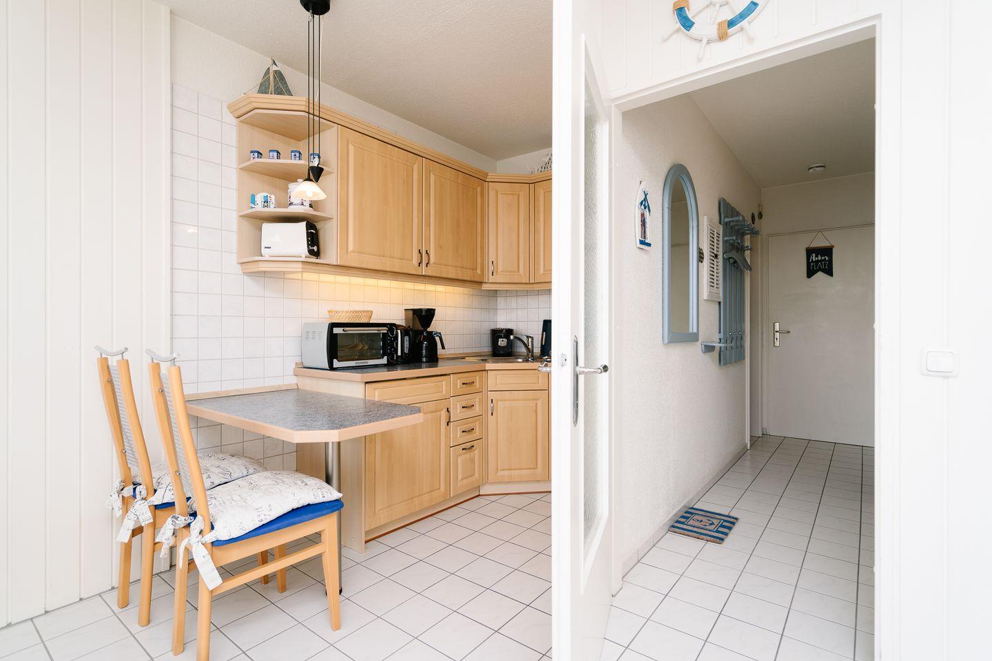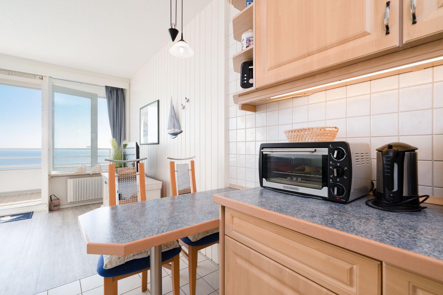 Vom kombinierten Wohn- und Essbereich haben Sie Zugang zum Balkon. Die gemütliche Einrichtung mit seinen vielen maritimen Elementen und dem direkten Meerblick lädt zu entspannten Urlaubstagen ein, fast schon als wären Sie in einer Schiffskabine an Bord. Sollten Sie dennoch ein wenig "Home Office" machen wollen, steht Ihnen ein Schreibtisch und WLAN zur Verfügung. Die kleine Küche mit Backofen und Herd ist zum Wohn-/Essbereich offen. Im innenliegenden Schlafraum befinden sich 2 Einzelbetten (jeweils 90 cm x 190 cm), die man nicht zusammenschieben kann. Im Schlafraum ist kein Platz, um ein Kinderreisebettchen aufzustellen. Das modernisierte Duschbad ist innenliegend. Zum Strand und zur Promenade sind es nur wenige Schritte.