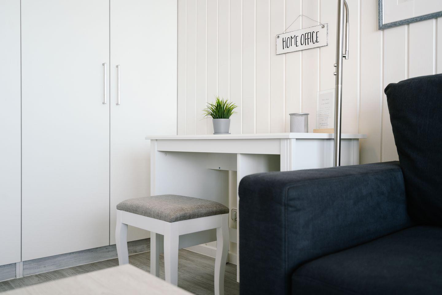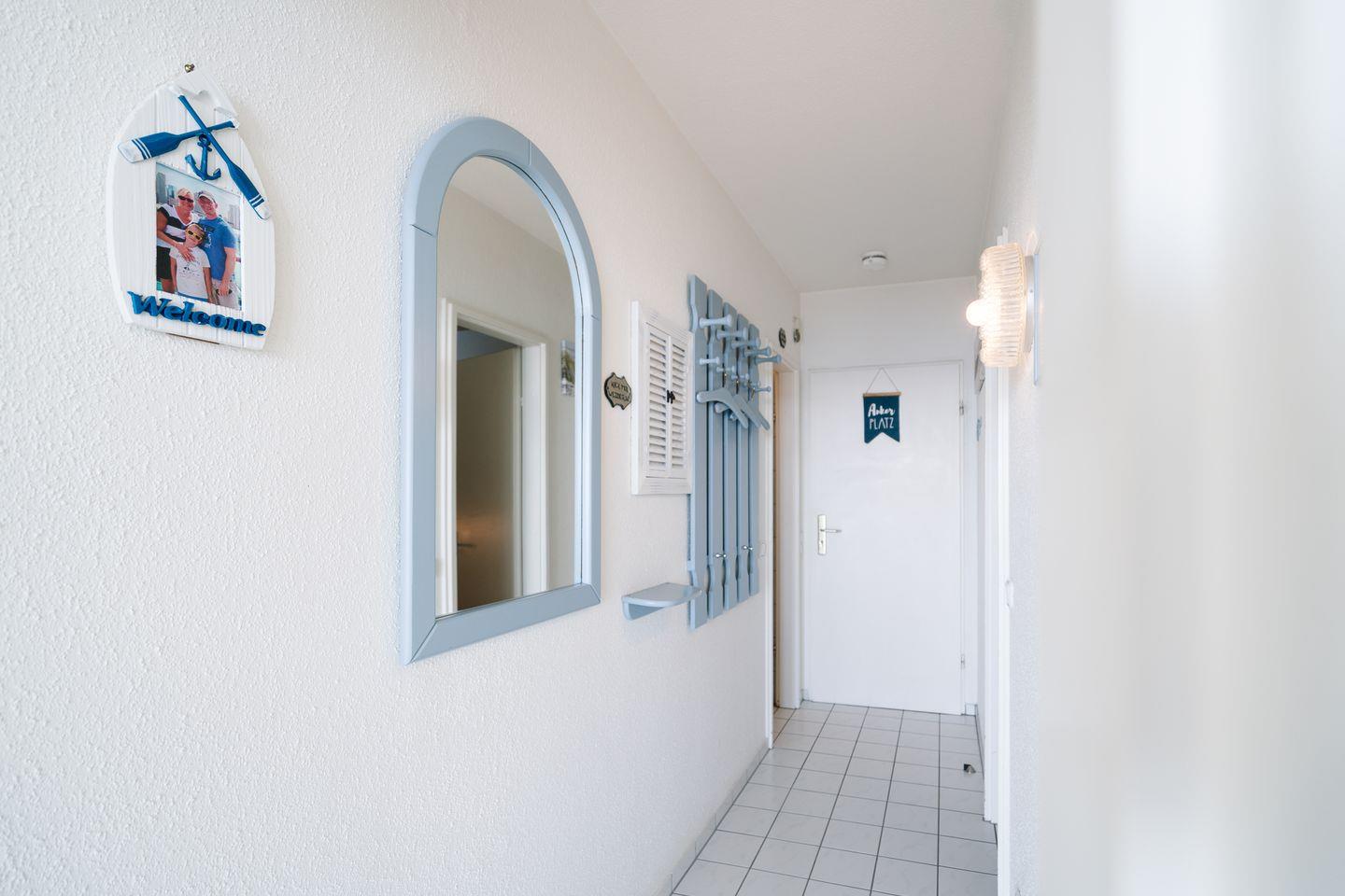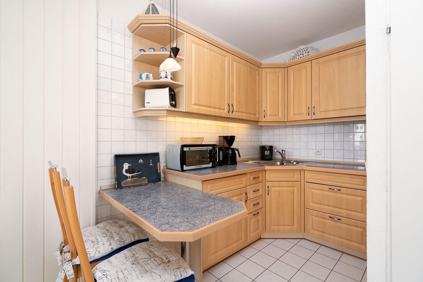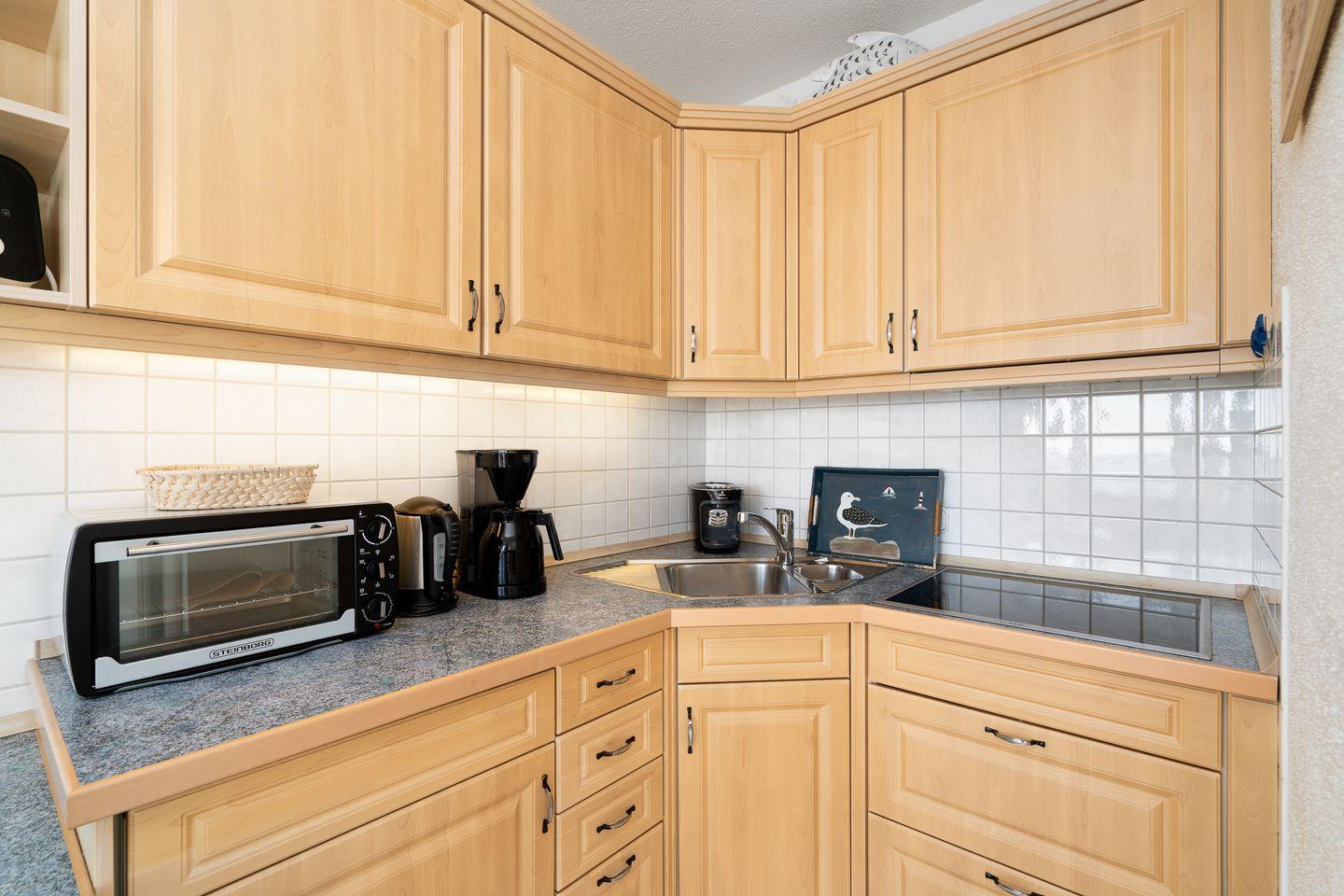 Vom kombinierten Wohn- und Essbereich haben Sie Zugang zum Balkon. Die gemütliche Einrichtung mit seinen vielen maritimen Elementen und dem direkten Meerblick lädt zu entspannten Urlaubstagen ein, fast schon als wären Sie in einer Schiffskabine an Bord. Sollten Sie dennoch ein wenig "Home Office" machen wollen, steht Ihnen ein Schreibtisch und WLAN zur Verfügung. Die kleine Küche mit Backofen und Herd ist zum Wohn-/Essbereich offen. Im innenliegenden Schlafraum befinden sich 2 Einzelbetten (jeweils 90 cm x 190 cm), die man nicht zusammenschieben kann. Im Schlafraum ist kein Platz, um ein Kinderreisebettchen aufzustellen. Das modernisierte Duschbad ist innenliegend. Zum Strand und zur Promenade sind es nur wenige Schritte.