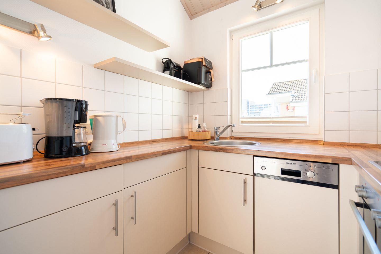 Die schöne Ferienwohnung Typ "Brigantine" liegt in der 1. Etage mit Balkon. Auf 70 qm stehen Ihnen zwei Schlafräume einmal mit Doppelbett (2x 80 x 200 cm) und einmal mit zwei getrennten Betten (jeweils 90 x 200 cm), ein geräumiger Wohn- und Essraum mit Kamin und Zugang zum Balkon zur Verfügung. Der Holzkamin sorgt für gemütliche Stunden mit Freunden und Familie. Vom Balkon haben Sie auch Meerblick über die anderen Häuser hinweg. Das Bad ist mit Wanne und Sauna ausgestattet. Der Komfort einer eigenen Sauna wird sehr von unseren Wintergästen geschätzt. Die zum Wohn- und Essbereich offene Küche ist mit Geschirrspülmaschine, Herd und Backofen gut ausgestattet. Eine eigene Waschmaschine gehört ebenfalls zur Ausstattung. Die Beheizung erfolgt über Elektroheizungen und den Kamin.