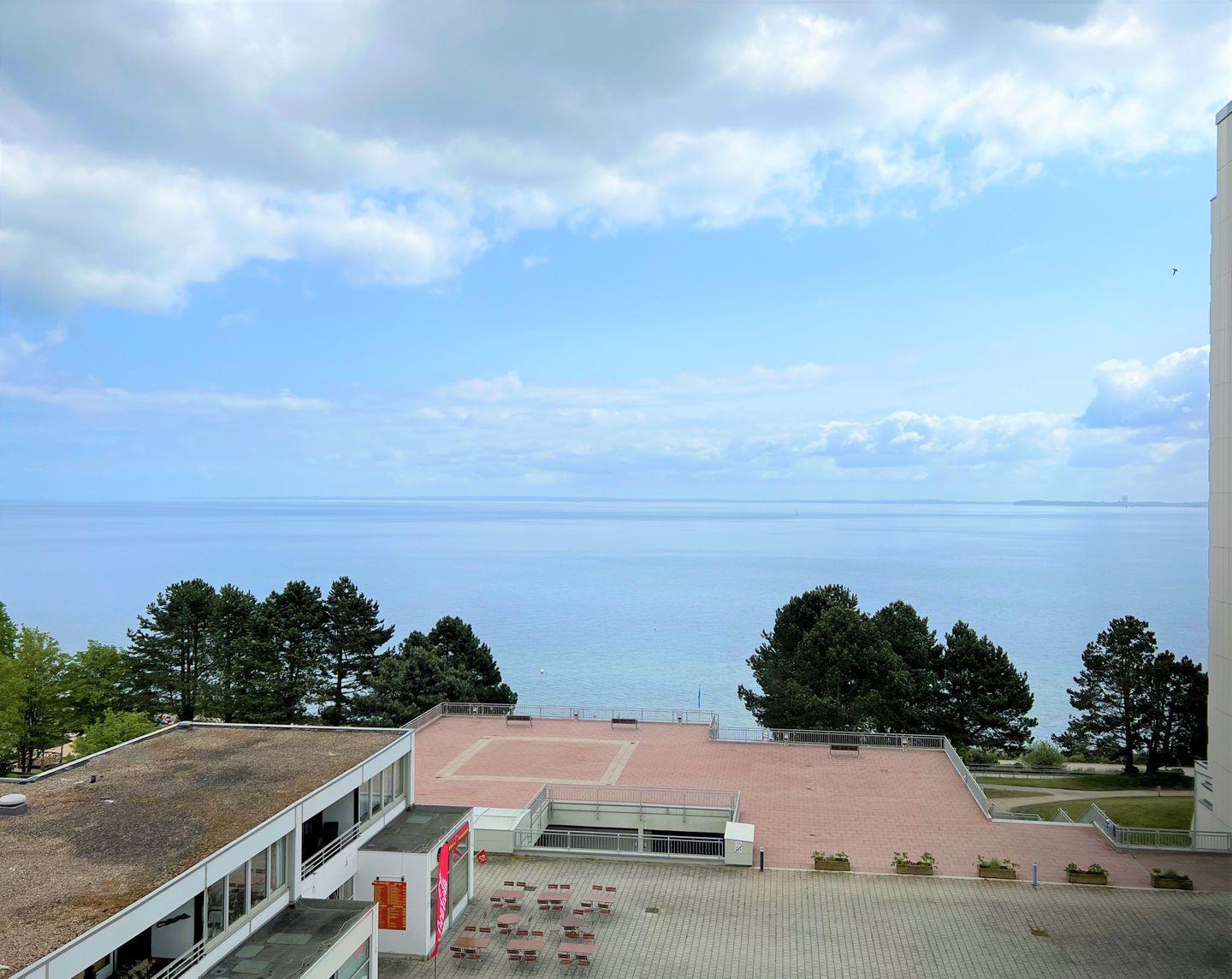 Die 2-Raum-Nichtraucher Wohnung Nr. 413 befindet sich in der 5. Etage mit Balkon in Süd-Ost-Lage und tollem Meerblick. Der Strand ist fußläufig in weniger als 5 Minuten zu erreichen. Im Schlafraum steht ein Boxspringbett (140 cm x 200 cm). Die kleine Küche mit Backofen und Herd ist mit einer Durchreiche zum Wohn-/Essbereich hin offen. Hier steht auch eine Schlafcouch für eine Person. Das modernisierte Duschbad hat ein Oberlicht zum Lüften. WLAN ist inklusive.