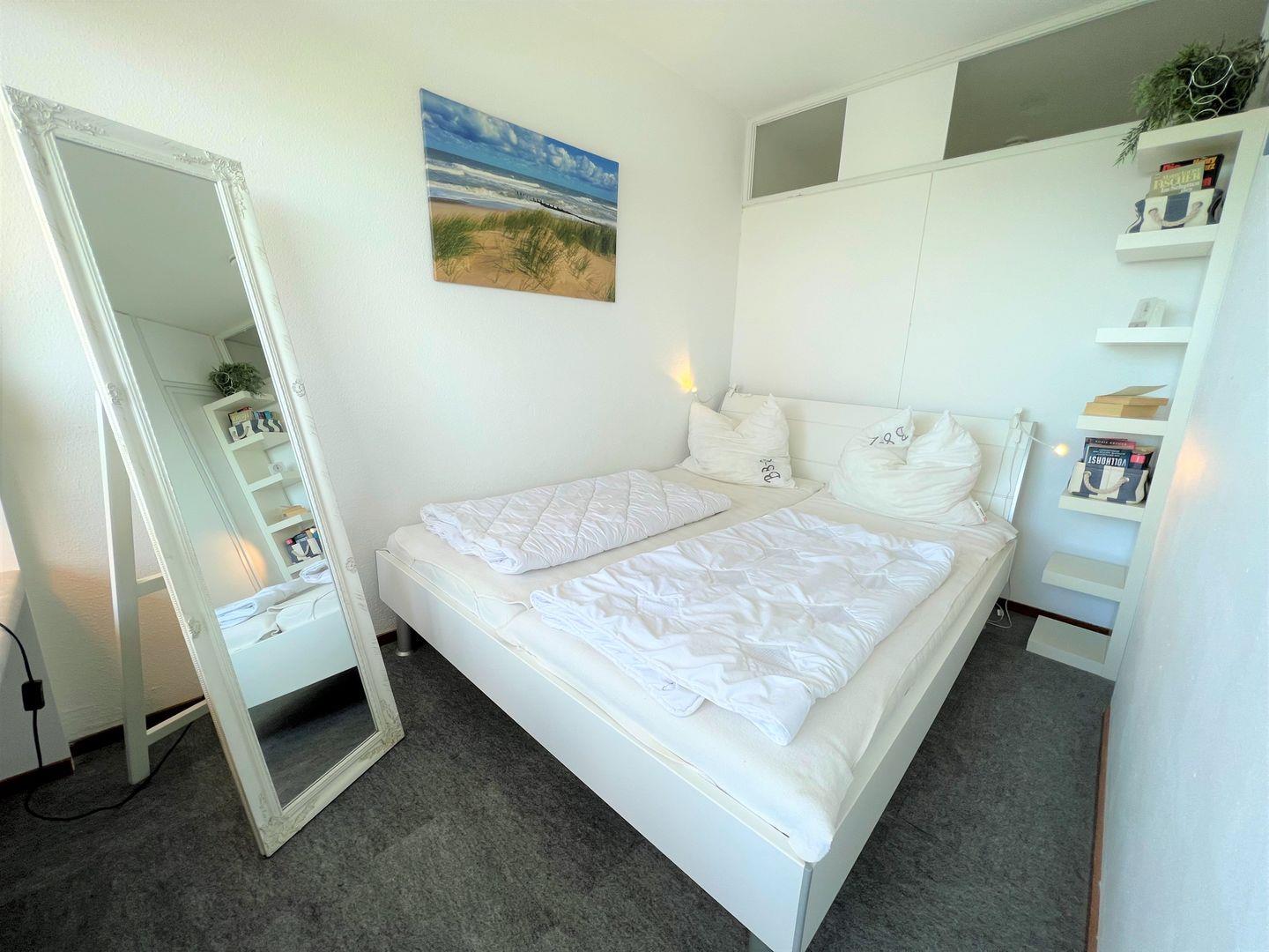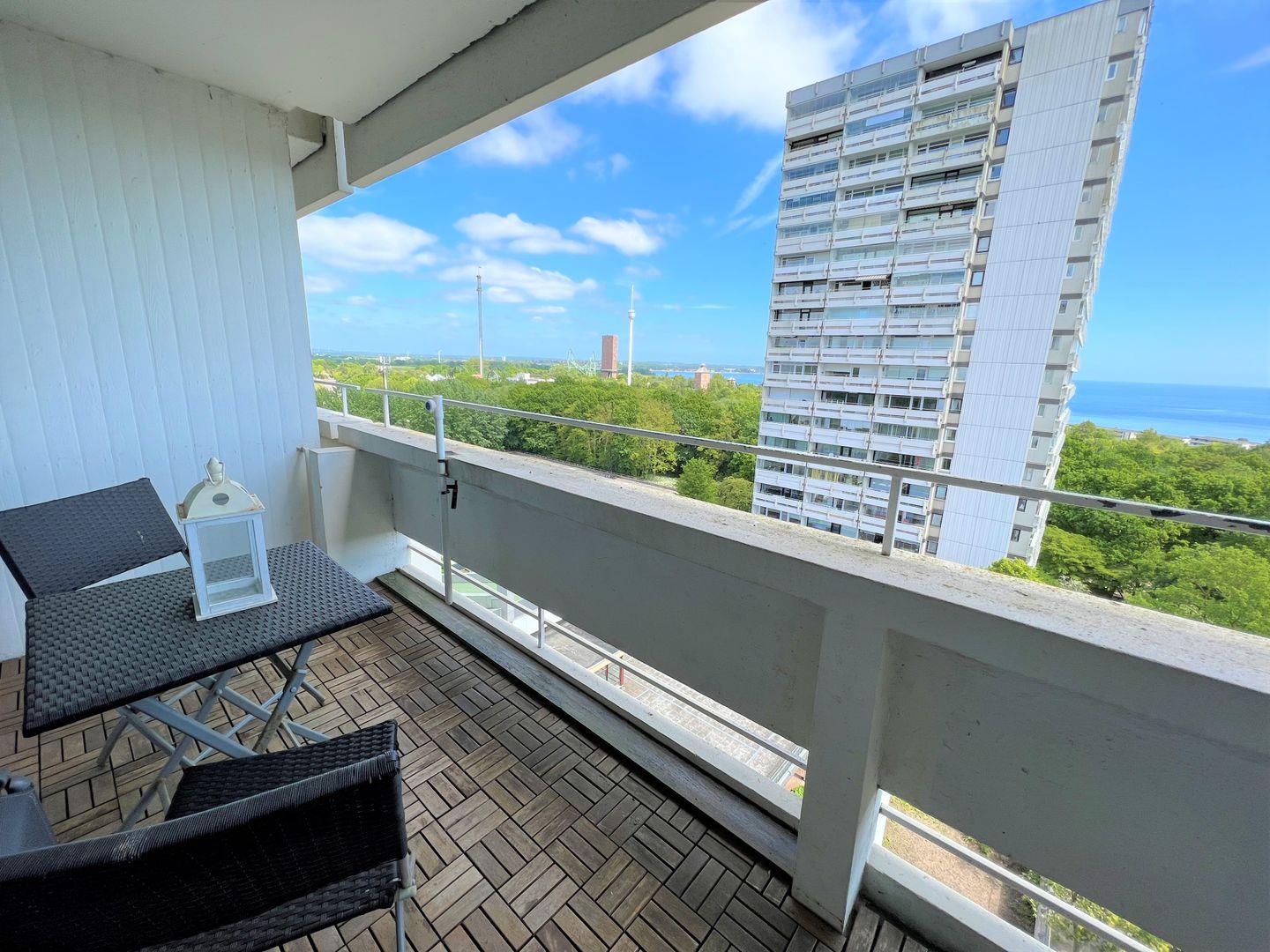 Die Wohnung liegt in der 8. Etage und hat einen Balkon in Ostlage. Vom kombinierten Wohn- und Essbereich haben Sie Zugang zum Balkon, von hier aus haben Sie einen schönen Fernblick auf die Ostsee. Die kleine Küche ist mit Backofen, Herd und Spülmaschine ausgestattet und hat eine Durchreiche zum Ess- und Wohnbereich. Im ersten Schlafraum mit großer Fensterfront steht ein franz. Bett (2x 90 cm x 200 cm) und im zweiten innenliegenden Schlafraum zwei Einzelbetten (2x 90 cm x 200 cm). Das weiß geflieste Wannenbad ist ebenfalls innenliegend. Zum Strand sind es nur wenige Gehminuten. PKW-Stellplatz ist nicht inklusive.
