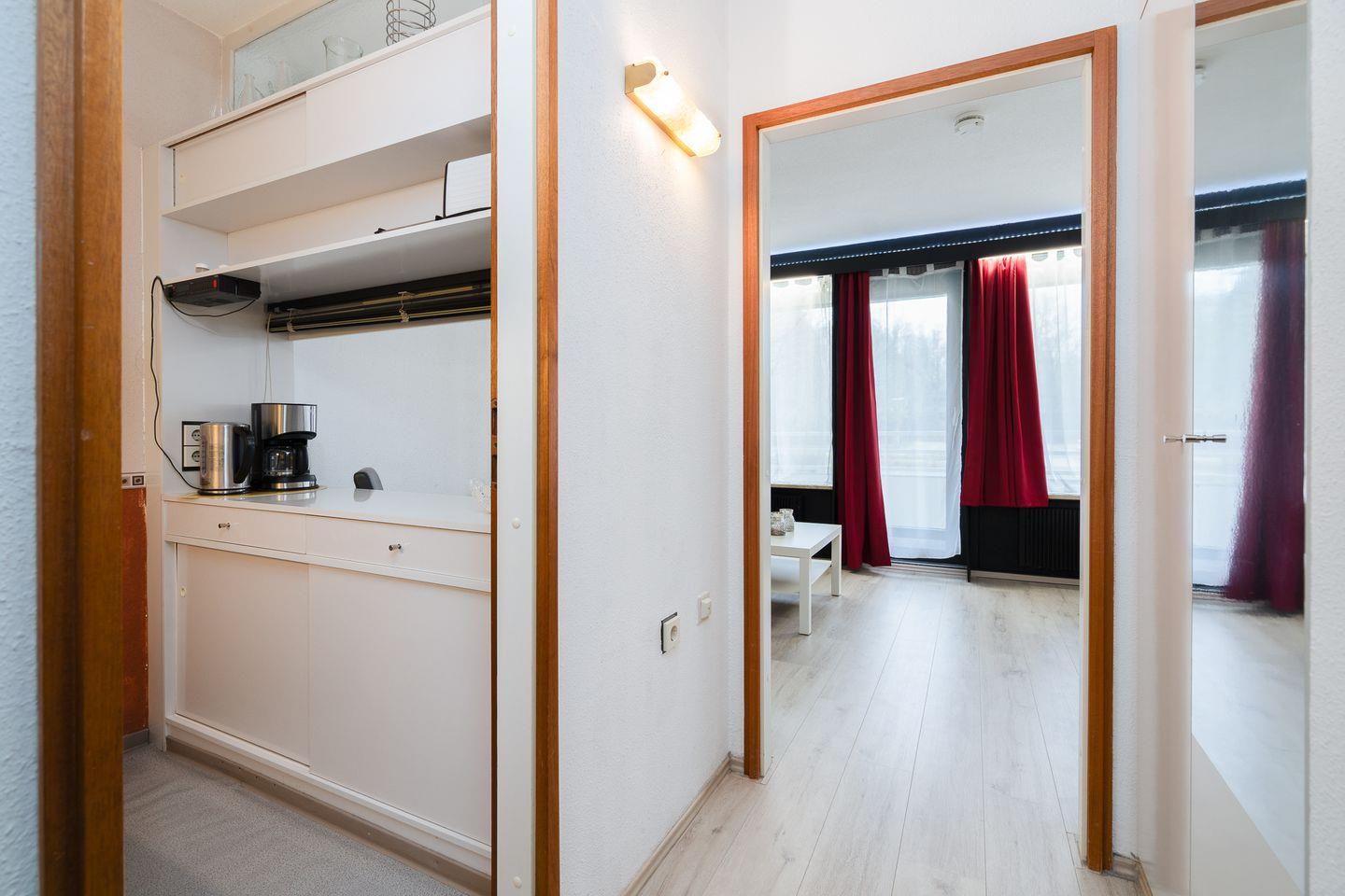 Die 33 qm große Ferienwohnung Nr. 580 befindet sich im Hochhaus im Hochparterre mit Balkon in Nord-West-Lage und Blick auf den Hansapark. Im Wohnbereich befindet sich ein bequemes Boxspringbett mit Topper. Die kleine Küchenzeile ist zum Wohnbereich mit einer Durchreiche hin offen und mit Backofen und Herd ausgestattet. Es gibt ein innenliegendes Duschbad. Zum Strand sind es nur wenige Gehminuten.