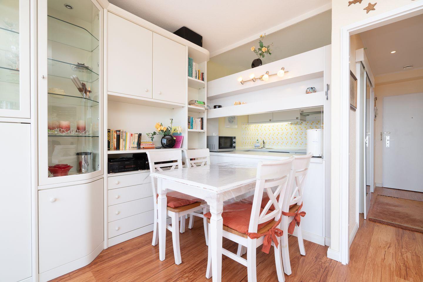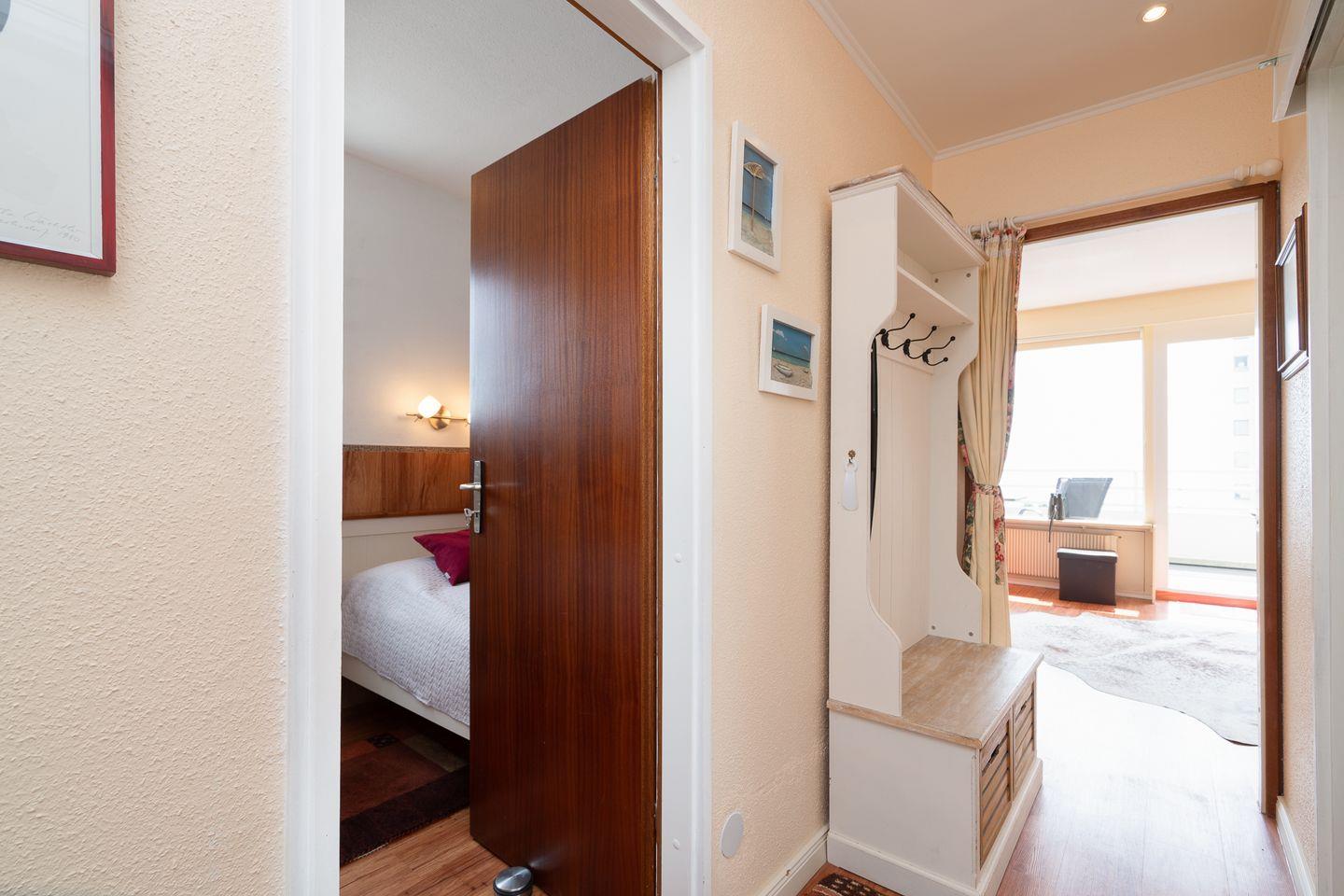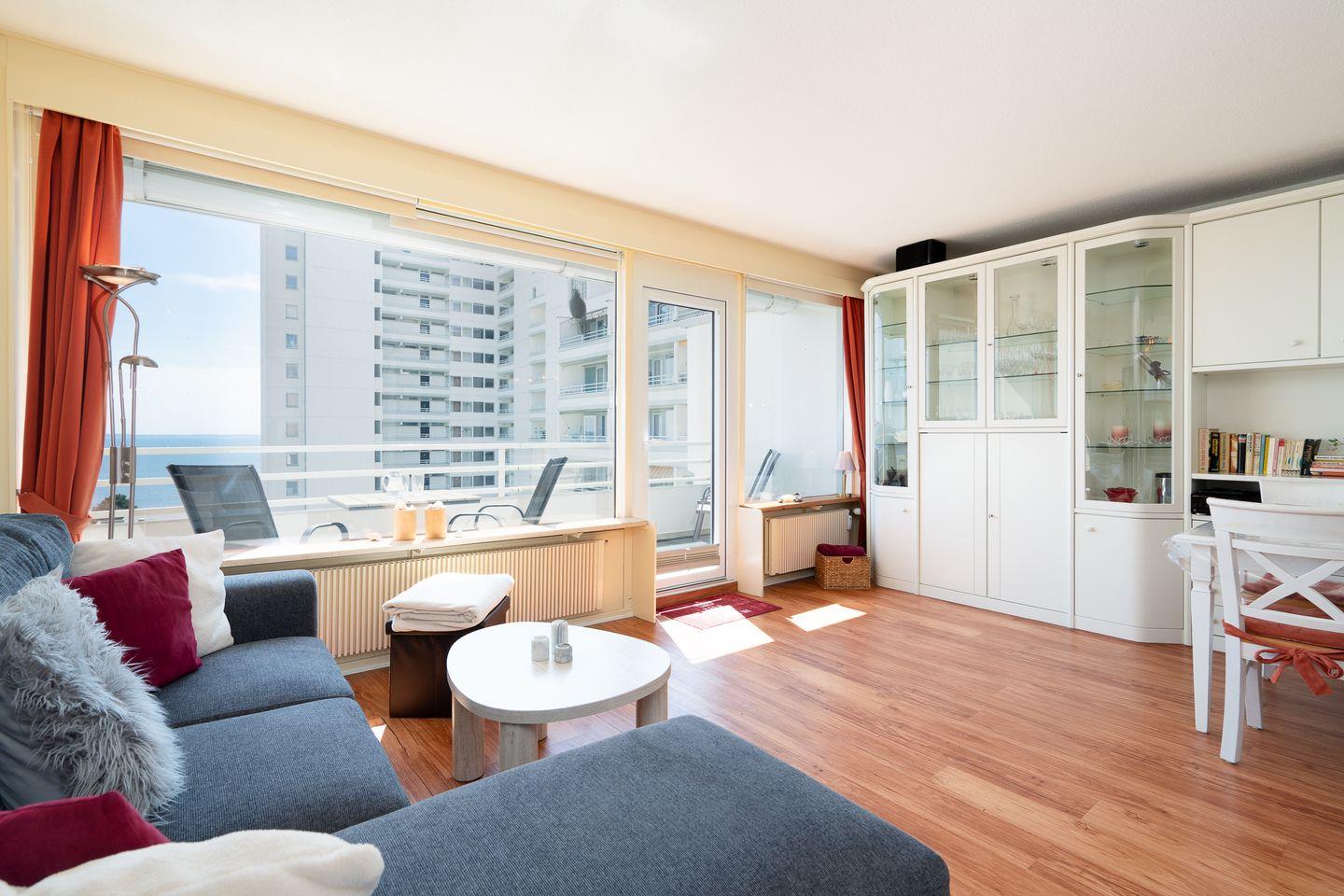 diese schöne 2-Raum-Ferienwohnung liegt in der 6. Etage mit einem möbliertem Süd-Ost-Balkon und Ostseeblick. Vom kombinierten Wohn- und Essbereich haben Sie Zugang zum Balkon. Die kleine, aber mit Spülmaschine, Backofen und Herd gut ausgestattete Küche ist mit einer Durchreiche zum Wohn-/Essbereich hin offen. Im Schlafraum, mit Fensterblick auf die Ostsee, stehen zwei getrennte Einzelbetten (80 x 190 cm), die man nicht zusammenstellen kann. Das moderne Duschbad ist innenliegend. Zum Strand sind es nur wenige Gehminuten. PKW-Stellplatz inklusive.