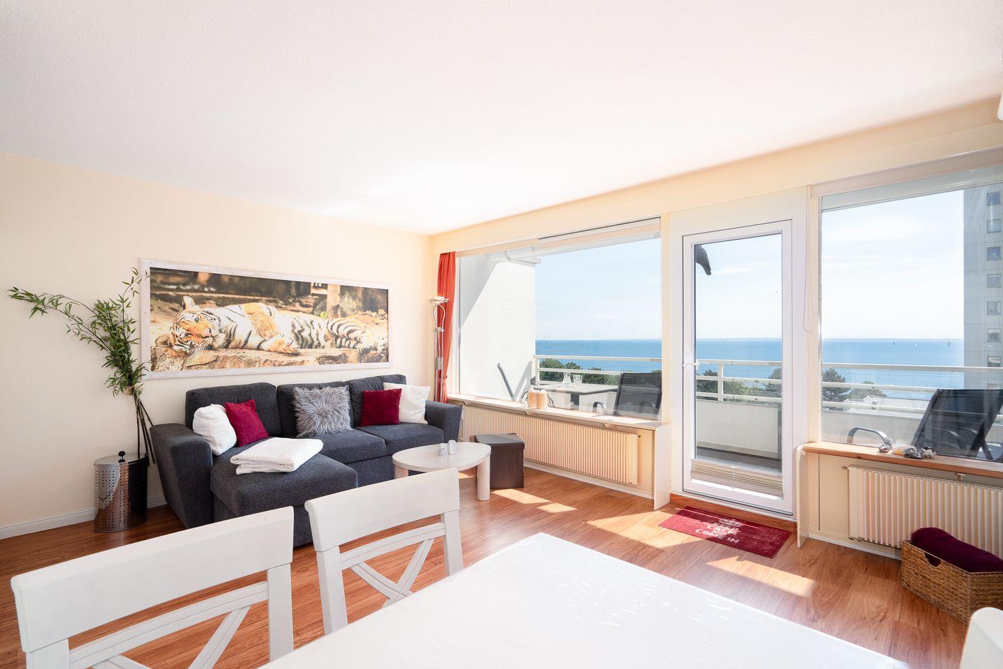 Die schöne 2-Raum-Ferienwohnung Nr. 748 liegt in der 6. Etage mit einem Süd-Ost-Balkon und Ostseeblick. Vom kombinierten Wohn- und Essbereich haben Sie Zugang zum Balkon. Die kleine, aber mit Spülmaschine, Backofen und Herd gut ausgestattete Küche ist mit einer Durchreiche zum Wohn-/Essbereich hin offen. Im Schlafraum, mit Fensterblick auf die Ostsee, stehen zwei getrennte Einzelbetten. Das moderne Duschbad ist innenliegend. Zum Strand sind es nur wenige Gehminuten.