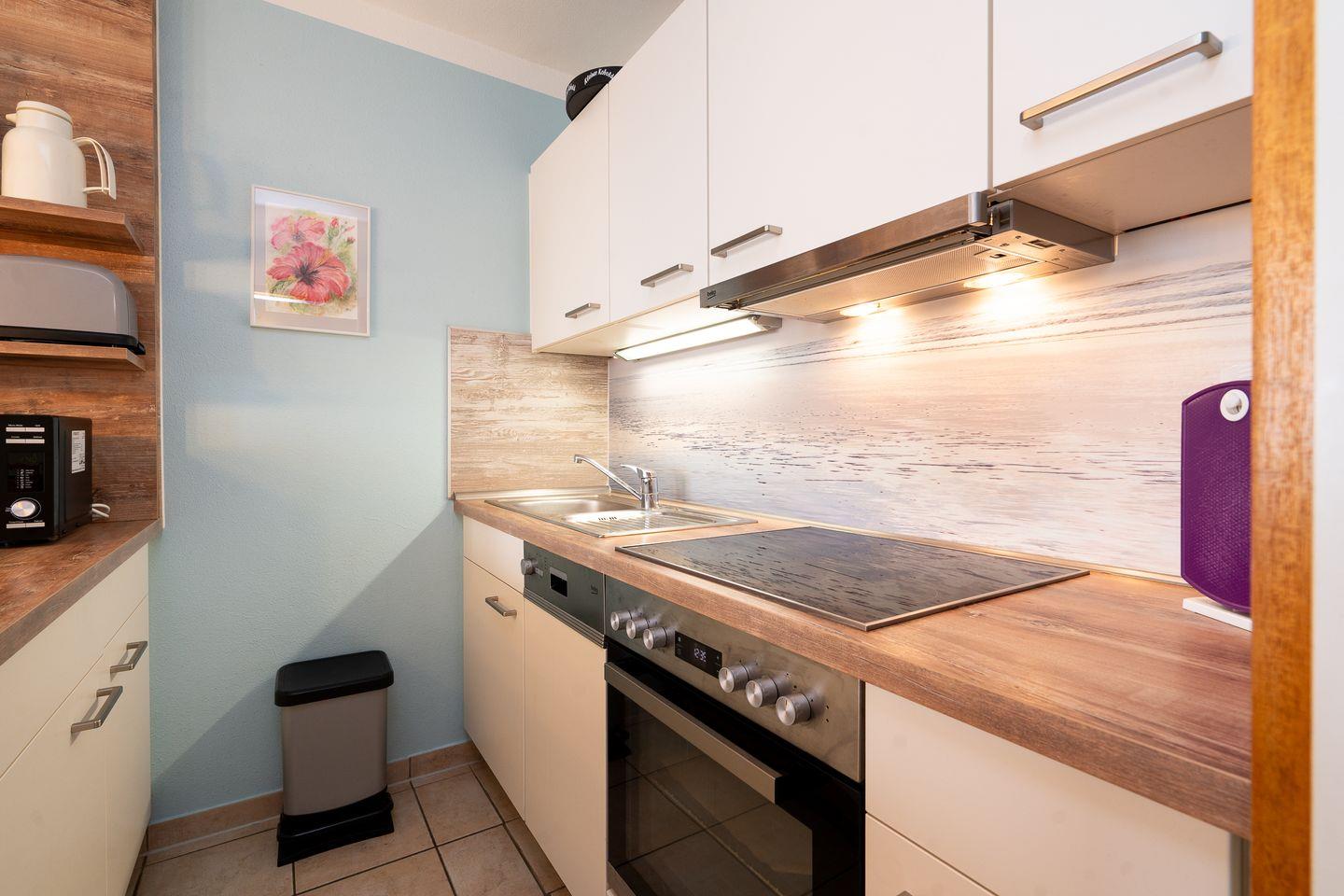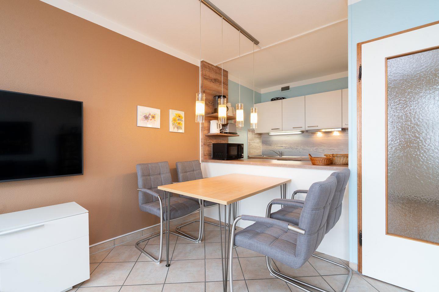 die 2-Raum-Ferienwohnung befindet sich in der 2. Etage mit Balkon in Nord-Ost-Lage und Blick in die Neustädter Bucht. Die moderne Küchenzeile ist zum hellen Wohn- und Essbereich hin offen und mit Spülmaschine, Backofen und Herd ausgestattet. Im innenliegenden Schlafraum befindet sich ein Doppelbett (2x 90 cm x 200 cm). Der Wohnraum ist zudem mit einer Schlafcouch (140 cm x 200 cm) ausgestattet. Das moderne Duschbad ist innenliegend. Der Strand und die Promenade sind nur wenige Gehminuten entfernt. PKW-Stellplatz inklusive.