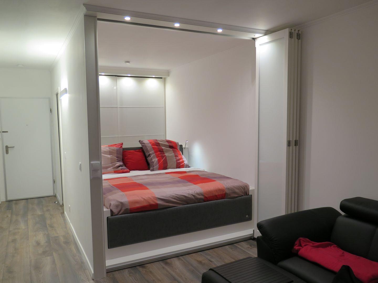 Im Schlafzimmer steht ein hochwertiges Bett (180 cm x 200 cm) mit zwei Matratzen in unterschiedlichen Härtegraden (fest und mittelfest) und ein großer Schrank (200 cm x 230 cm). Die Schlafzimmerwand zum kombinierten Wohn- und Esszimmer lässt sich durch deckenhohe, maßangefertigte Glaselemente öffnen; so ergibt sich ein schönes, großzügiges Raumgefühl. Tagsüber kann die Trennwand geschlossen werden, um beide Räume zu separieren. Das neue, weiße Bad mit dunklen Bodenfliesen ist mit 5-Eck-Dusche (90 cm x 90 cm), Duscharmatur mit Thermostat, Wand-WC und Fön ausgestattet.