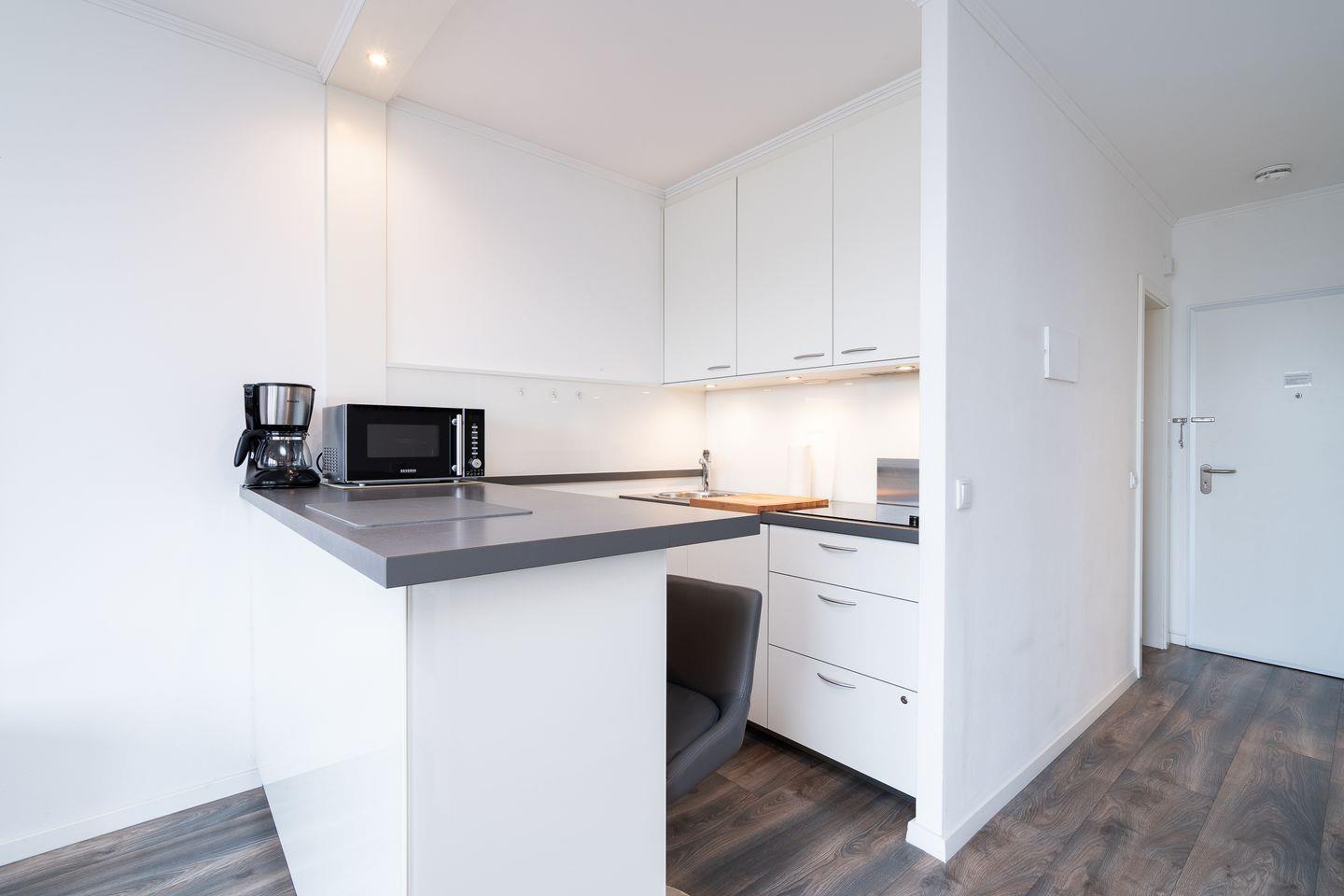 Das moderne 2-Raum-Apartment Nr. 483 im Hochparterre mit Balkon ist für 2 Personen ideal. Die offene Küche ist mit Tresen und Barhockern, sowie Spülmaschine, Backofen und Herd ausgestattet. Im Schlafzimmer steht ein großes Doppelbett, die Schlafzimmerwand zum Wohnraum lässt sich durch deckenhohe Glaselemente öffnen. Abgerundet wird das Apartment durch ein modernes Duschbad und eine insgesamt hochwertige Ausstattung. Der Strand ist in max. 5 Gehmin. zu erreichen.
