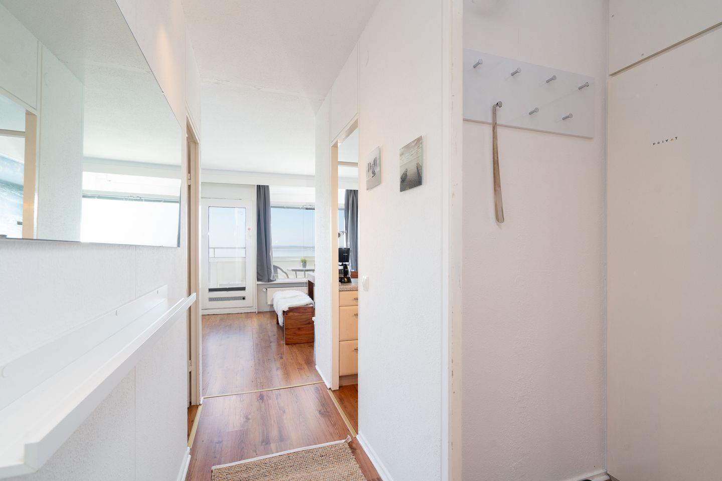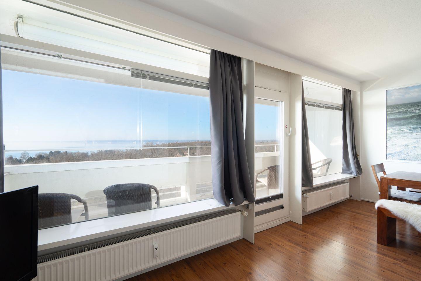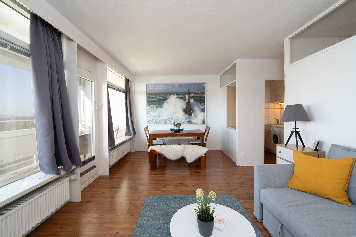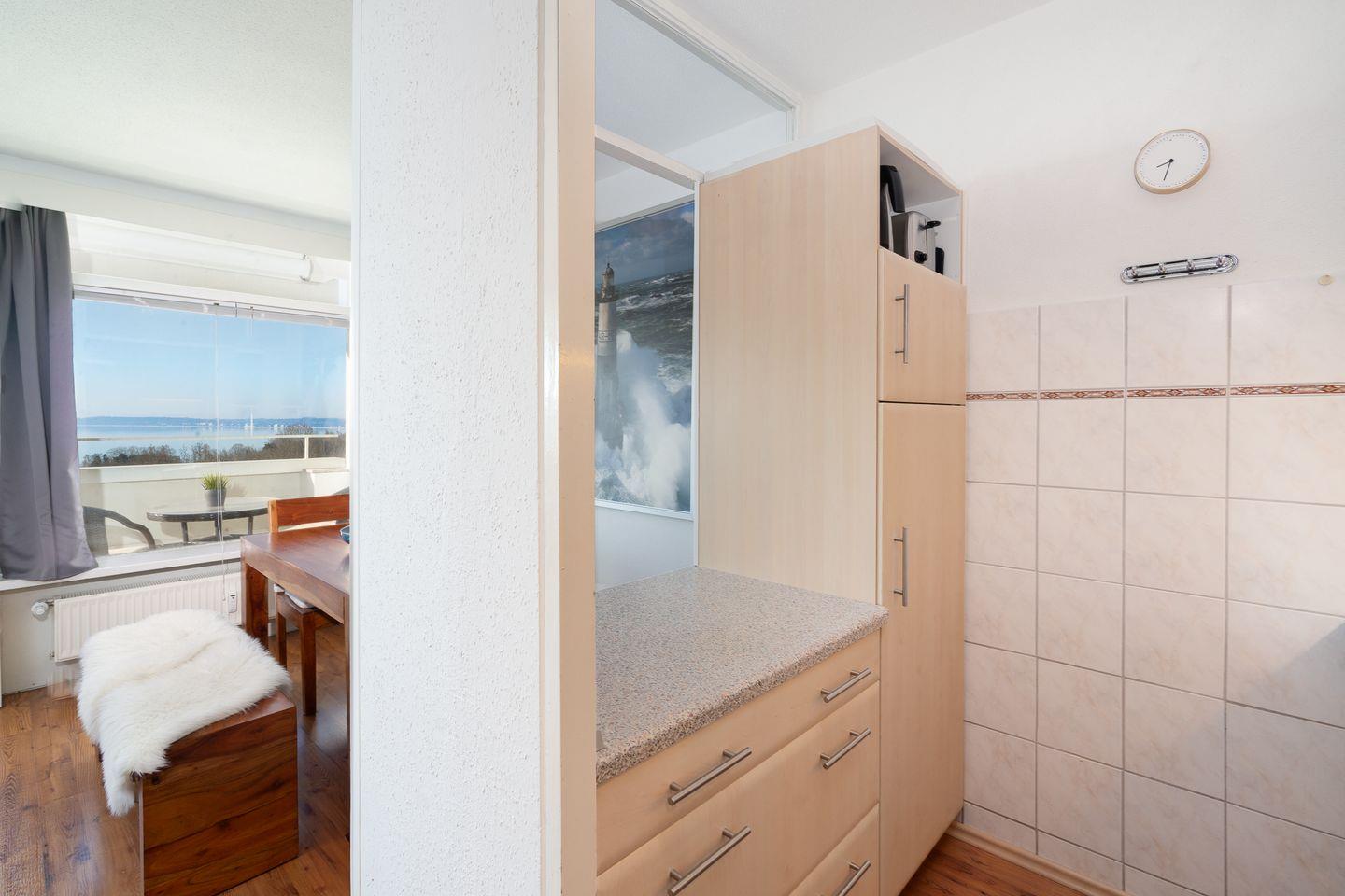 diese 2-Raum-Ferienwohnung liegt in sonniger Südlage in der 7. Etage. Vom Balkon können Sie einen schönen Ostseeblick über die Lübecker Bucht genießen. Die kleine Küche ist mit einer Durchreiche zum kombinierten Wohn- und Essbereich hin offen und mit Backofen, Herd und einer Waschmaschine ausgestattet. Im innenliegenden Schlafraum steht ein Boxspringbett (160 cm x 200 cm) und ein Kleiderschrank. Auf der Schlafcouch (140 cm x 200 cm) könnte eine weitere Person schlafen. Das moderne, hell geflieste Duschbad ist innenliegend. Zum Strand sind es nur wenige Gehminuten. PKW-Stellplatz inklusive.