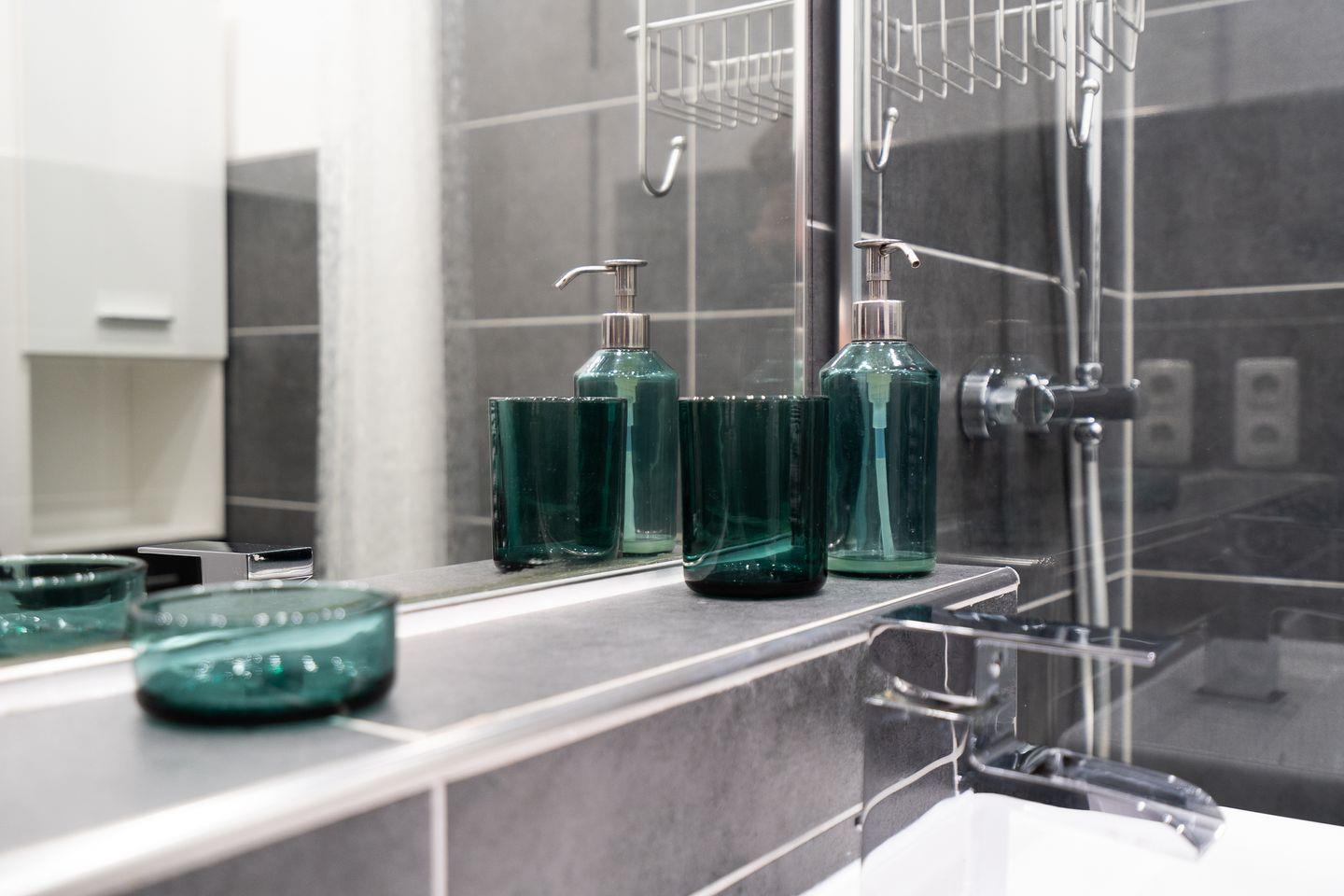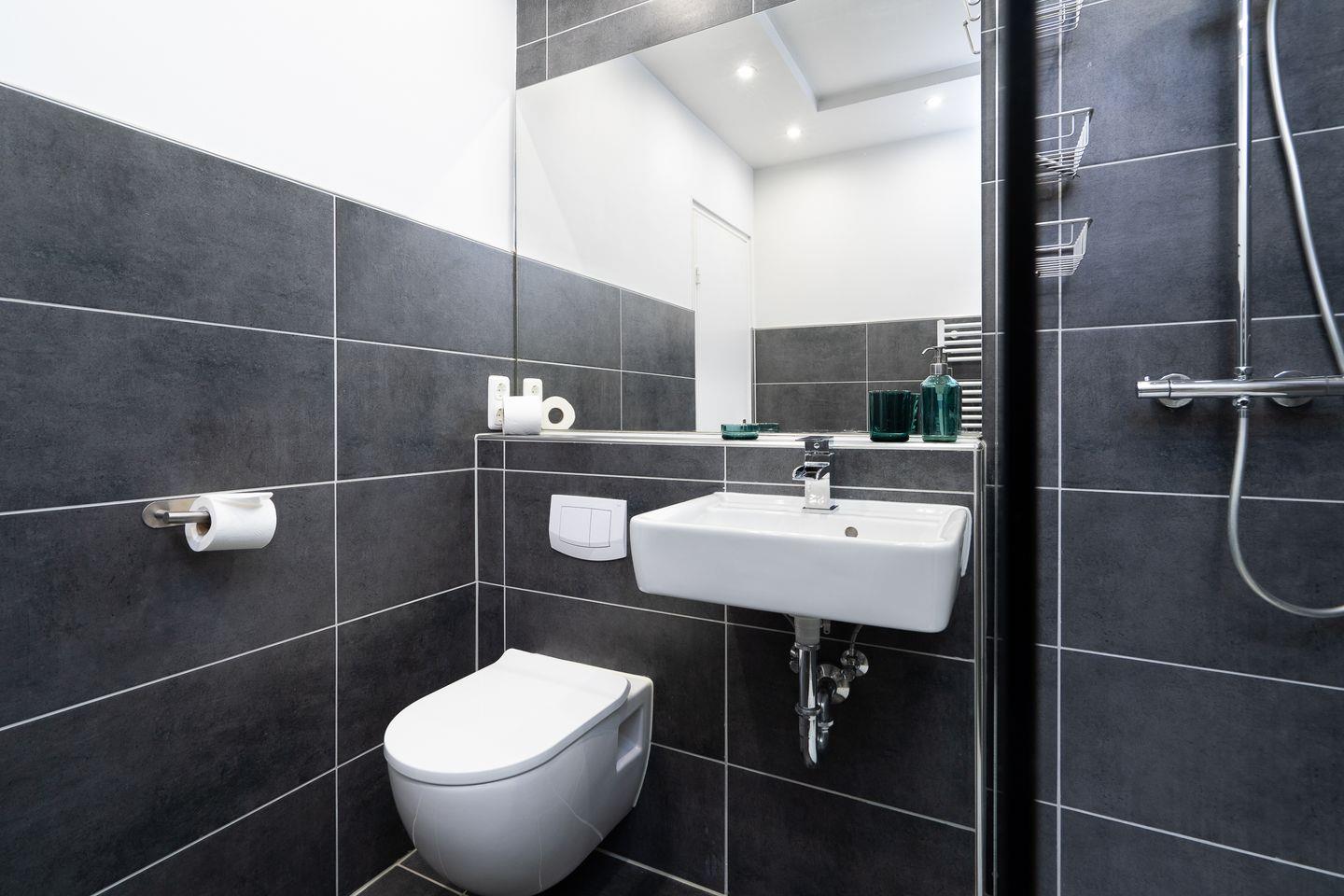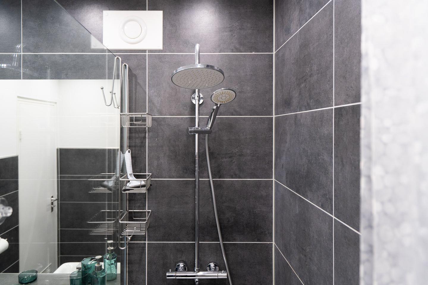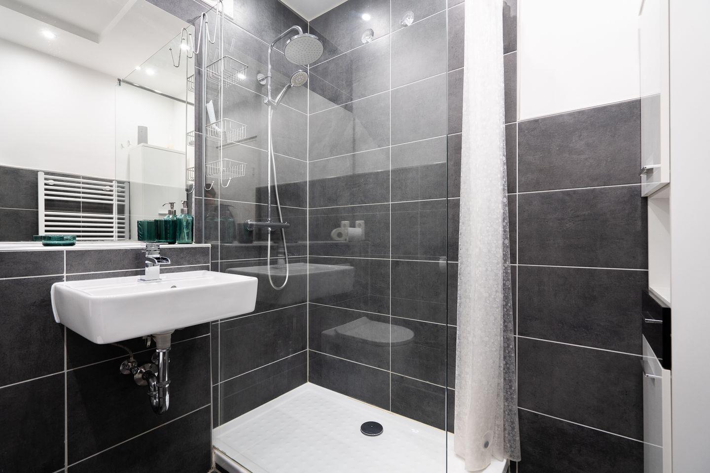 Das moderne Badezimmer ist mit einer großen Dusche ausgestattet.