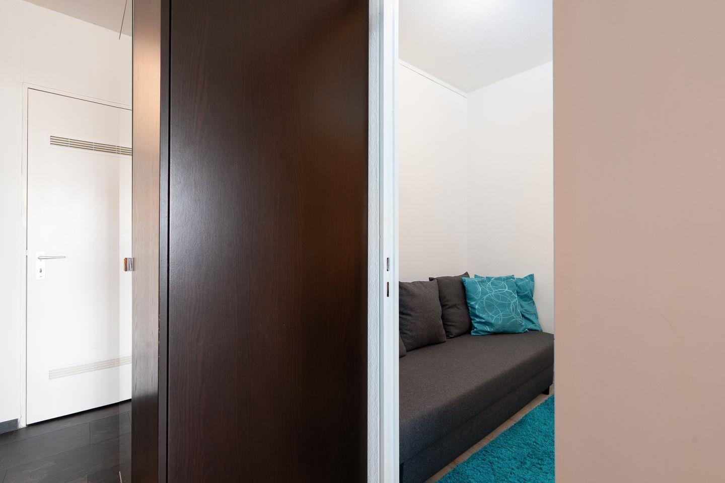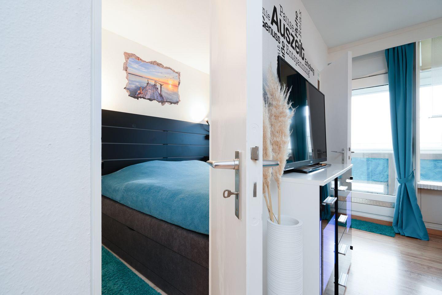 Das Schlafzimmer ist klein, jedoch sind beide Bettseiten durch die jeweils vorhandenen Zimmertüren einfach zu erreichen. Das (1,80 m breite und 2 m lange) hohe Boxspringbett bietet einen komfortablen Schlafbereich. Fernsehschauen macht so auch im Bett Spaß.