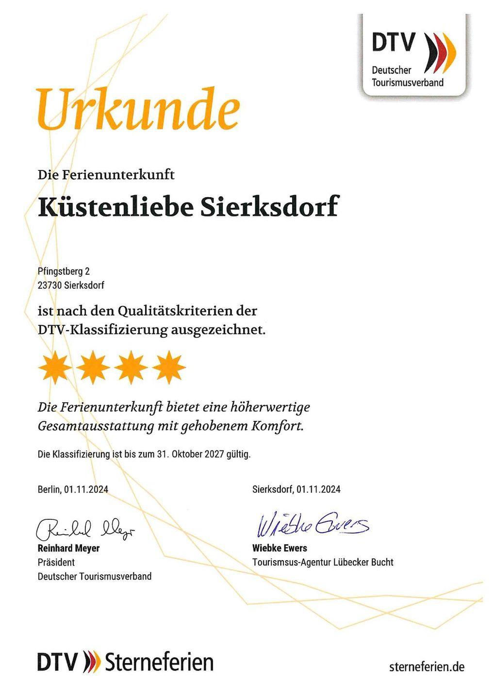 Die Wohnung ist offiziell vom Deutschen Tourismusverband (DTV) mit **** klassifiziert.