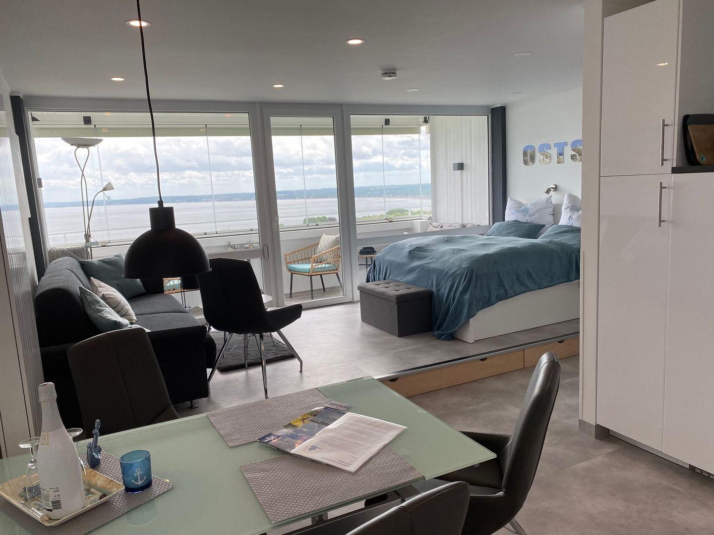 Einraum-Wohnung 45qm, verglaster Balkon, Top-Einrichtung, direkter Meerblick - auch vom Bett (kein separates Schlafzimmer)