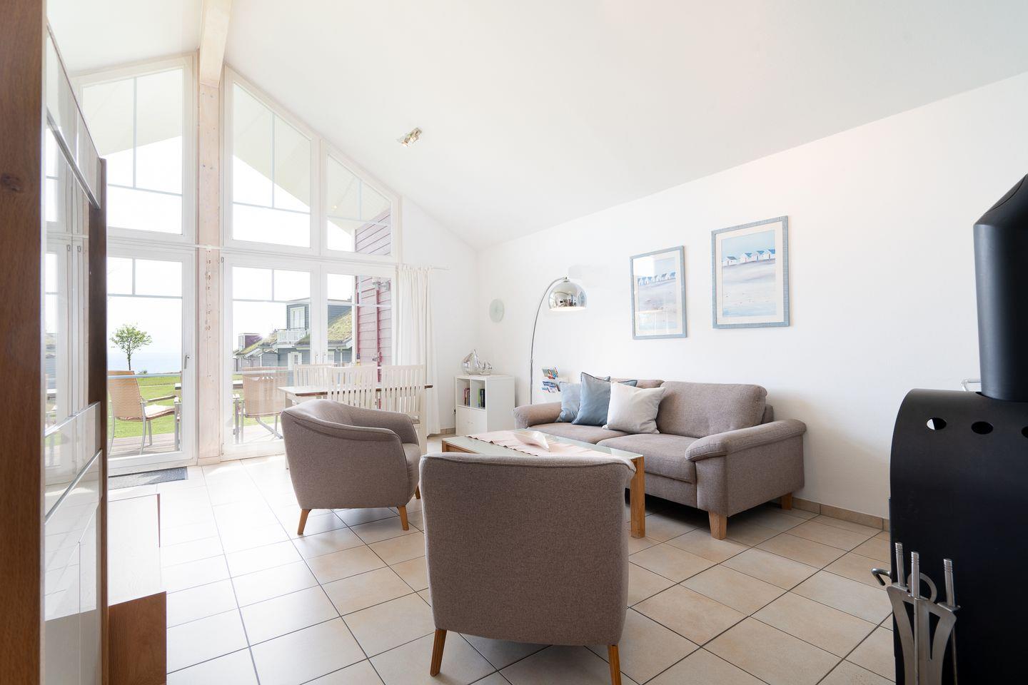 Auf 70 qm stehen Ihnen auf einer Ebene zwei Schlafräume und ein geräumiger Wohn- und Essraum mit Kamin und Zugang zur Terrasse mit Meerblick zur Verfügung. Die zum Essbereich hin offene, moderne Küche ist mit Geschirrspülmaschine, Herd und Mikrowelle voll ausgestattet. Der Kaminofen sorgt für gemütliche Stunden mit Freunden und Familie. Im ersten Schlafraum steht ein Doppelbett (2x 90 x 200 cm), im zweiten Schlafraum zwei Einzelbetten (jeweils 90 x 200 cm). Im Bad finden Sie die Sauna, Waschmaschine, sowie eine Dusche. Der Komfort einer eigenen Sauna wird sehr von unseren Wintergästen geschätzt.