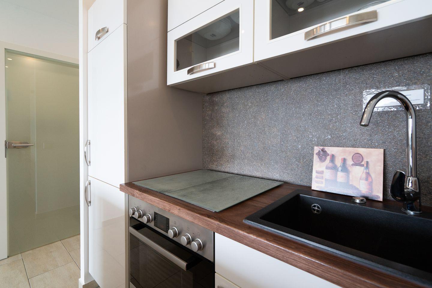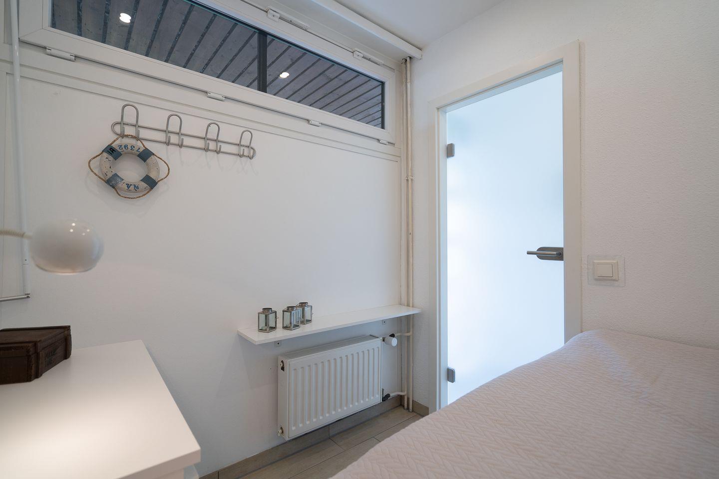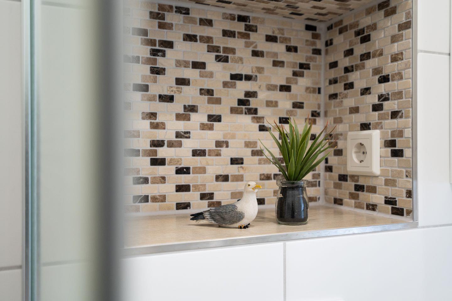 Das Badezimmer ist mit einer Regendusche und bodengleichem Einstieg sowie mit einem Handtuchheizkörper ausgestattet. Die moderne Einbauküche verfügt über einen Kühlschrank mit Gefrierschrank, Mikrowelle, Backofen mit Ceranfeld, Spülmaschine, einer Senseo-Kaffeemaschine, Wasserkocher, Toaster u.v.m. Die Wohnung bietet aufgrund von reichlich Schrankplatz, auch für einen längeren Aufenthalt großzügigen Stauraum; Münzwaschmaschinen und -trockner stehen im Gebäude zur Verfügung.