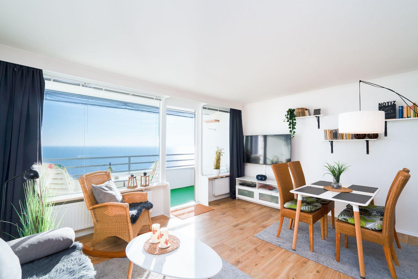 Diese helle und schöne 2-Raum-Ferienwohnung ist ein wunderbares Feriendomizil. Vom Balkon haben Sie einen herrlichen Blick auf die Ostsee. Die Küche ist mit Spülmaschine, Backofen und Herd ausgestattet und mit einer Durchreiche zum gemütlichen Wohn-/Essbereich hin offen. Der Schlafraum hat ein Doppelbett, ein zusätzliches TV-Gerät und ein Fenster mit Meerblick. Im Wohnbereich steht zum ein Schlafsofa. Das Duschbad ist innenliegend. Zum Strand sind es nur wenige Fußschritte. WLAN inklusive.