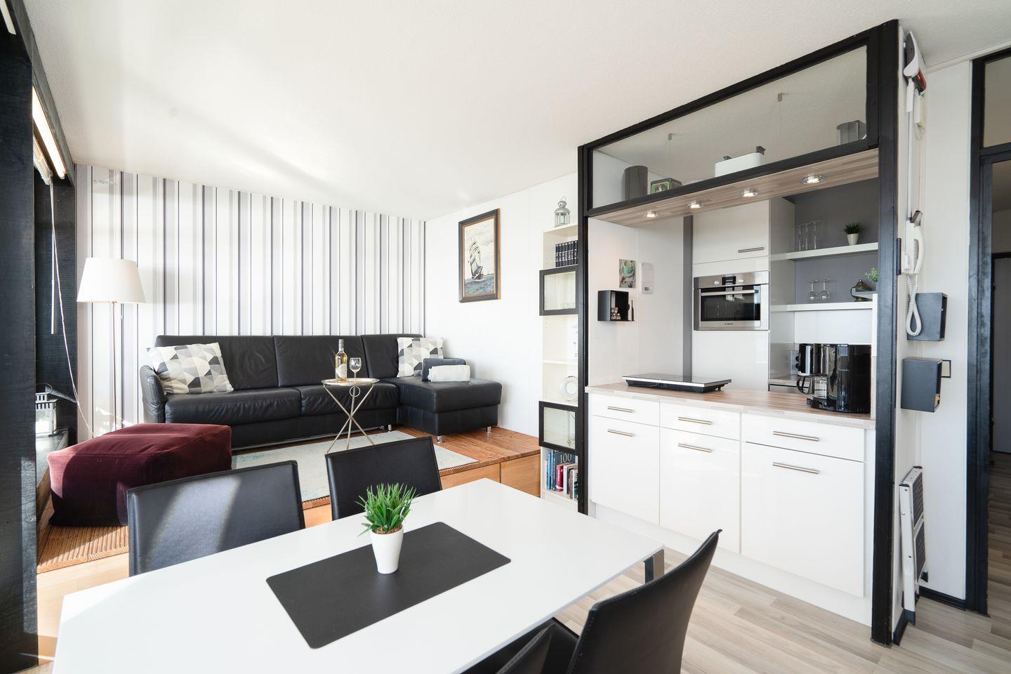 Die Ferienwohnung A14-07 liegt im 14. Stock der Panoramic-Anlage, ist für zwei Personen geeignet und hat einen wunderbaren Weitblick auf die Lübecker Bucht. Der in schwarz-weiß Tönen gehaltene Wohn- und Essbereich verfügt über eine gemütliche Sofaecke, die auf einem Podest erhöht steht. Die offene Küche ist mit Spülmaschine, Backofen und Herd ausgestattet. Im Schlafraum steht ein bequemes Doppelbett. Das moderne Bad ist innenliegend. Zum Strand sind es nur wenige Gehminuten. WLAN inklusive.