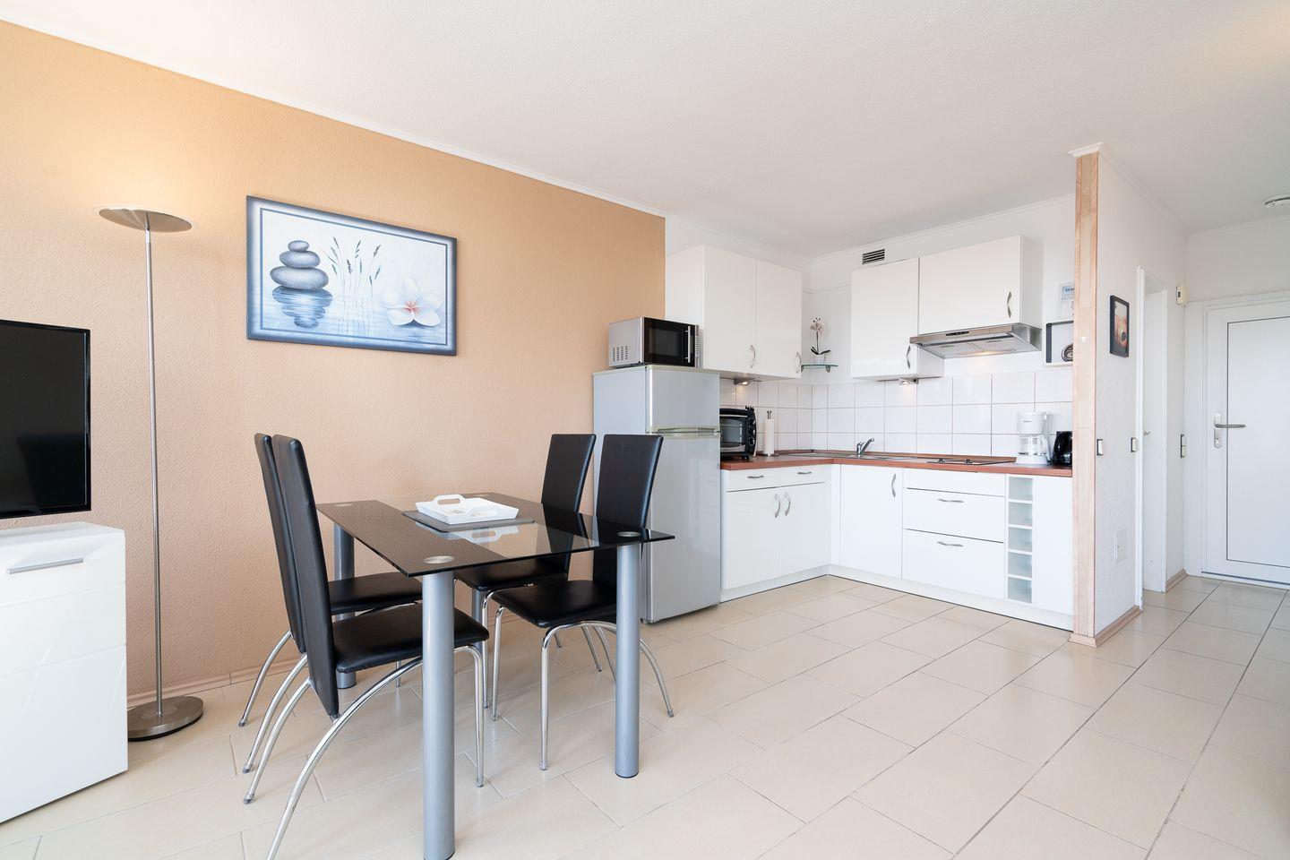 Die helle 1-Raum-Ferienwohnung liegt in der 4. Etage, vom Balkon blicken Sie über die Anlage hinweg in die Lübecker Bucht. Die Küche mit Backofen, Herd und Mikrowelle ist in den kombinierten Wohn- und Essbereich integriert. Der Schlafbereich mit Doppelbett (140 x 200 cm) lässt sich durch ein Schiebeelement vom Wohn- und Essbereich abtrennen. Im Wohnbereich steht zudem ein Schlafsofa (130 x 200 cm), so dass die Wohnung für vier Personen geeignet ist. Das hell geflieste Duschbad ist innenliegend. Zum Strand sind es nur wenige Fußschritte. PKW-Stellplatz inklusive.