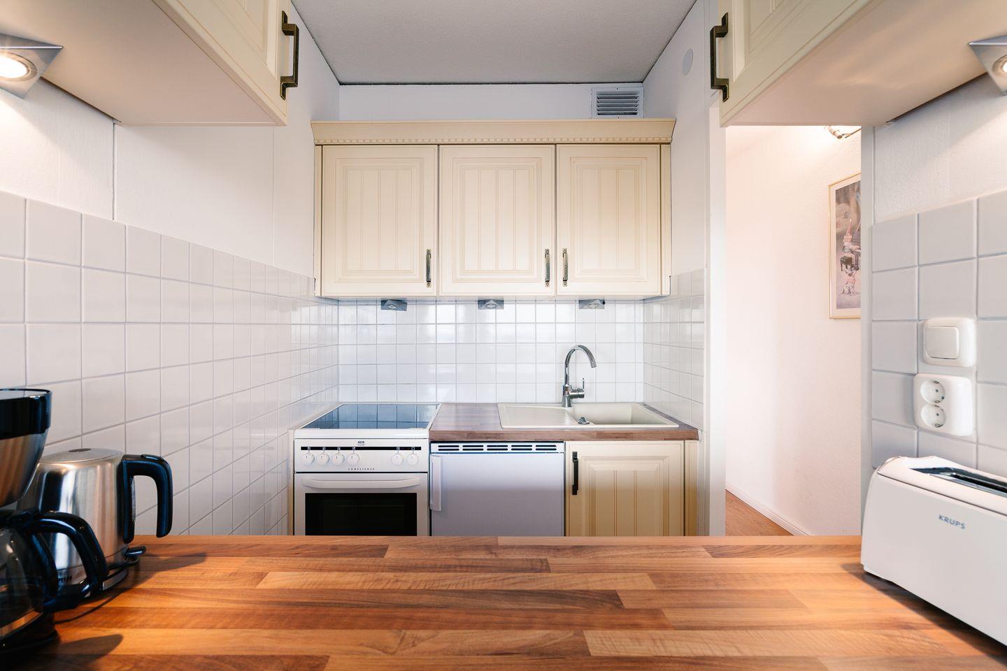 Die voll ausgestattete Küche überzeugt mit allem was man zur Selbstverpflegung braucht, wie Kühlschrank mit separatem Gefrierfach, Kochfeld, Backofen, Kaffeemaschine, Toaster und Wasserkocher.